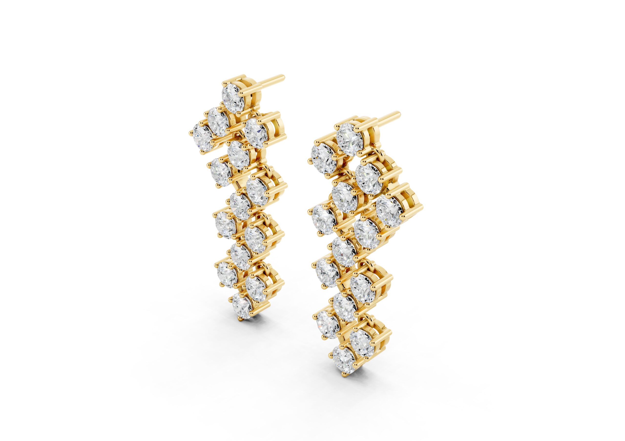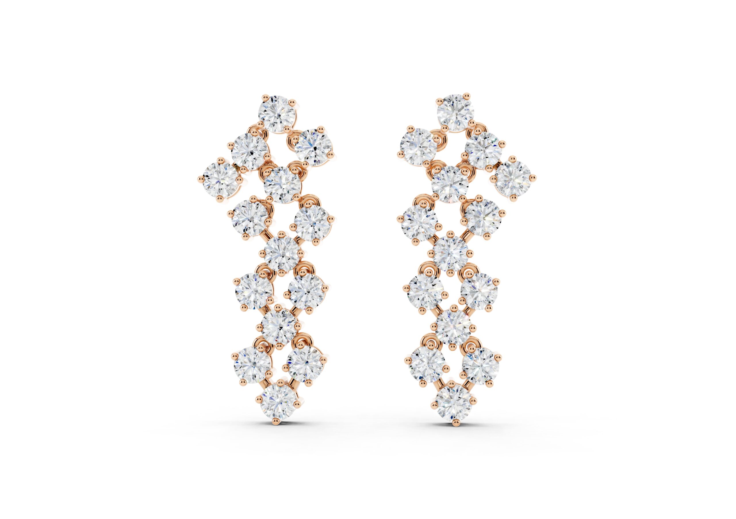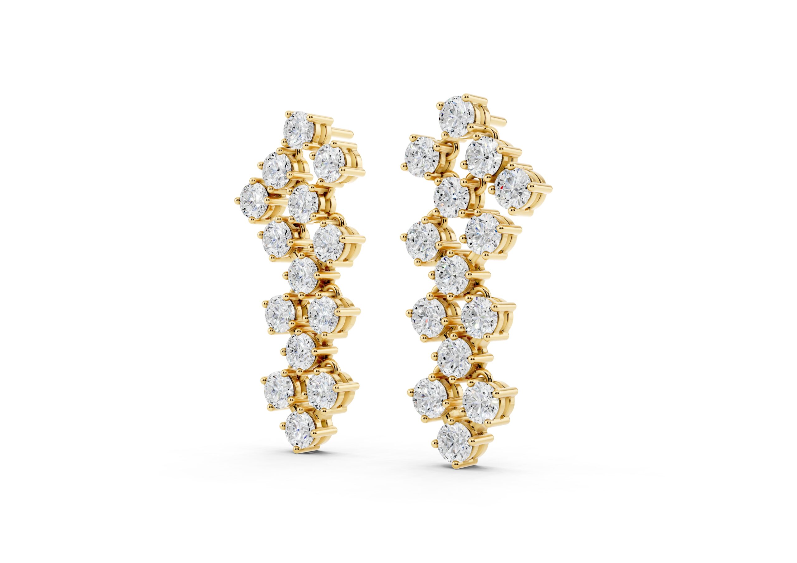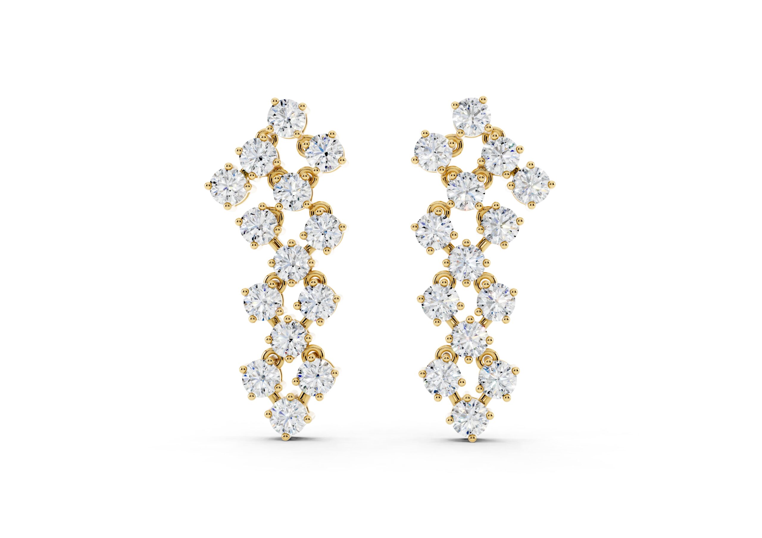 A sculptural pair of earrings featuring a rhythmic arrangement of round clusters, flowing gently in a staggered curve. Their graceful silhouette and layered sparkle create a striking yet refined look, perfect for evenings that call for elegance.