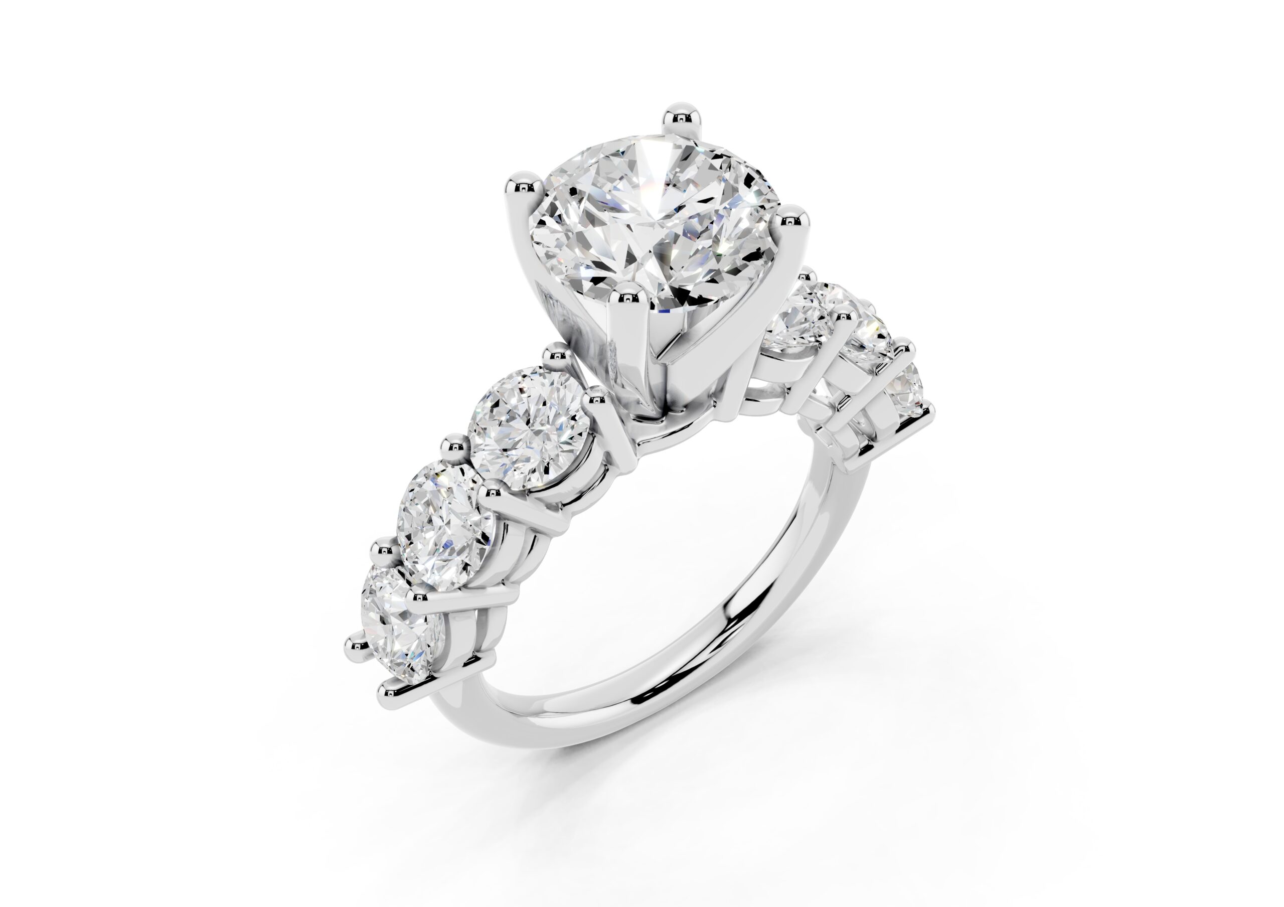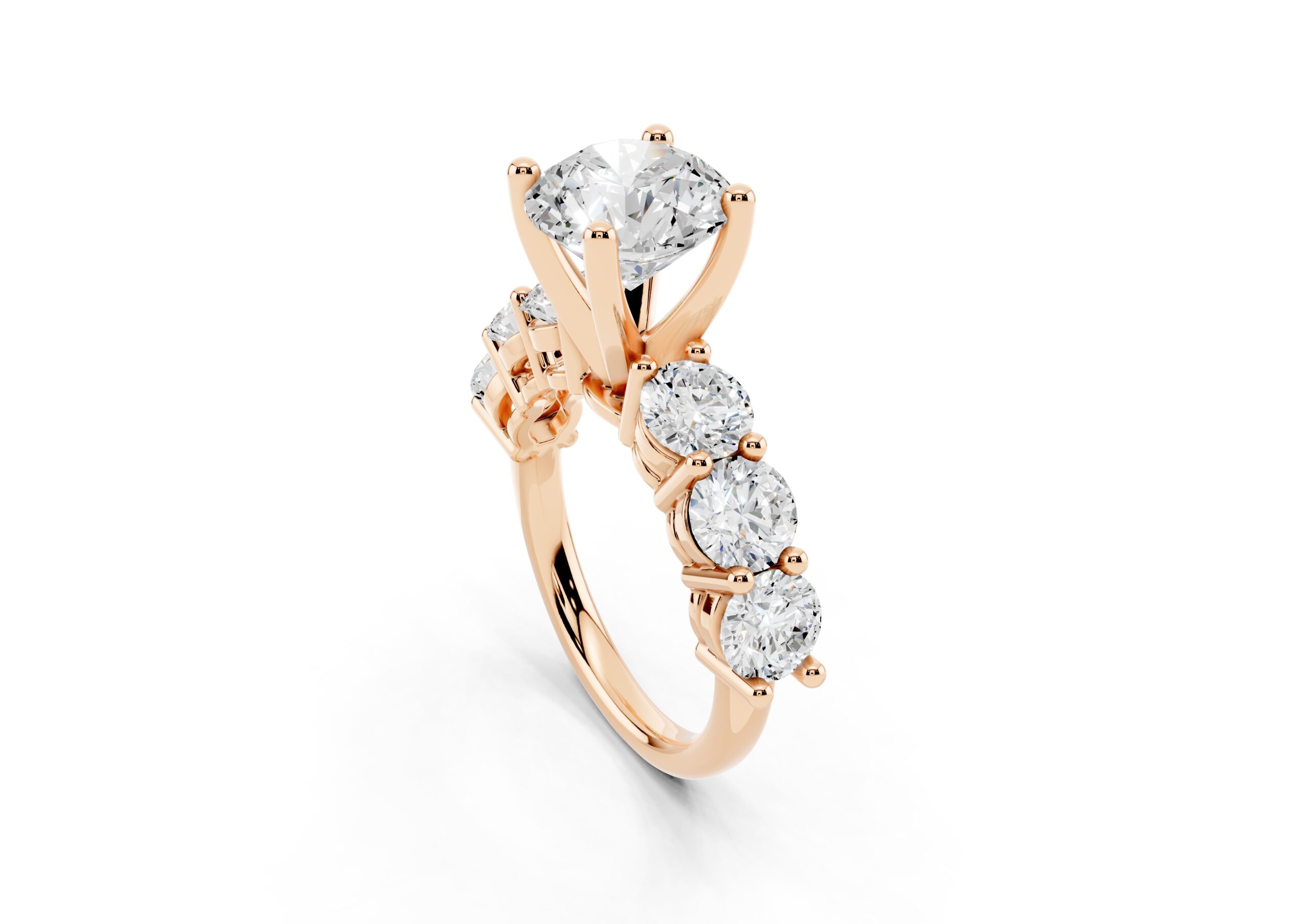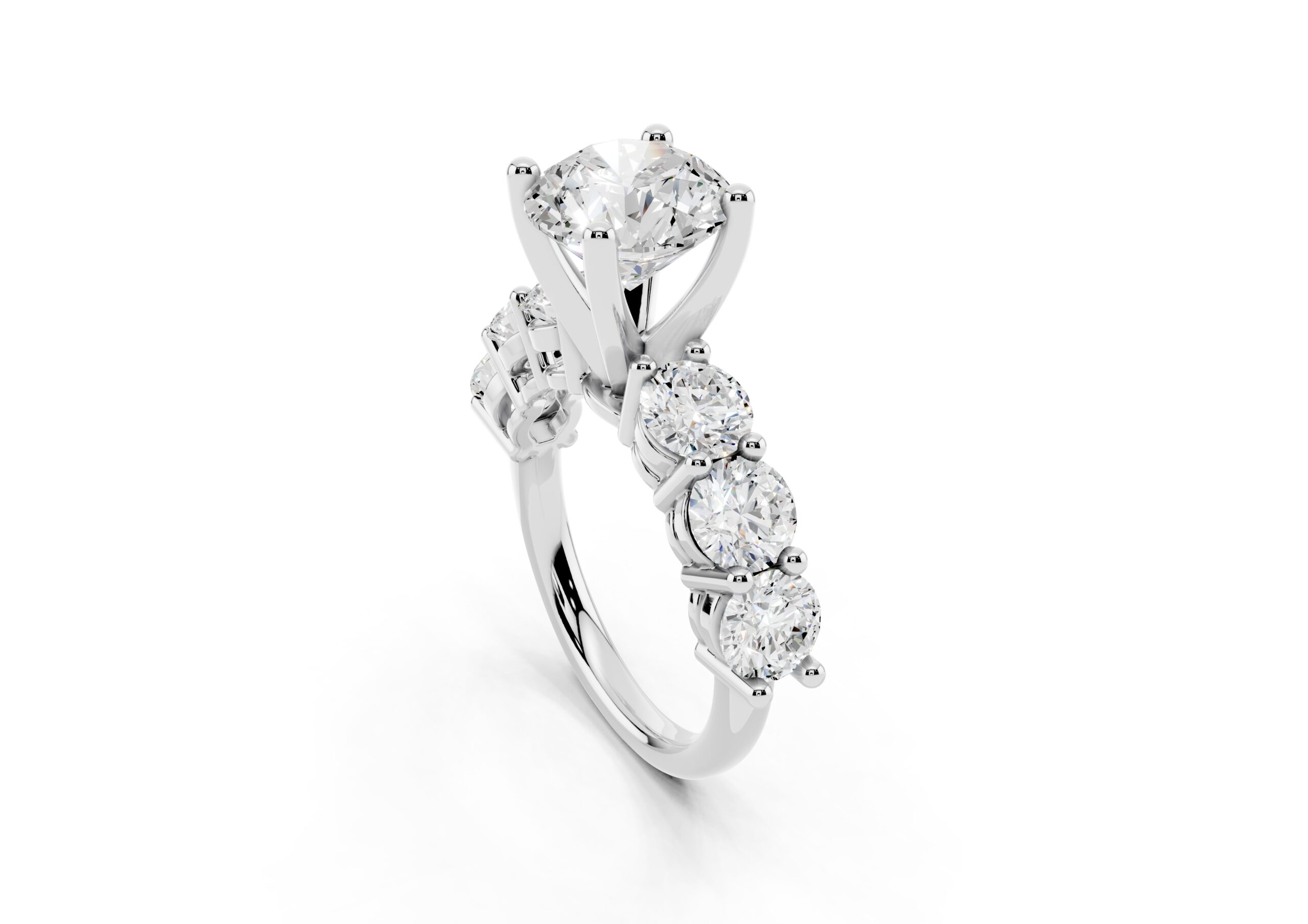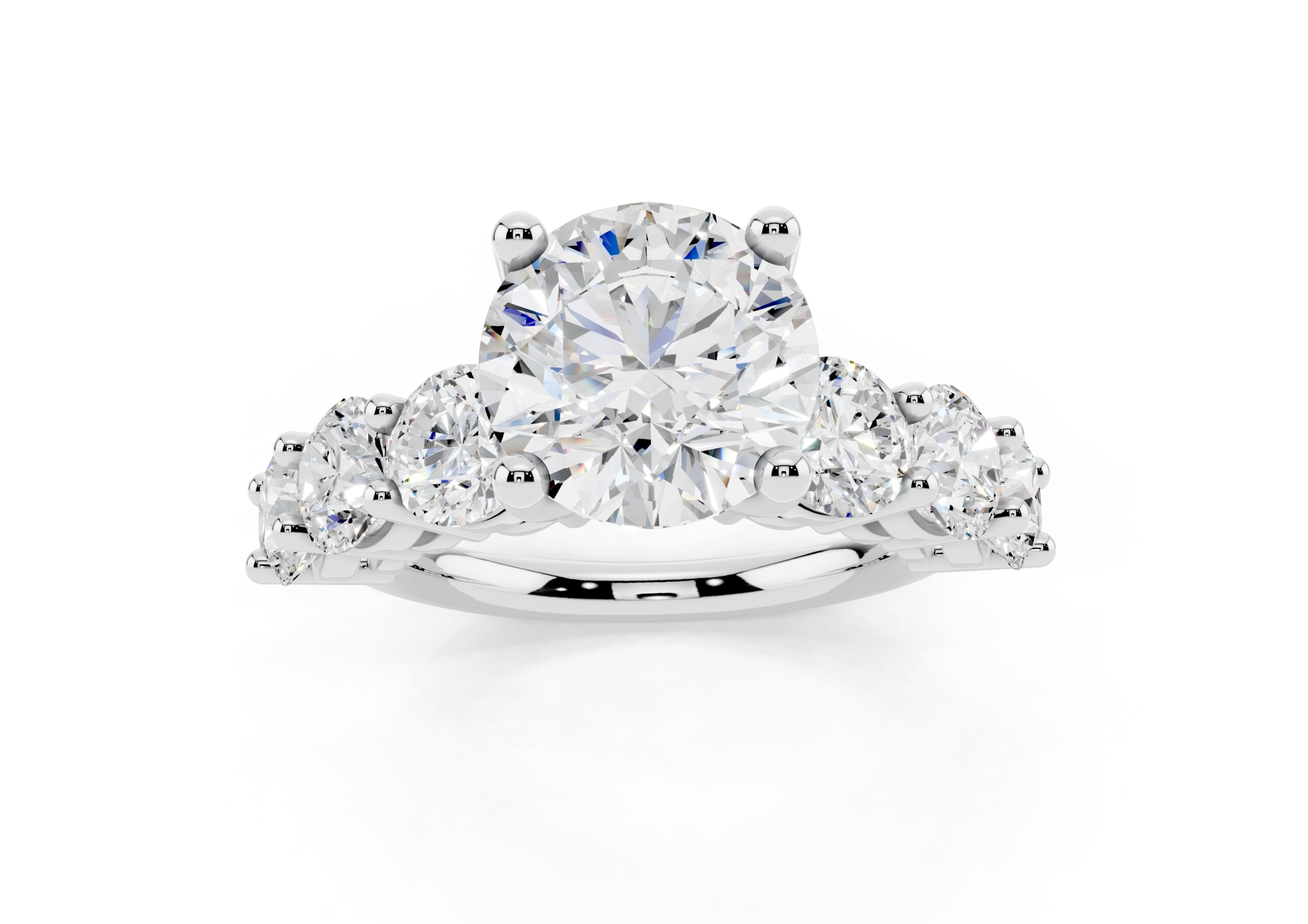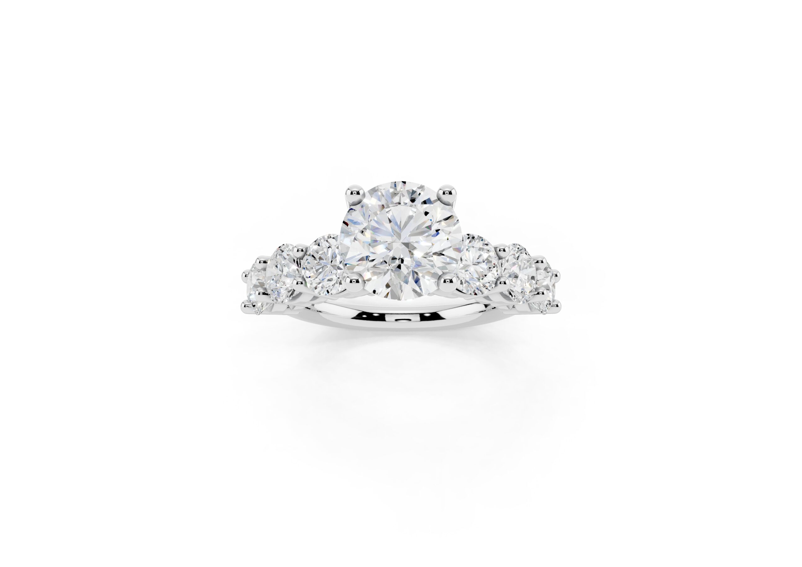 A timeless design featuring a bold, round-cut center stone flanked by a graduated arrangement of smaller stones. The classic setting enhances the brilliance of each stone, creating a harmonious blend of size, symmetry, and sparkle—perfect for those who appreciate elegance with a hint of grandeur.