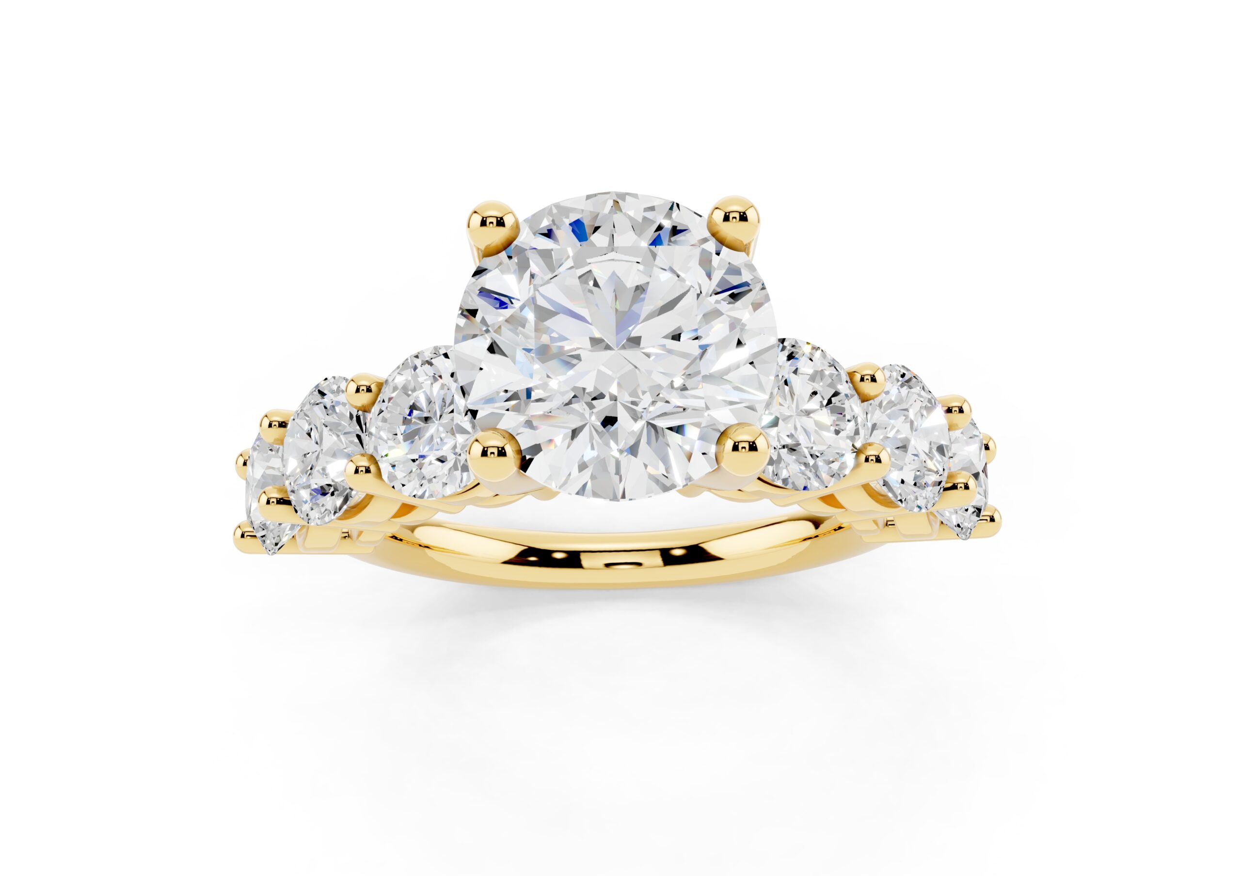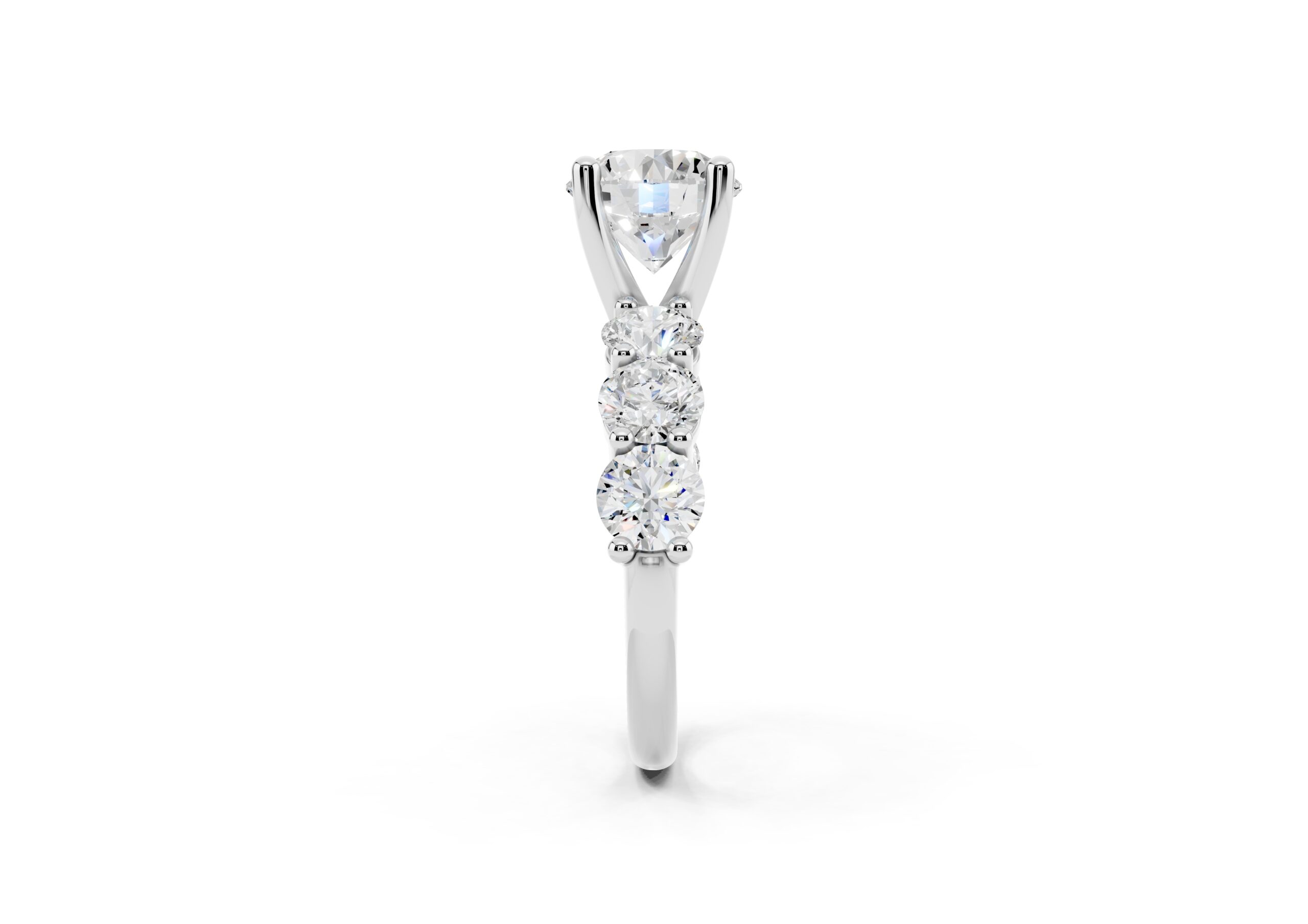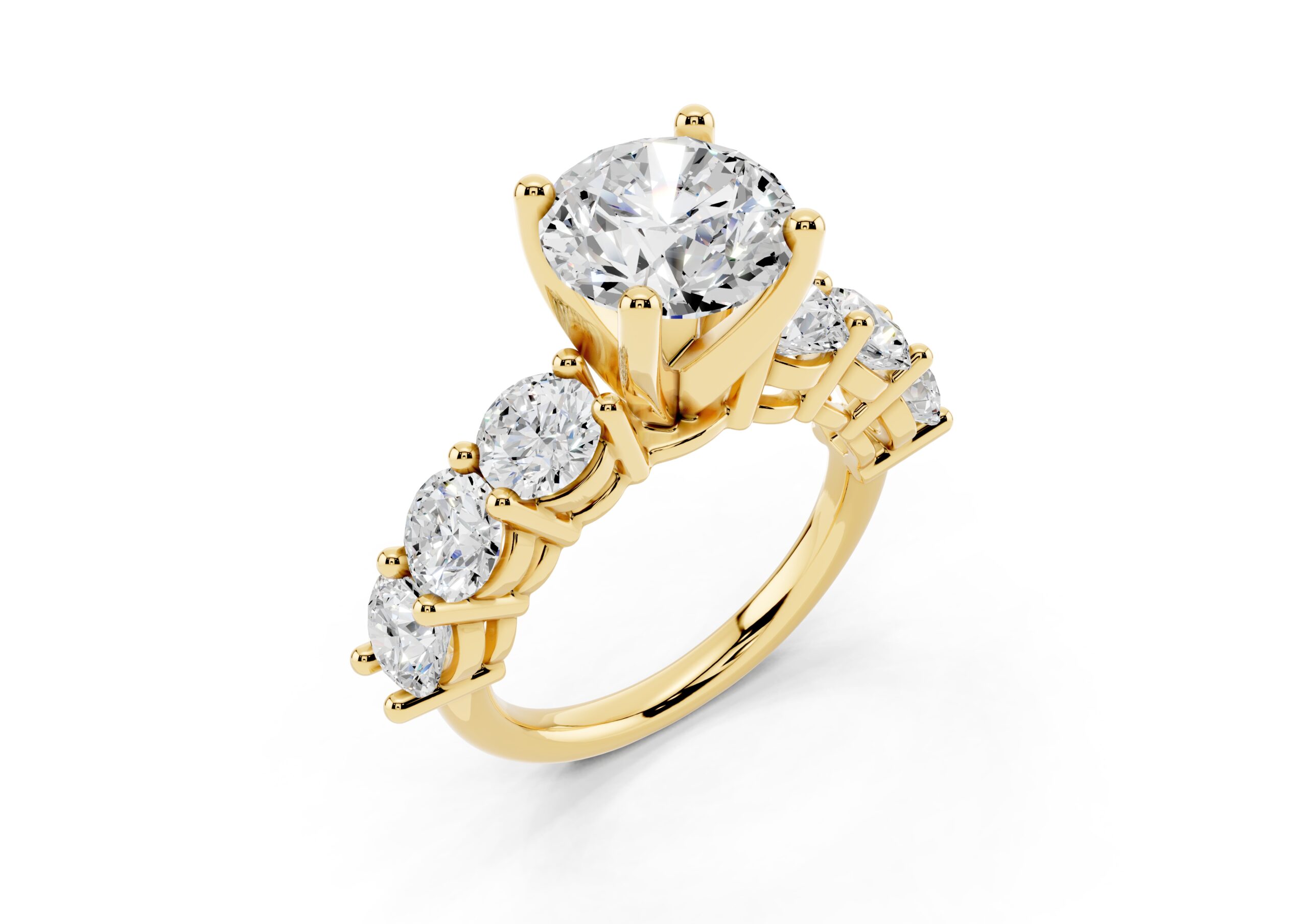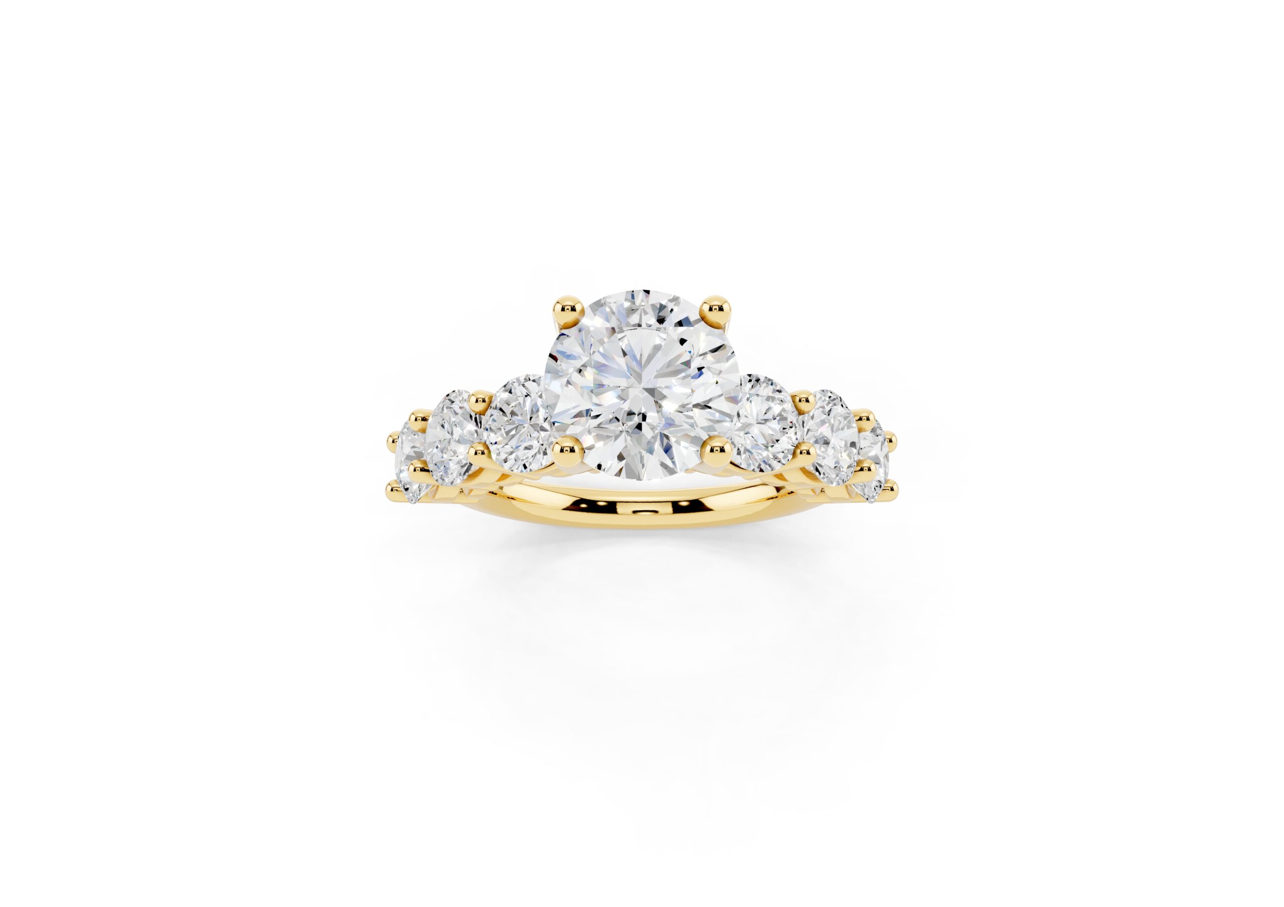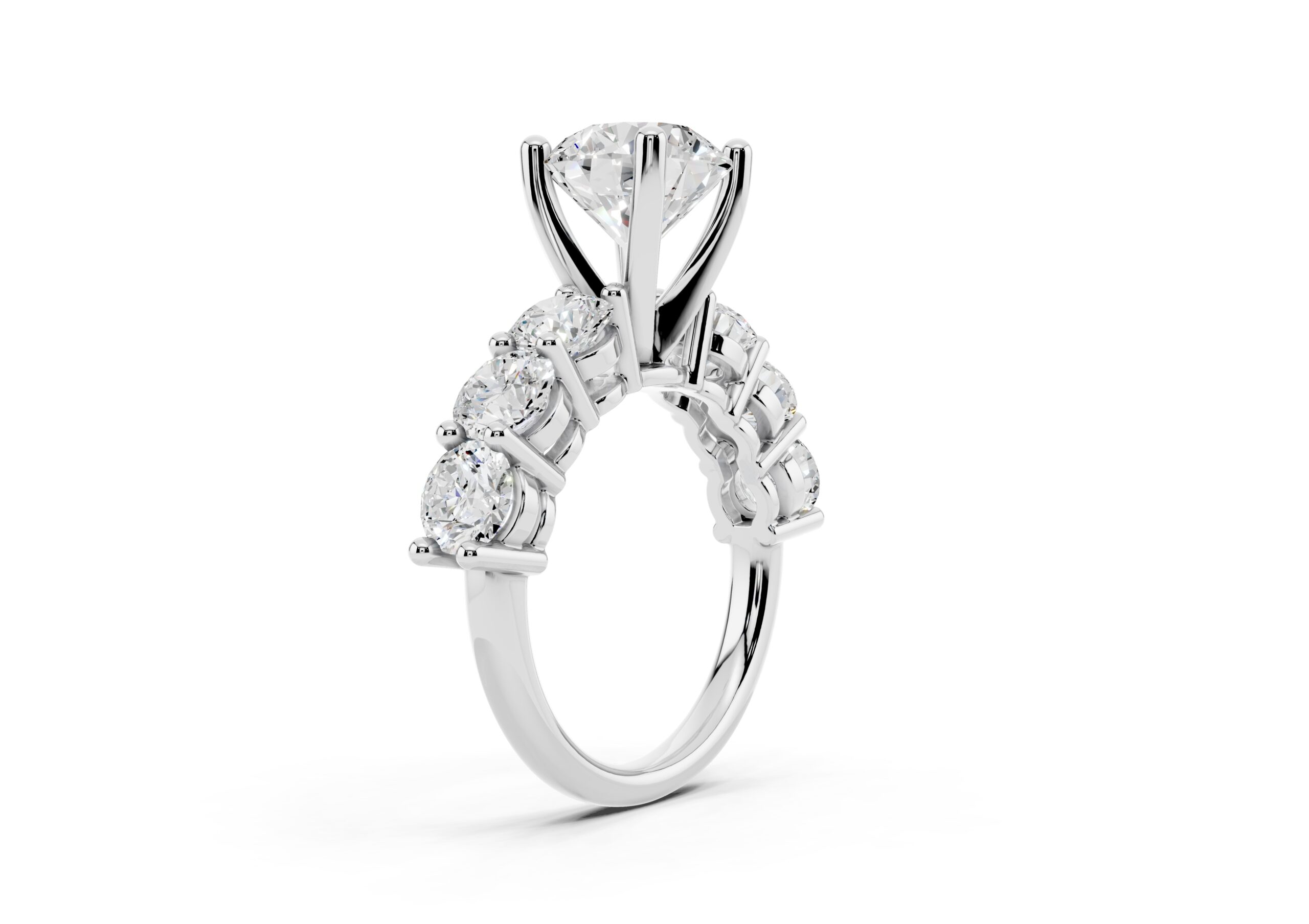 A timeless design featuring a bold, round-cut center stone flanked by a graduated arrangement of smaller stones. The classic setting enhances the brilliance of each stone, creating a harmonious blend of size, symmetry, and sparkle—perfect for those who appreciate elegance with a hint of grandeur.