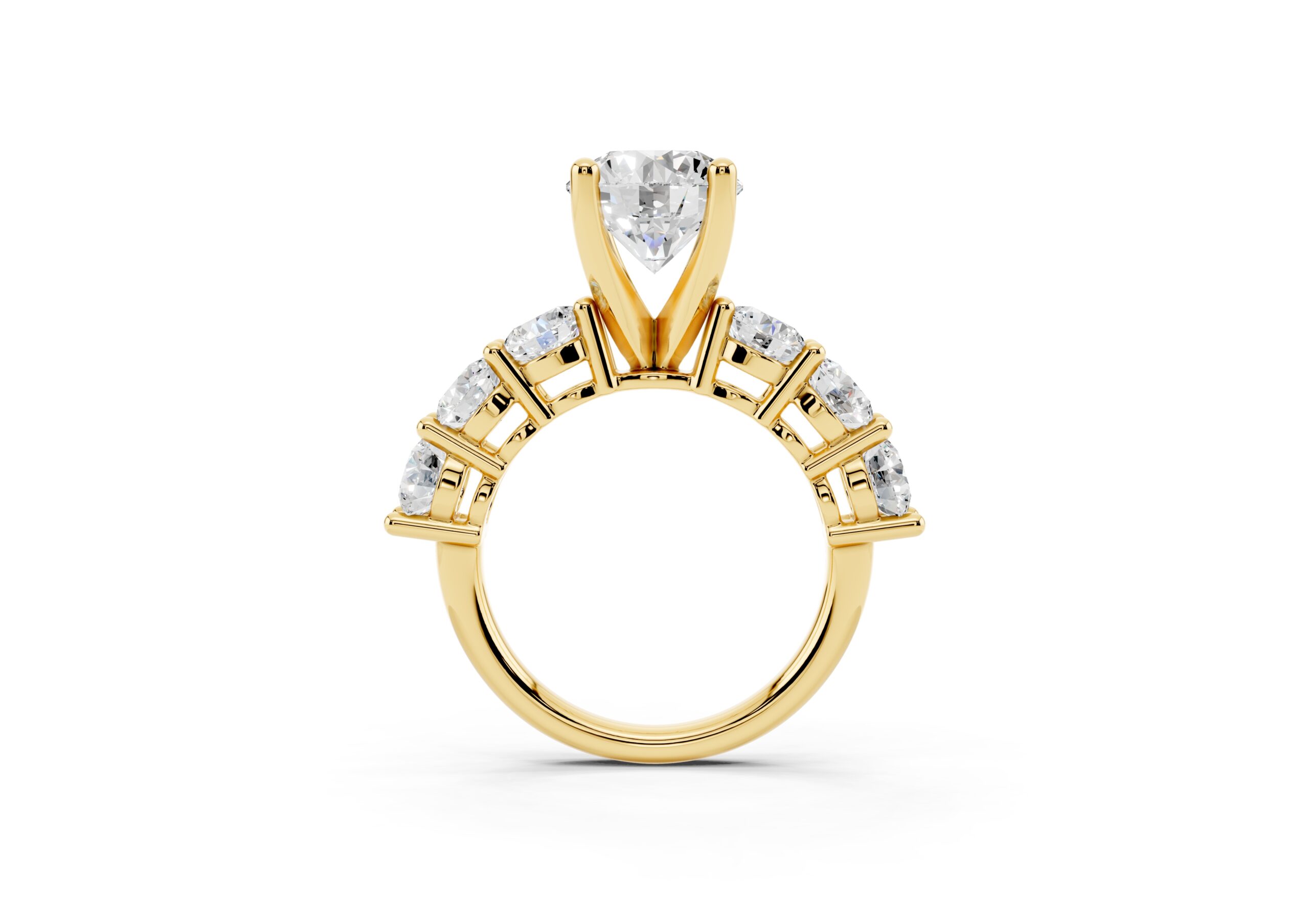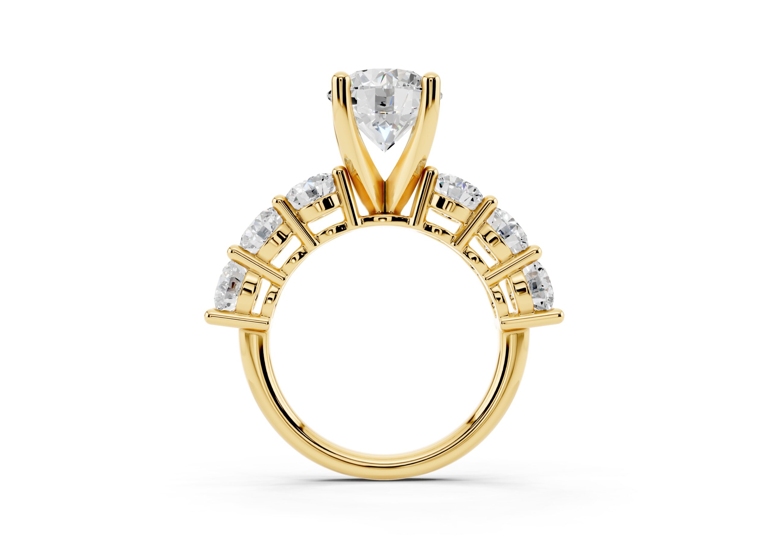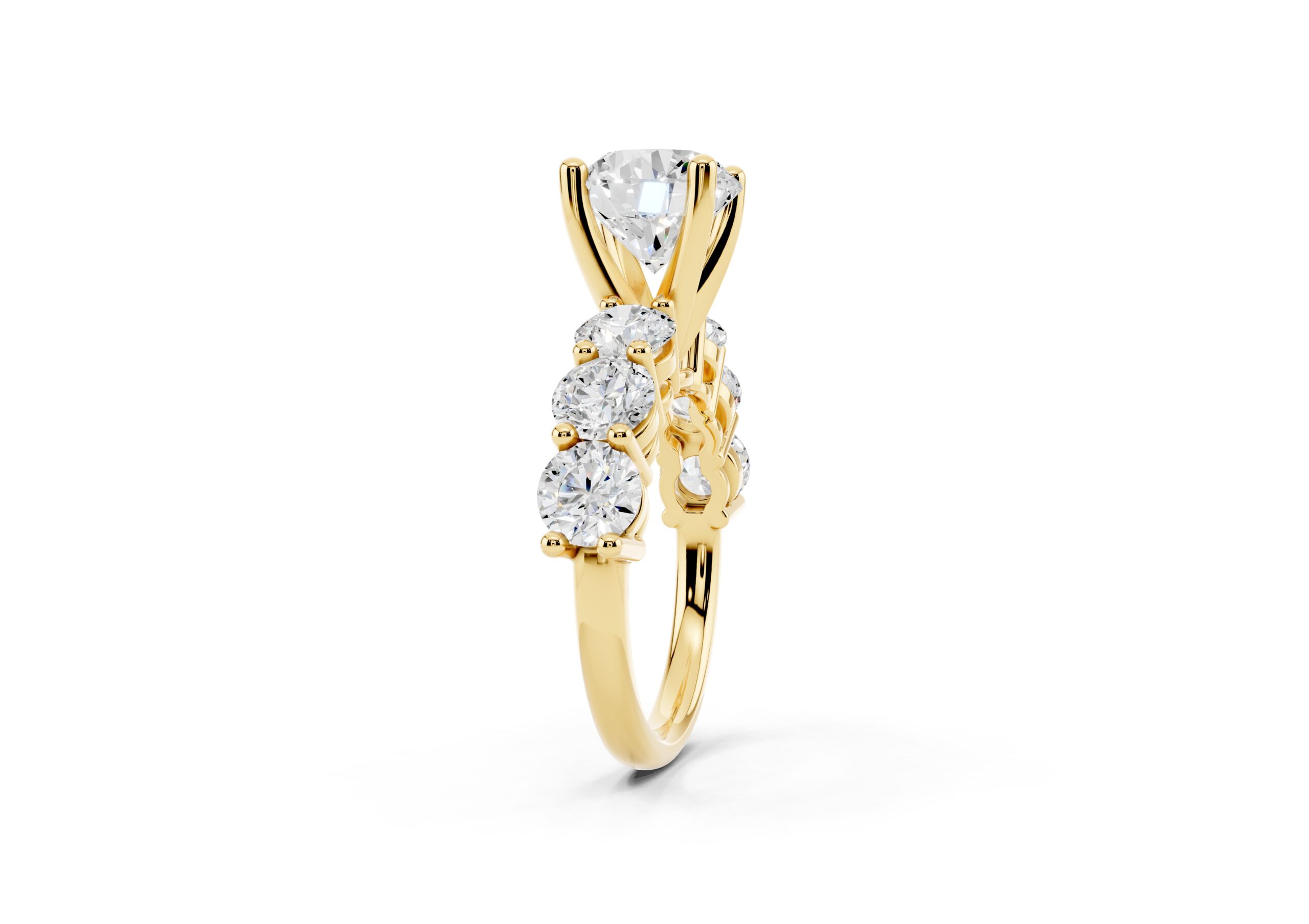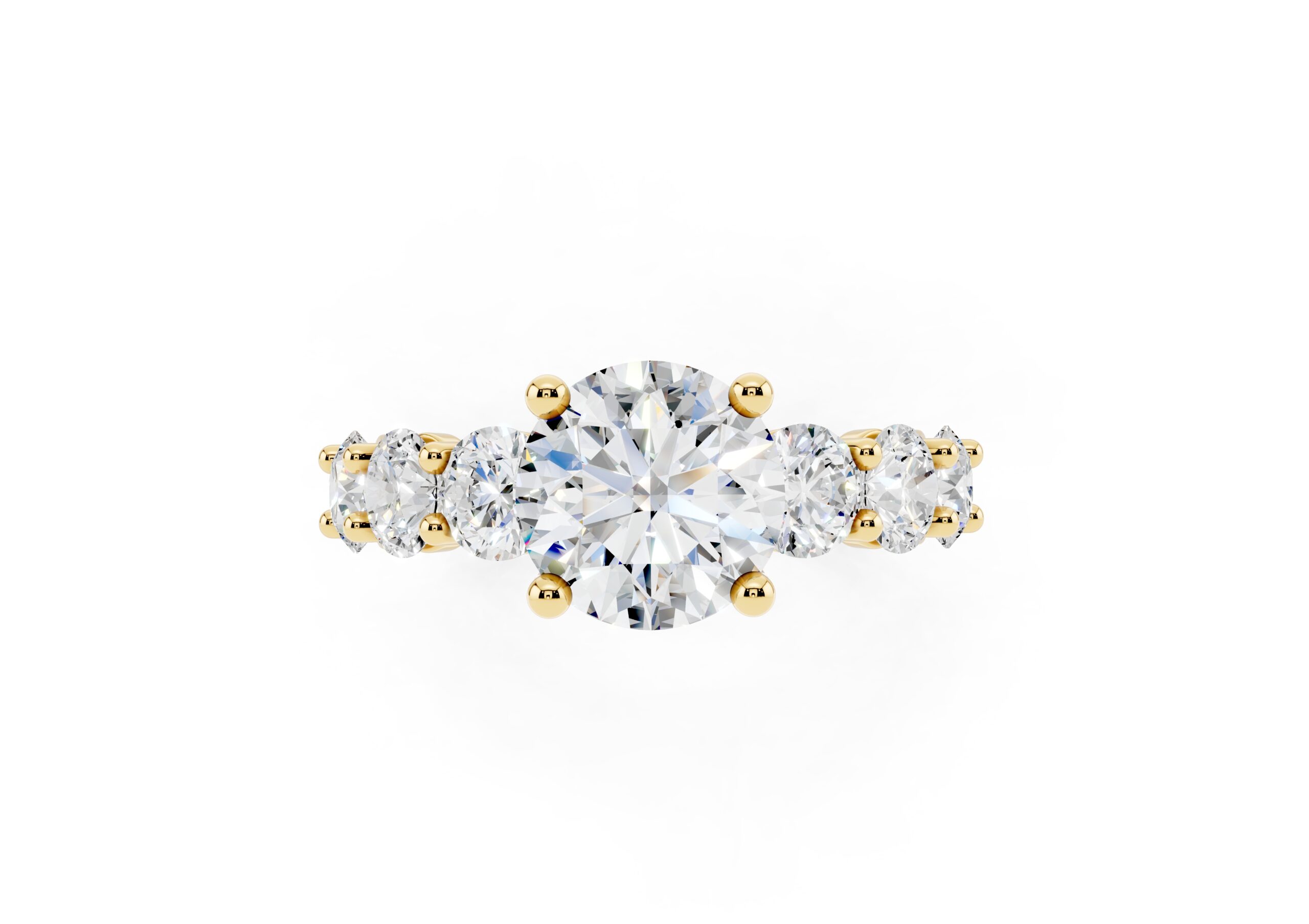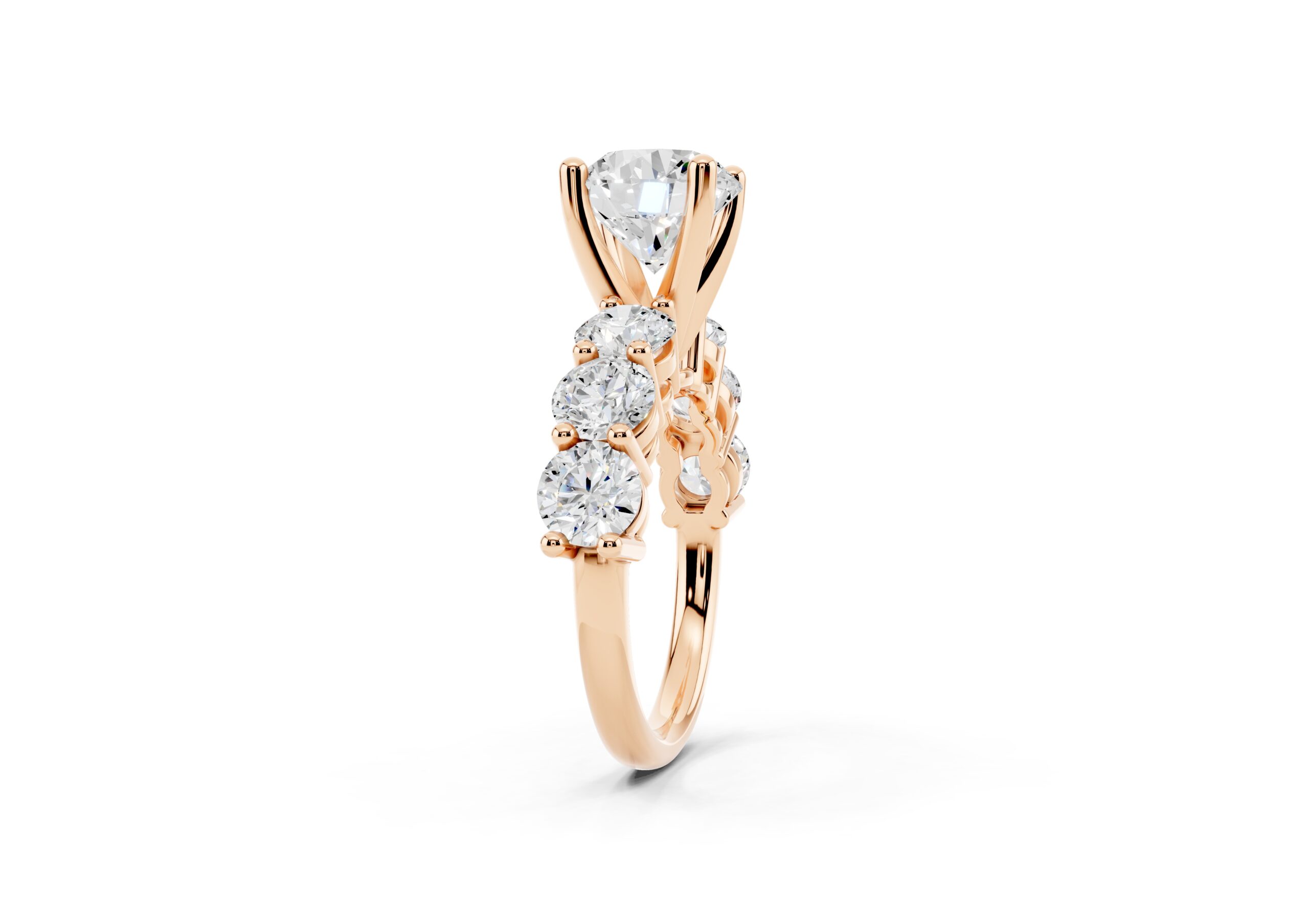 A timeless design featuring a bold, round-cut center stone flanked by a graduated arrangement of smaller stones. The classic setting enhances the brilliance of each stone, creating a harmonious blend of size, symmetry, and sparkle—perfect for those who appreciate elegance with a hint of grandeur.