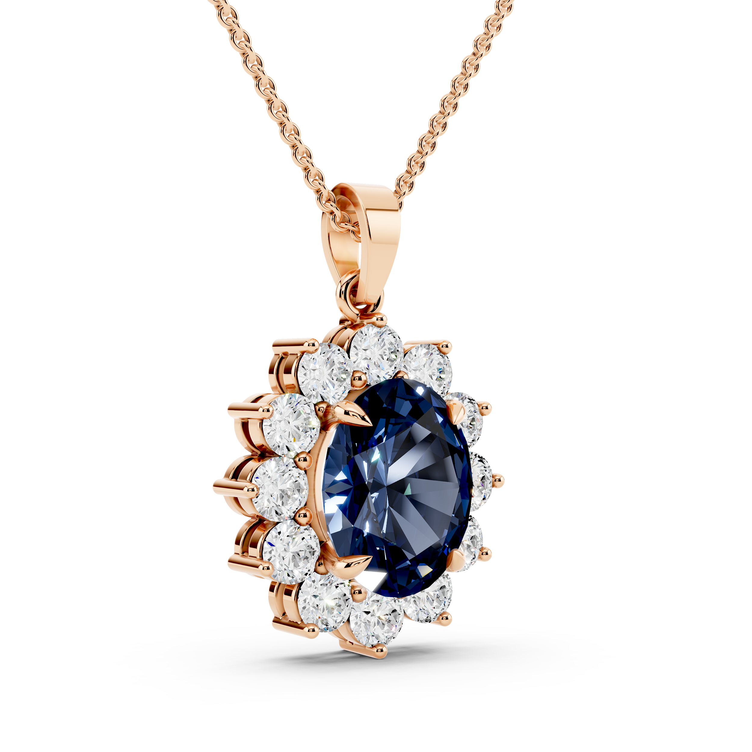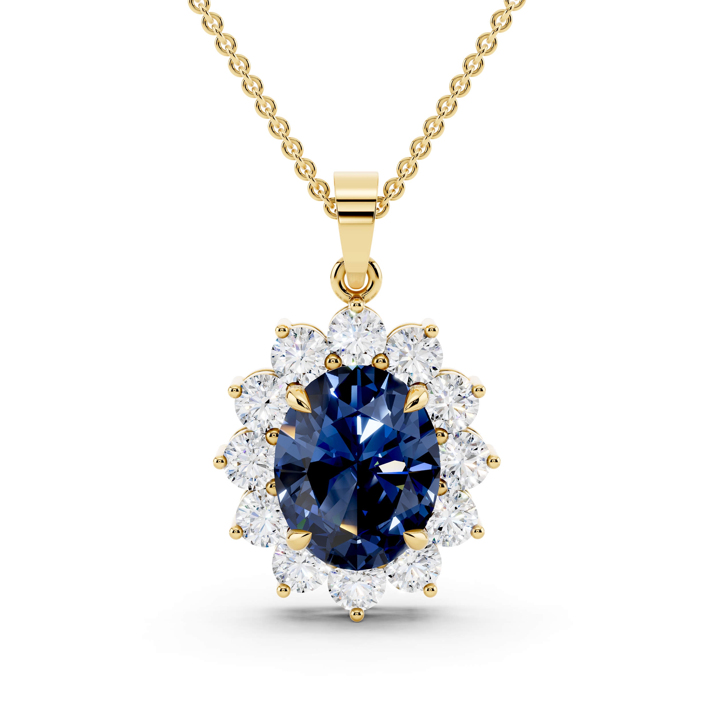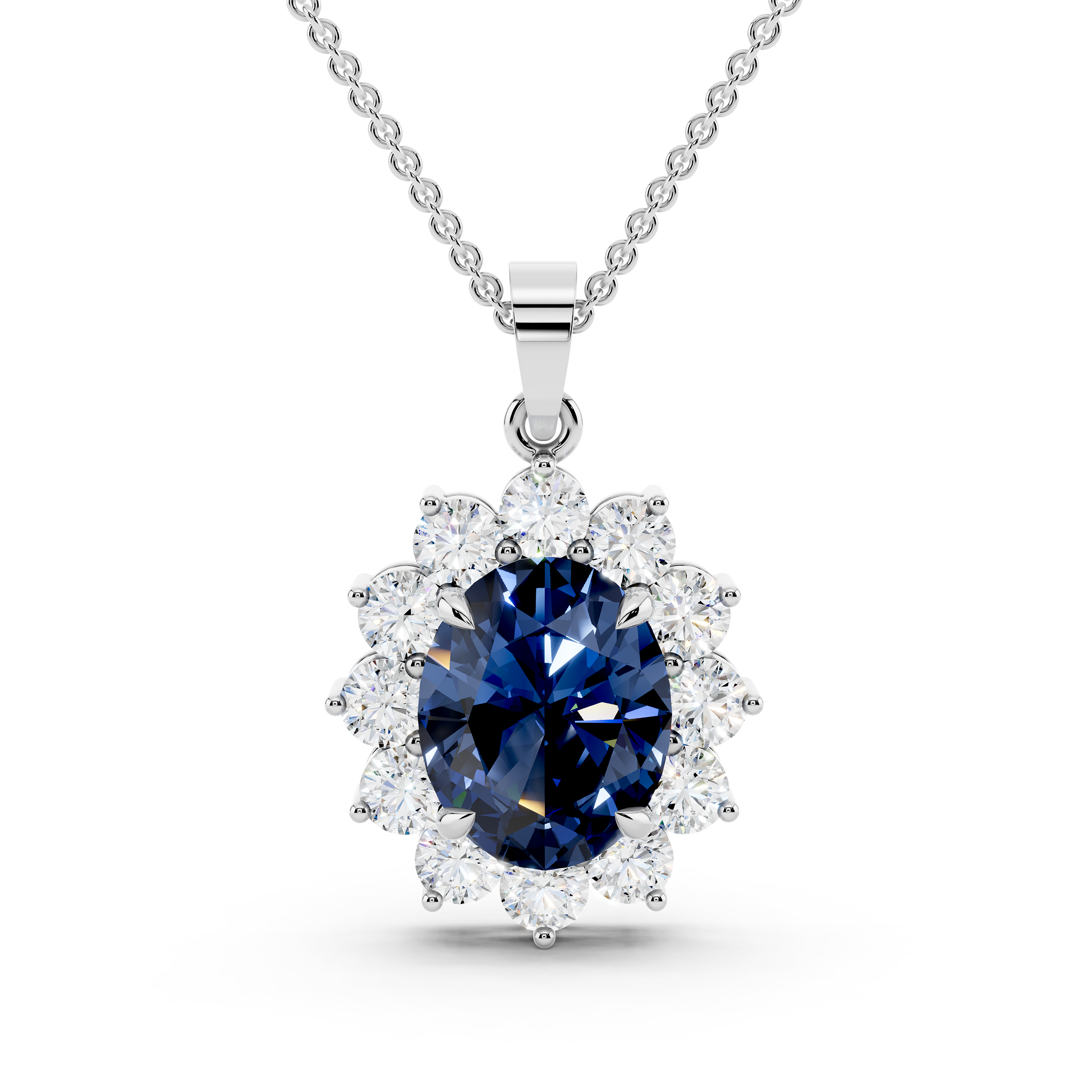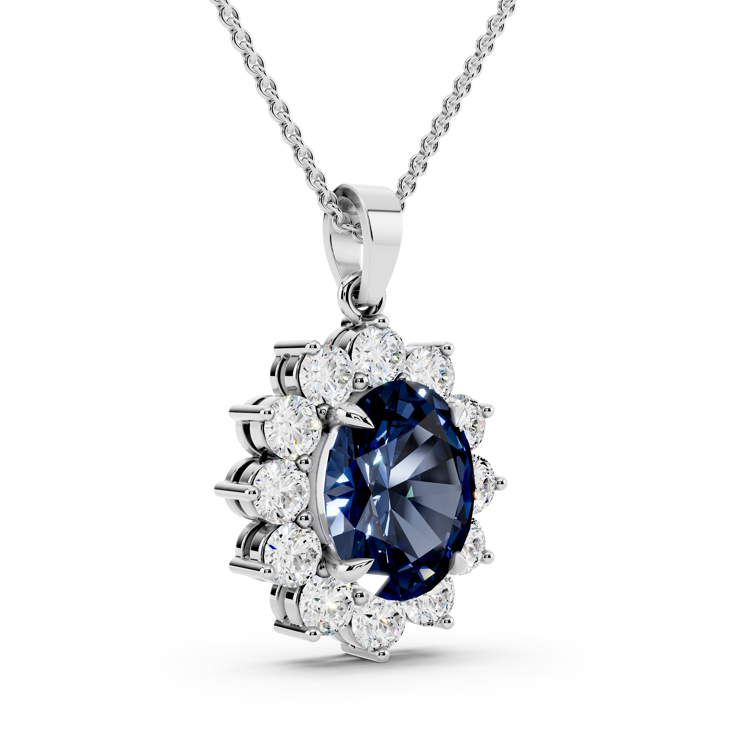 A striking oval-cut blue center stone takes the spotlight in this floral-inspired pendant, framed by a radiant cluster of round stones. Its graceful silhouette and vivid contrast offer timeless elegance with a bold, captivating twist.