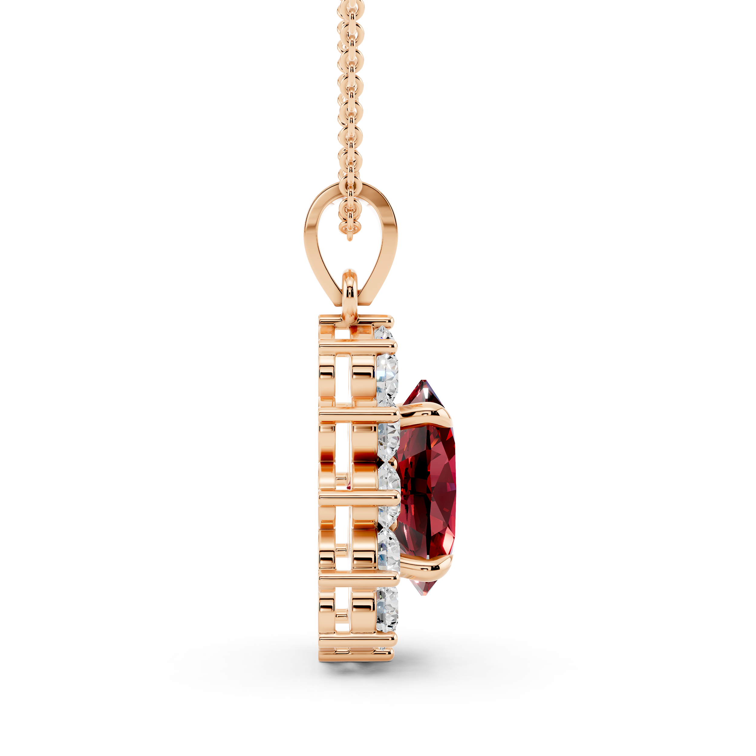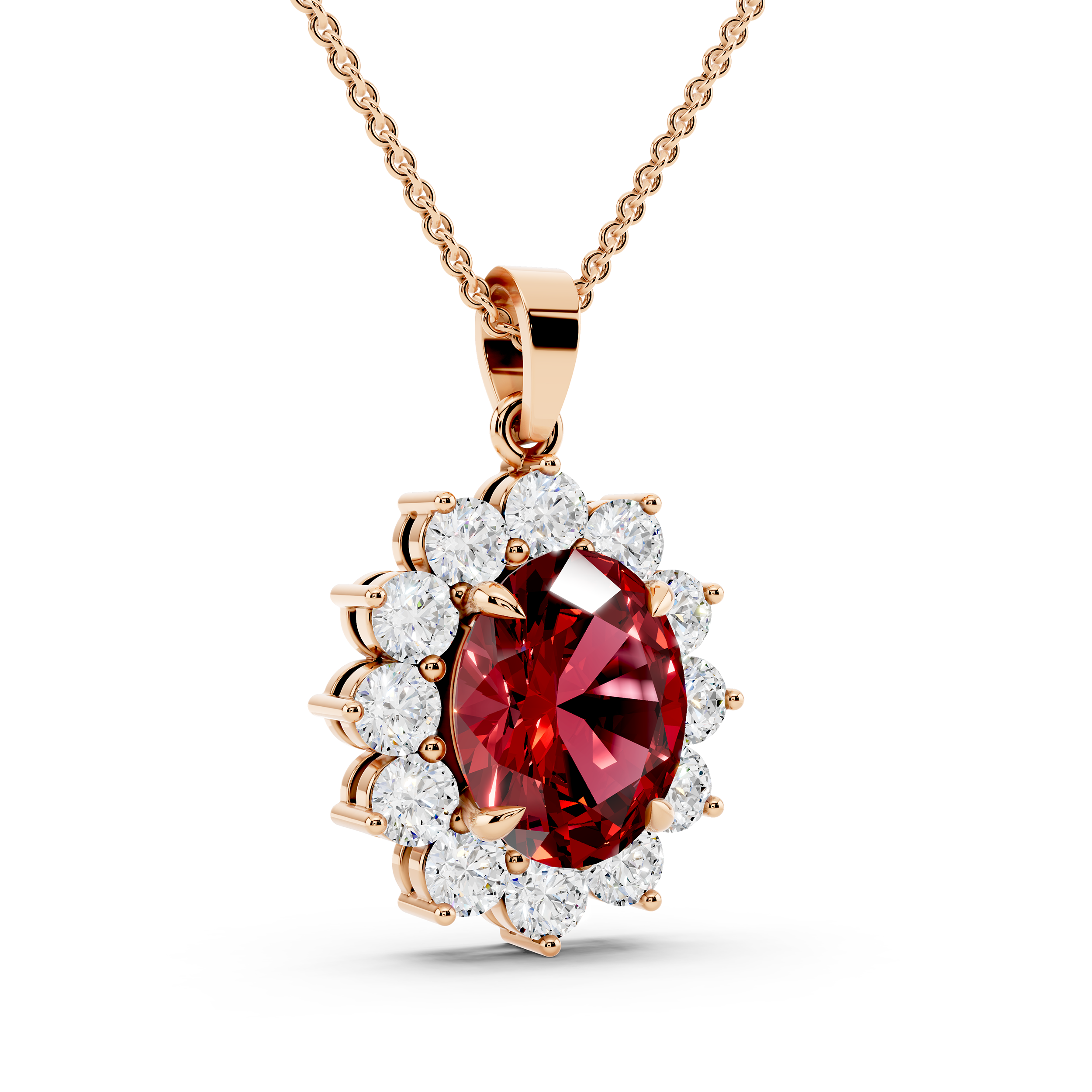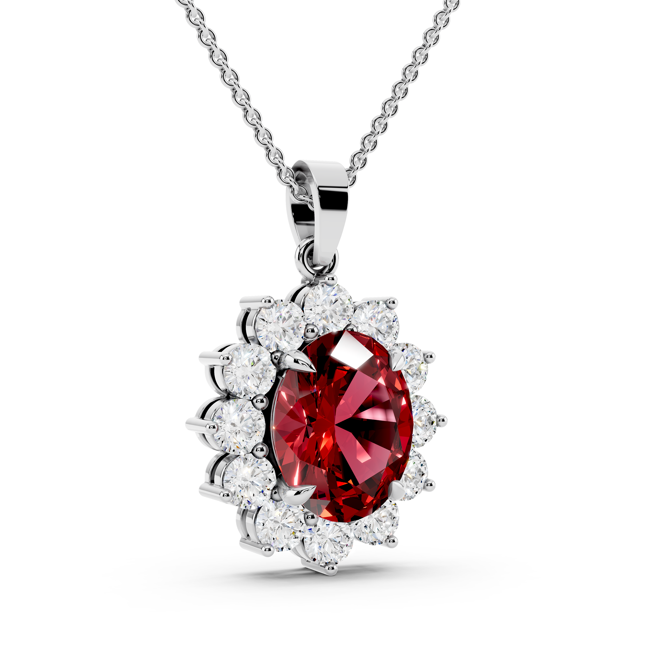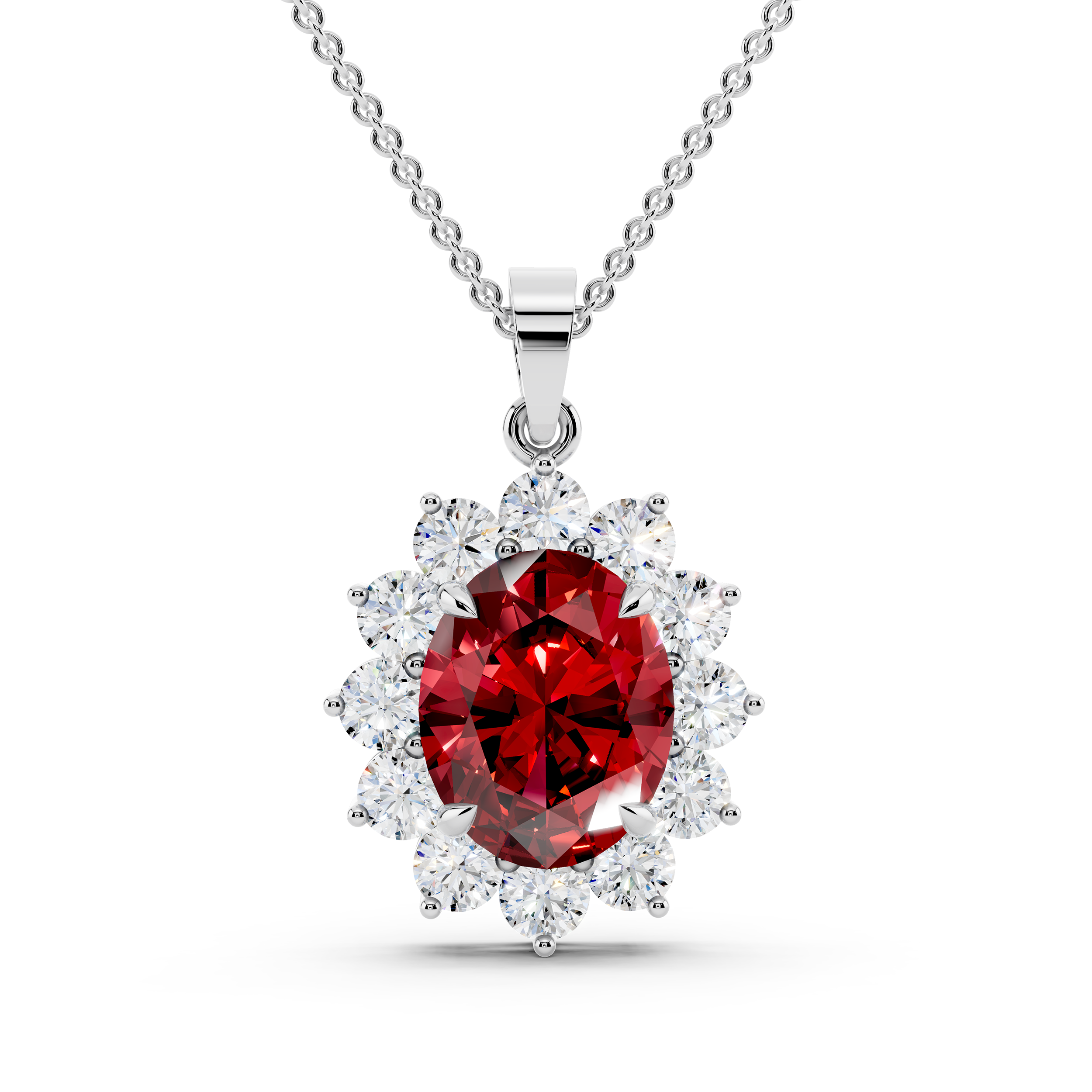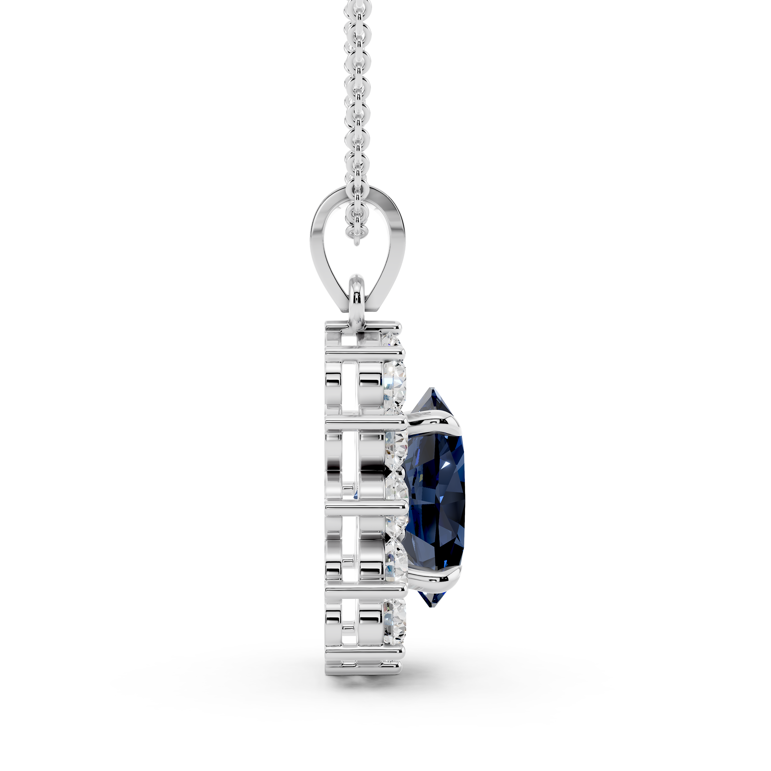 A striking oval-cut blue center stone takes the spotlight in this floral-inspired pendant, framed by a radiant cluster of round stones. Its graceful silhouette and vivid contrast offer timeless elegance with a bold, captivating twist.
