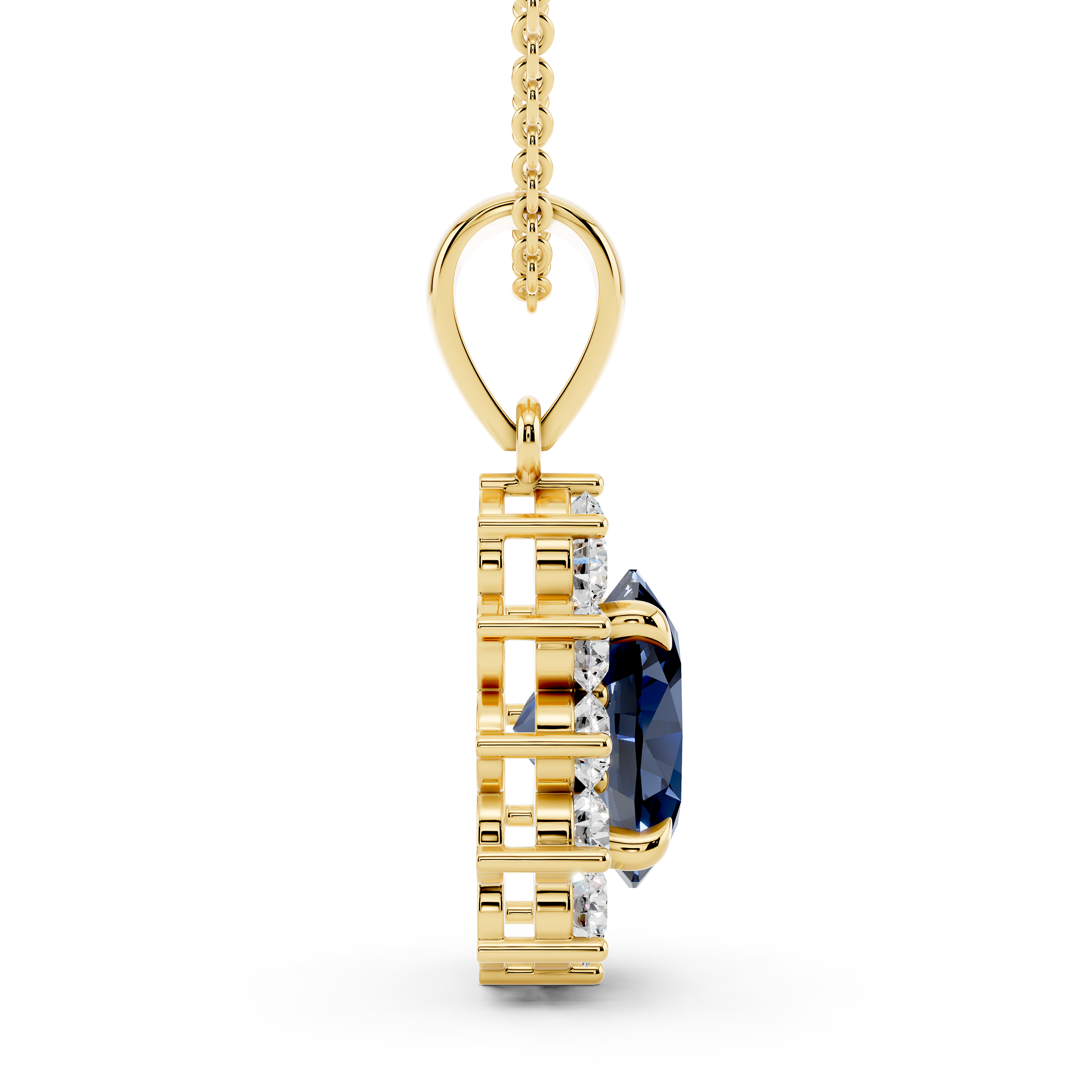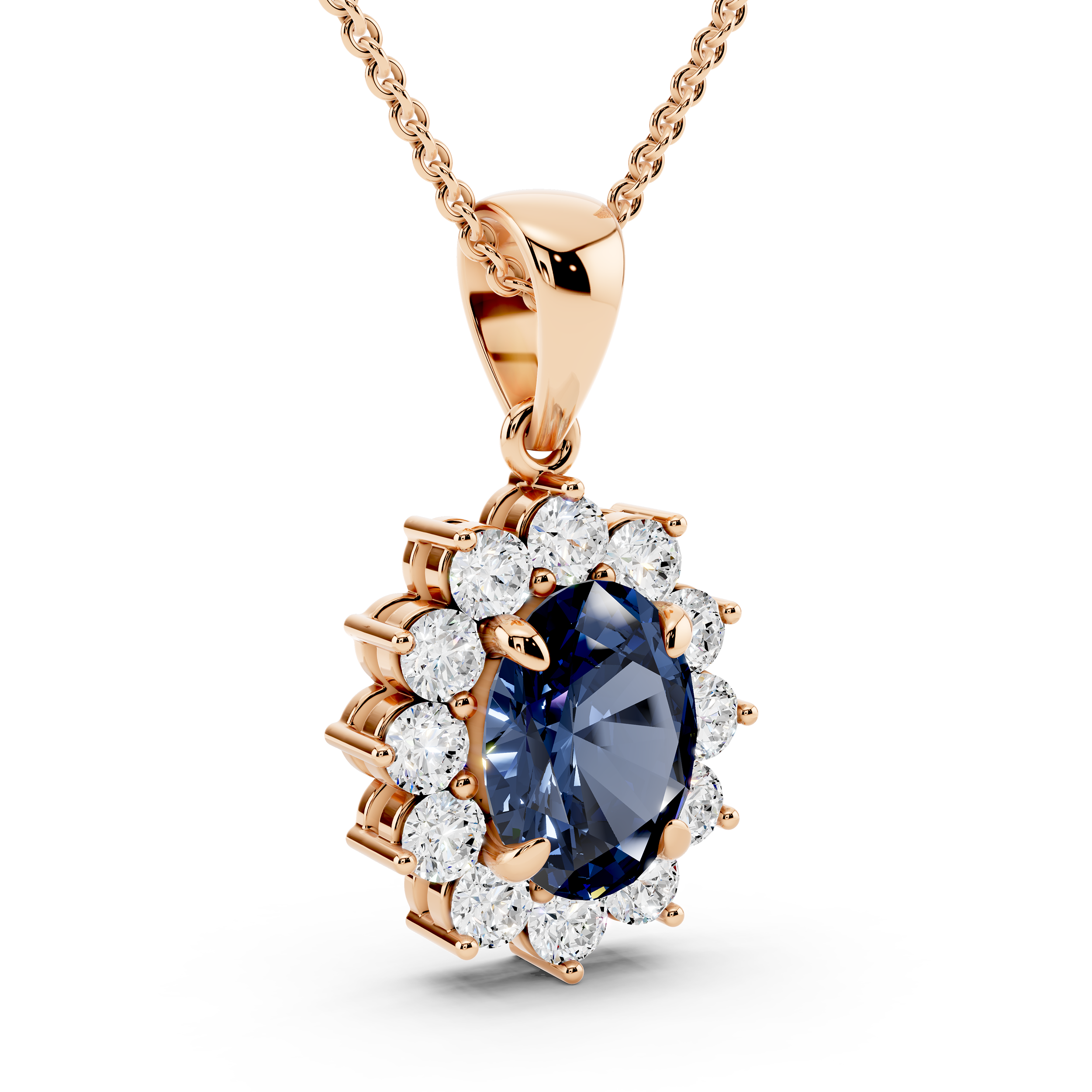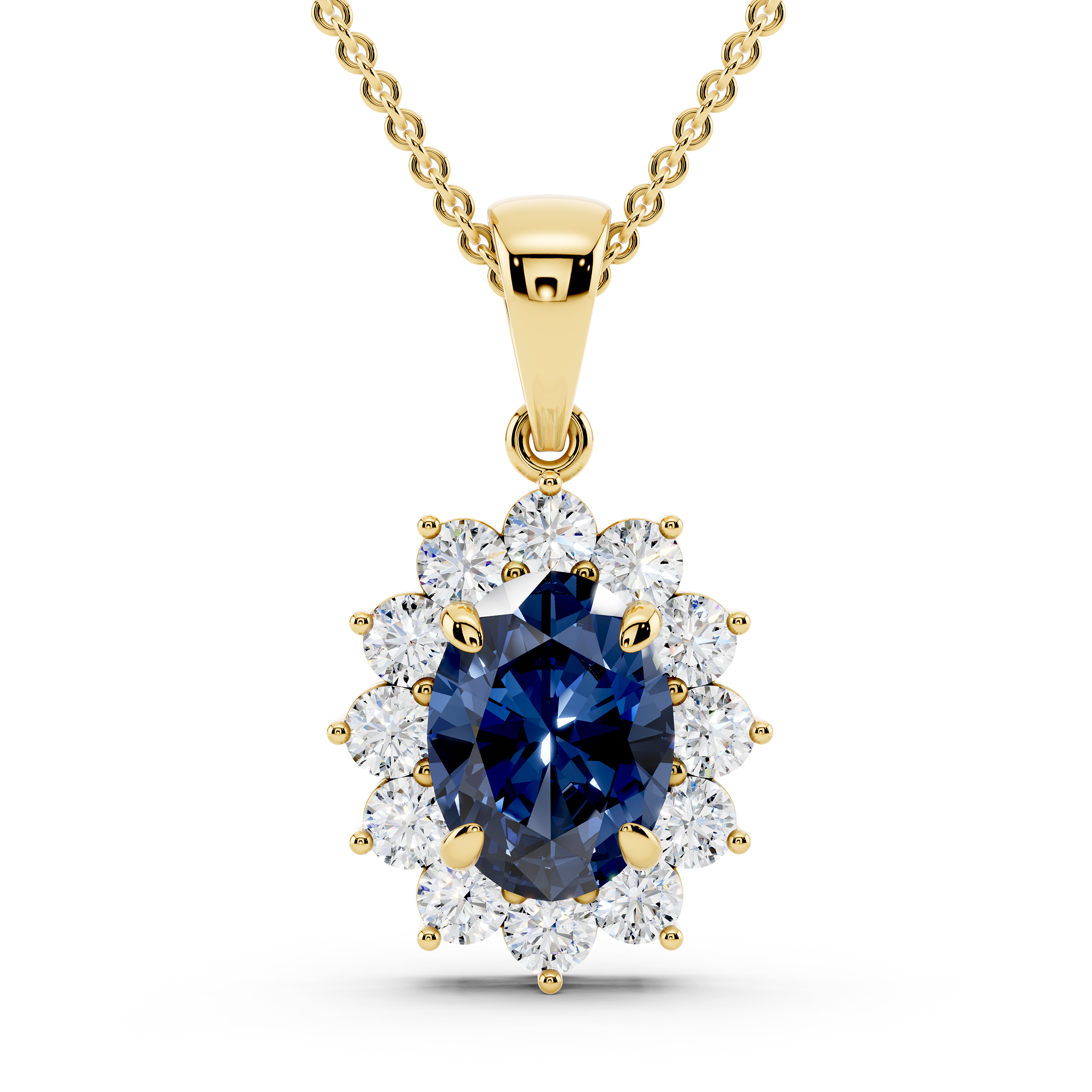 A regal pendant featuring a deep blue oval center stone surrounded by a radiant halo of sparkling round stones, arranged in a floral silhouette. With its refined proportions and elegant bale, this piece captures timeless sophistication and graceful charm—perfect for both everyday elegance and special occasions.