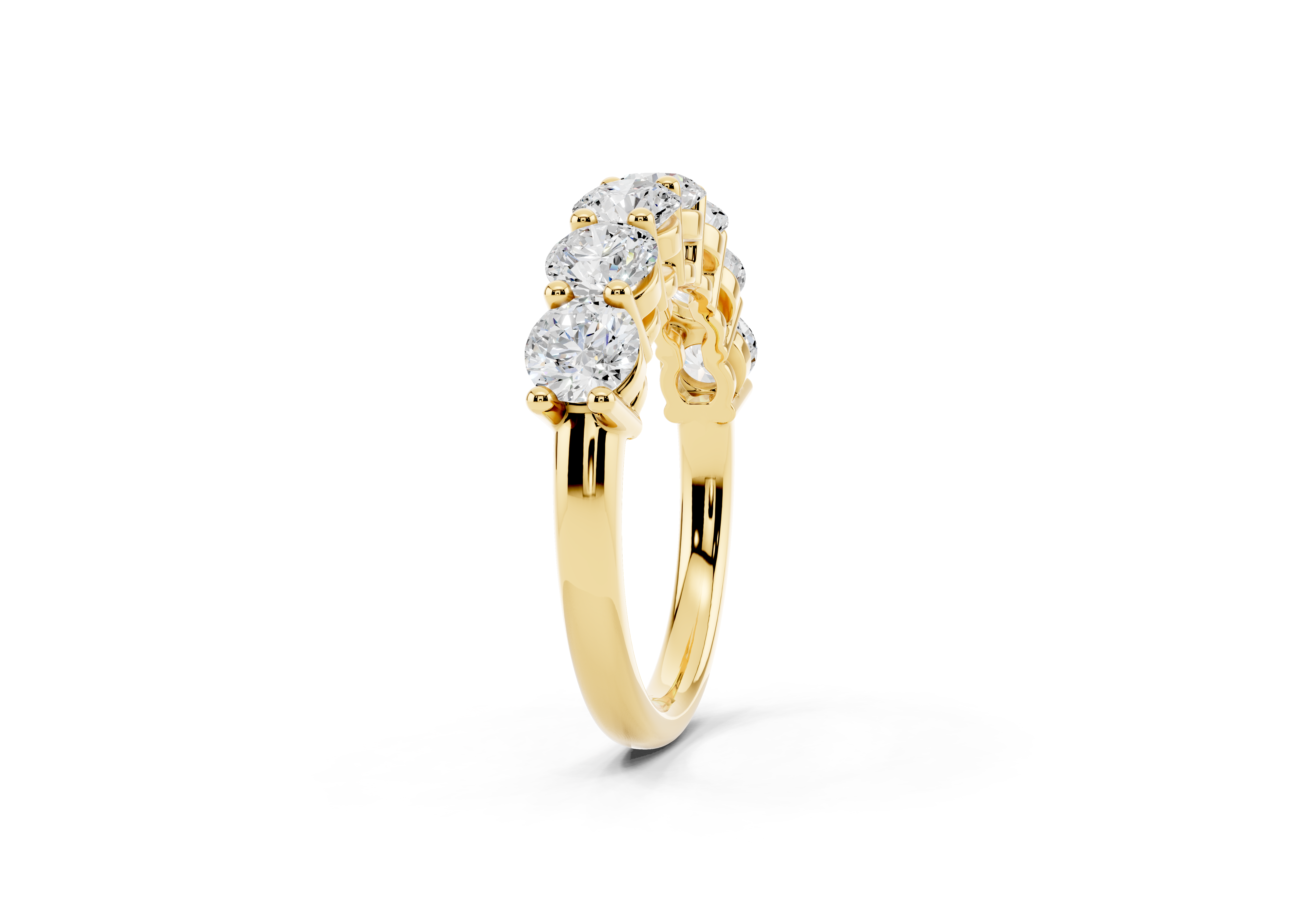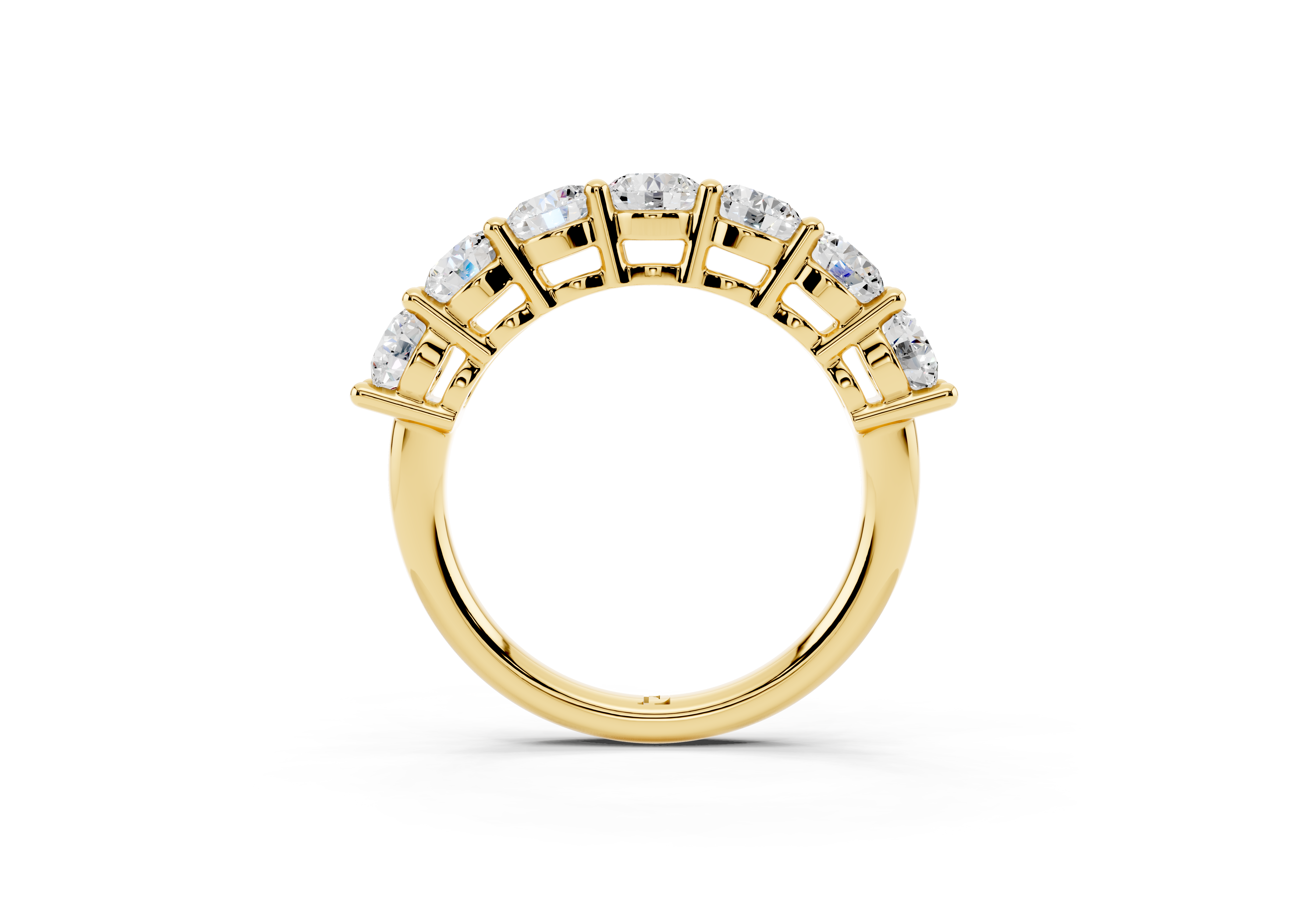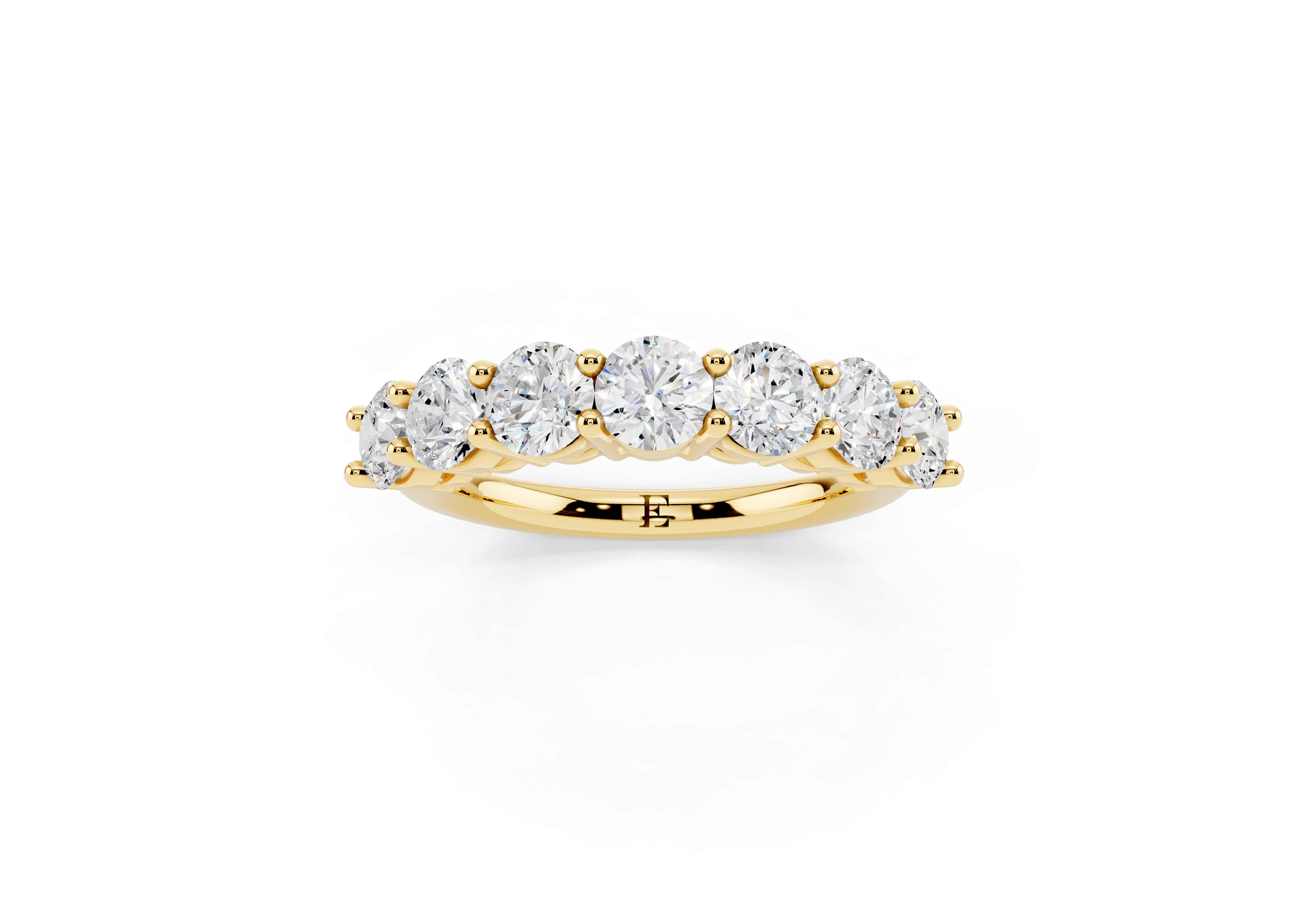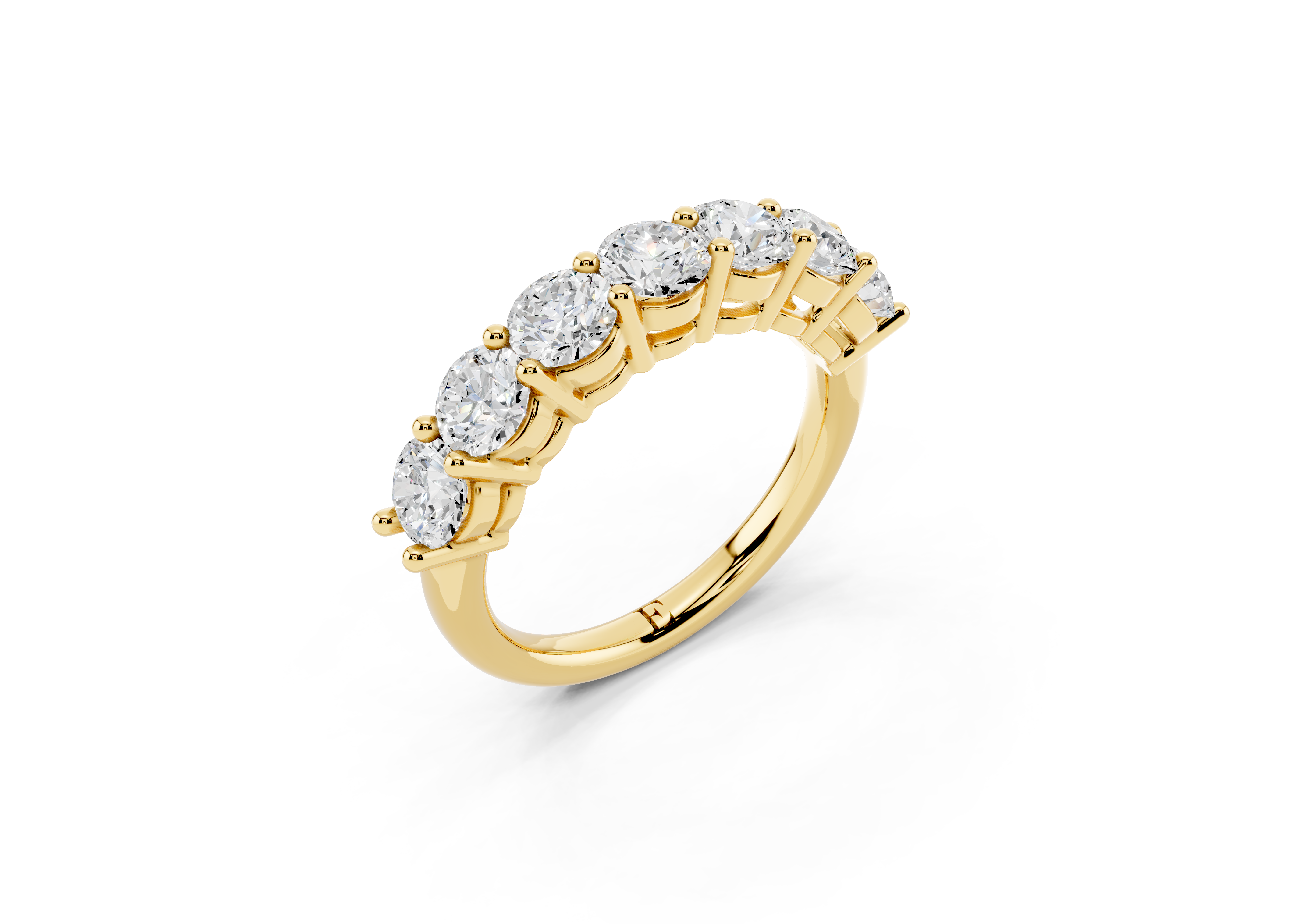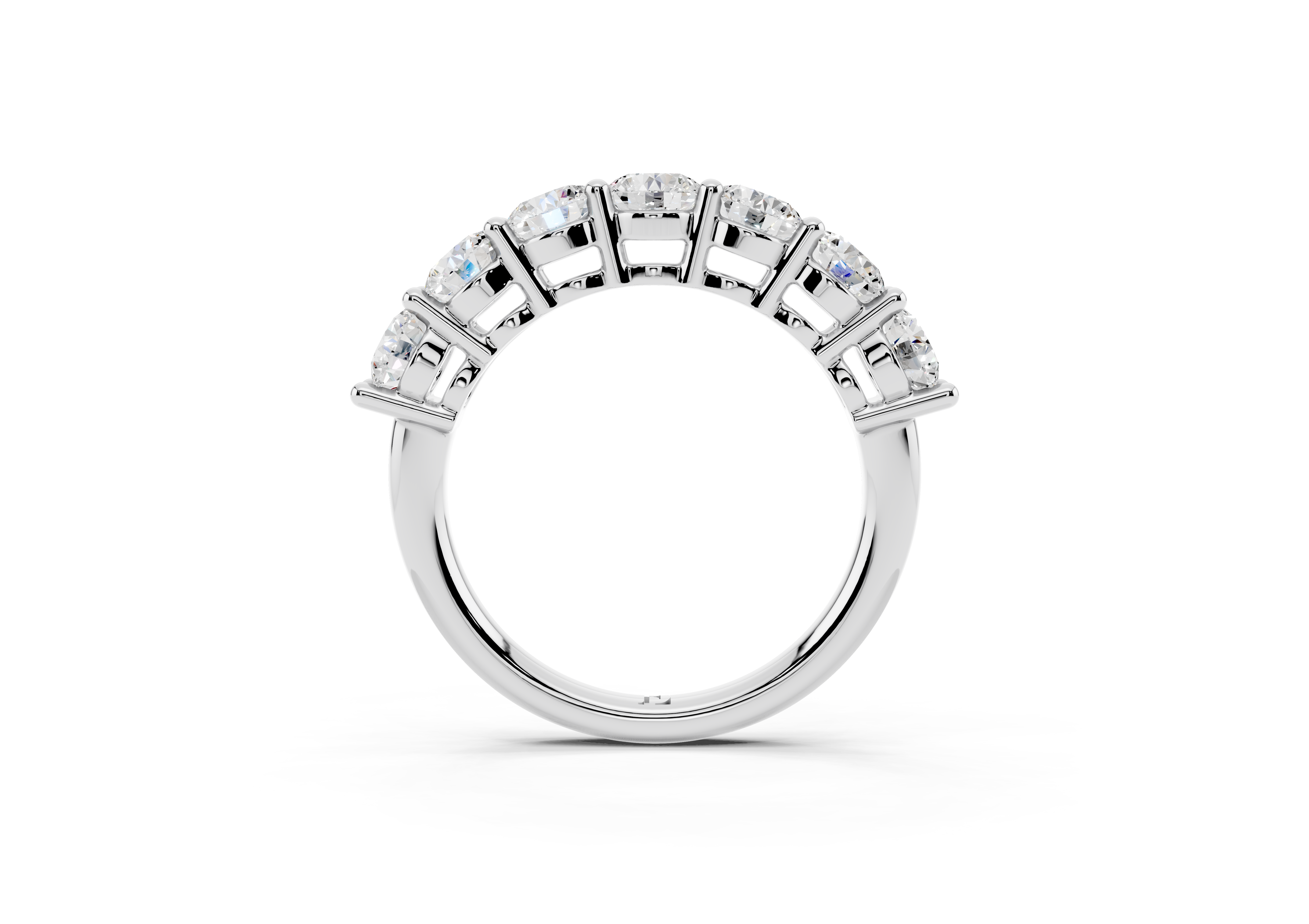 Celebrate your most treasured moments with “The Seven Stones Band.” This elegant band features seven sparkling, round-cut stones, each held in a delicate basket setting that enhances its individual radiance. A timeless design symbolizing enduring love and cherished memories.