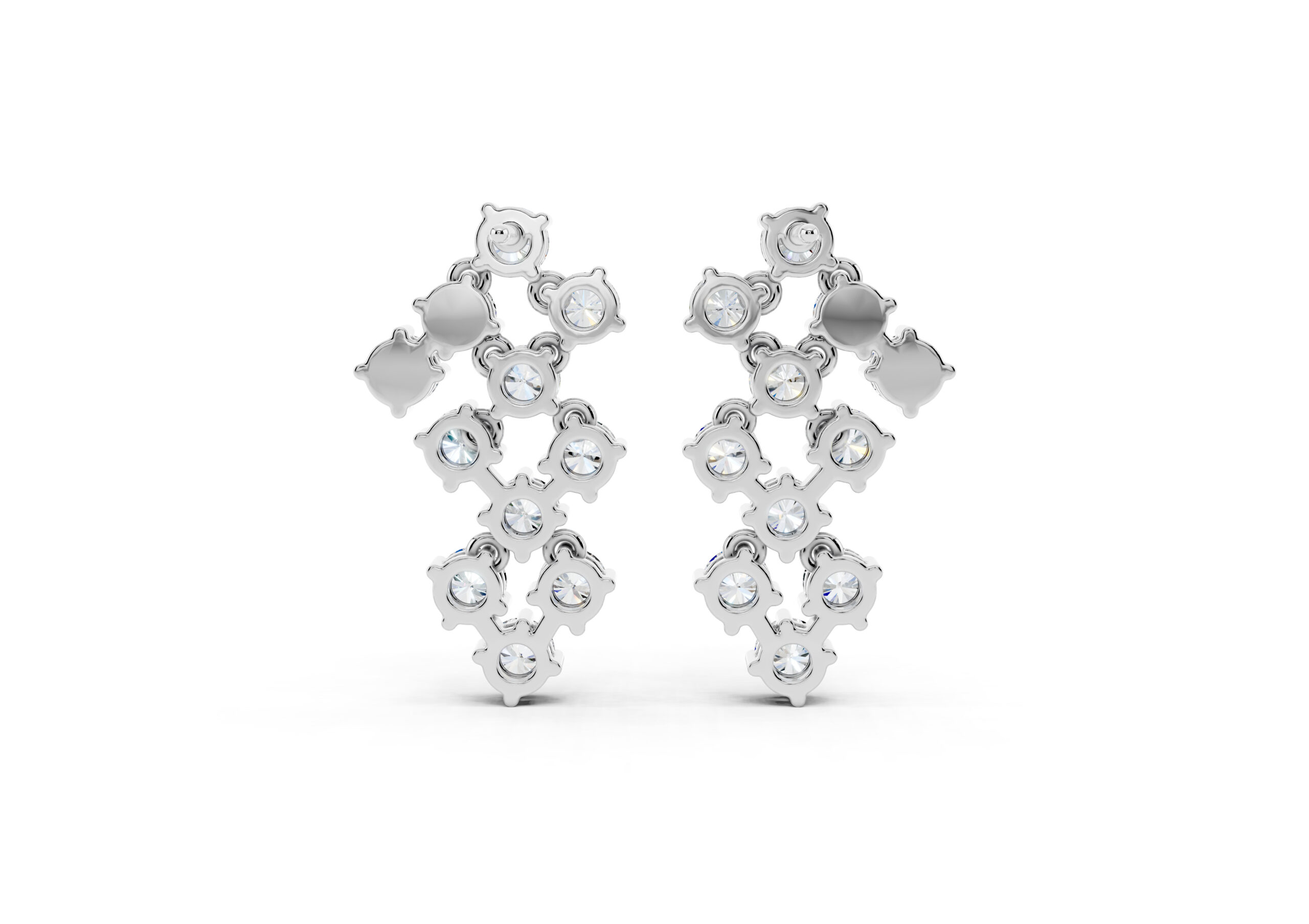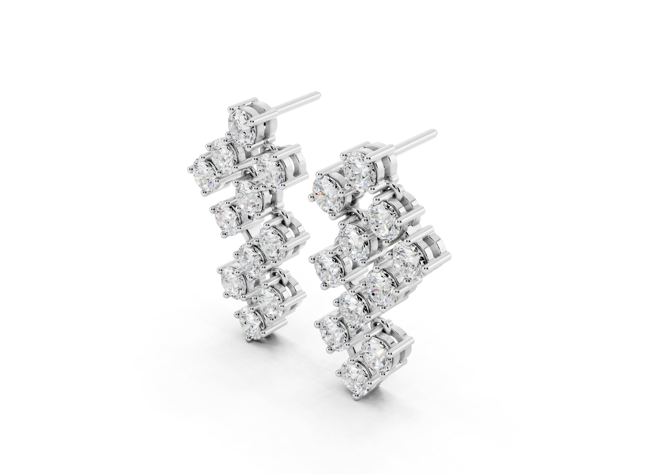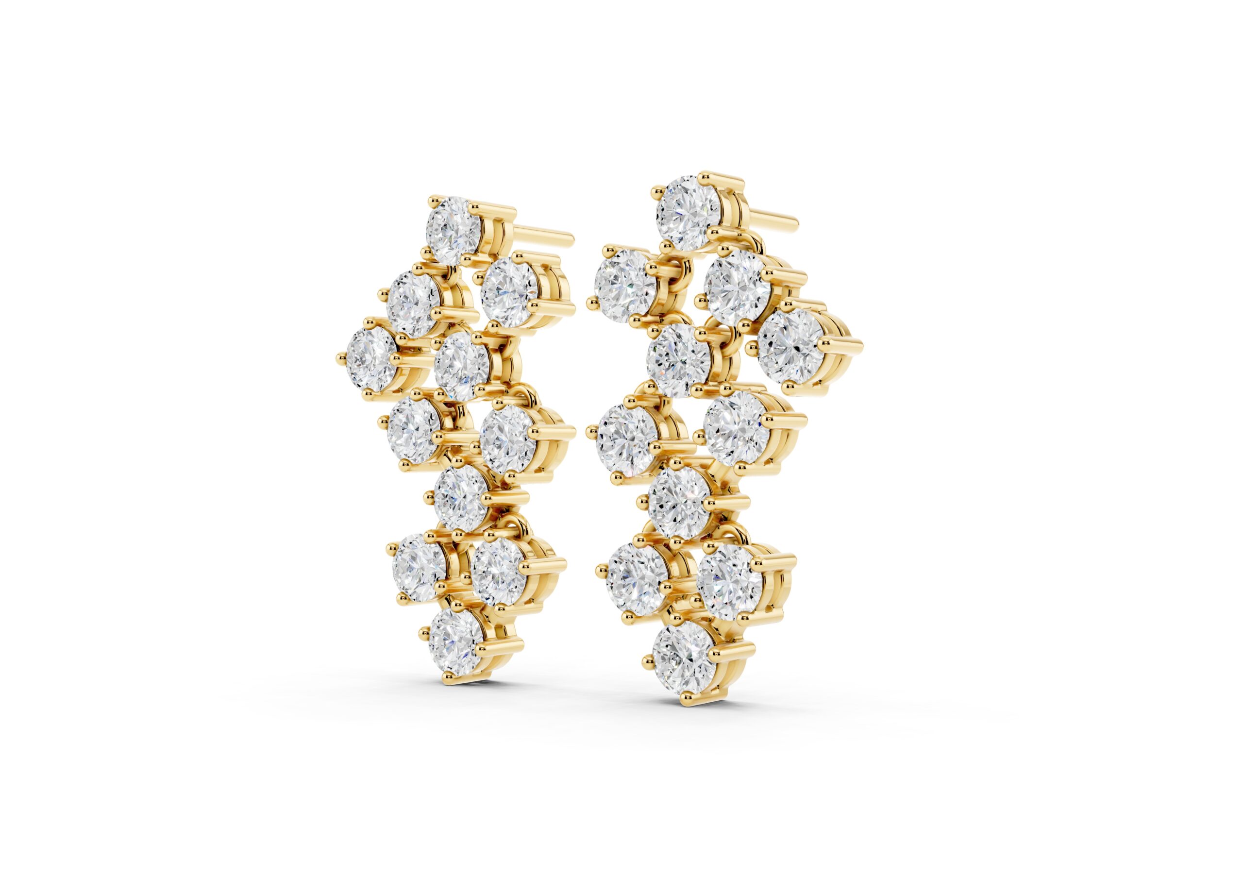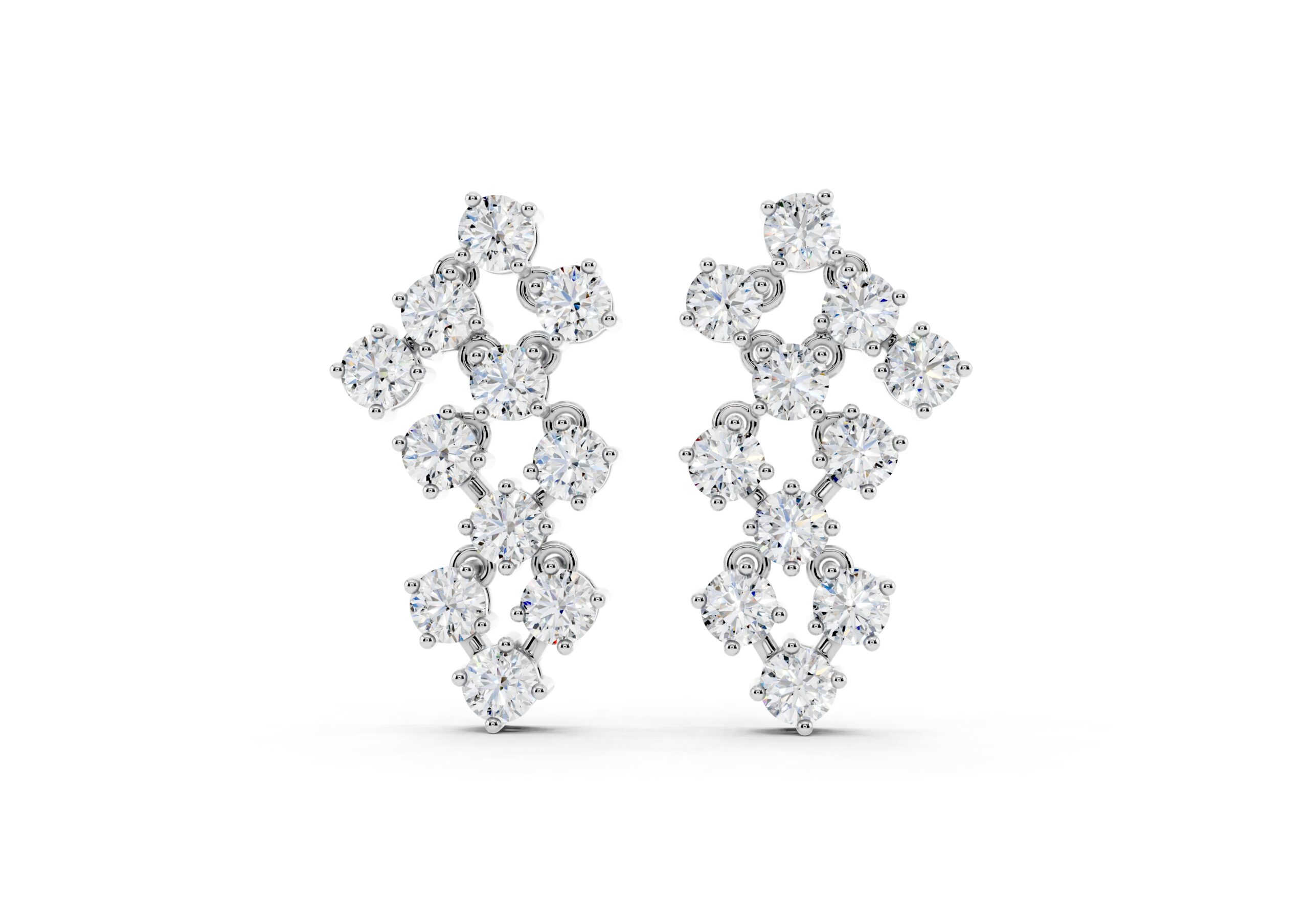A sculptural take on timeless sparkle, these earrings feature round diamonds arranged in an artful cascade, creating a fluid sense of movement and light. The staggered design plays with geometry while maintaining softness, catching every glimmer with grace. Bold enough to stand alone yet refined in detail — these are evening essentials with an edge.