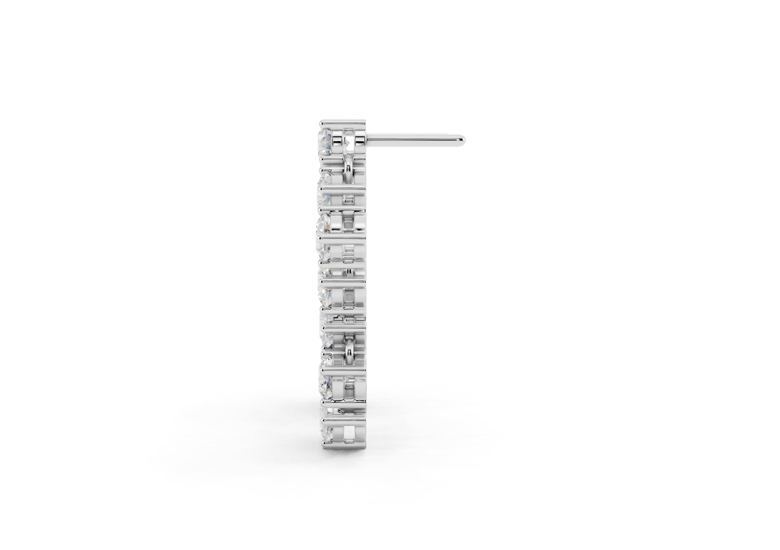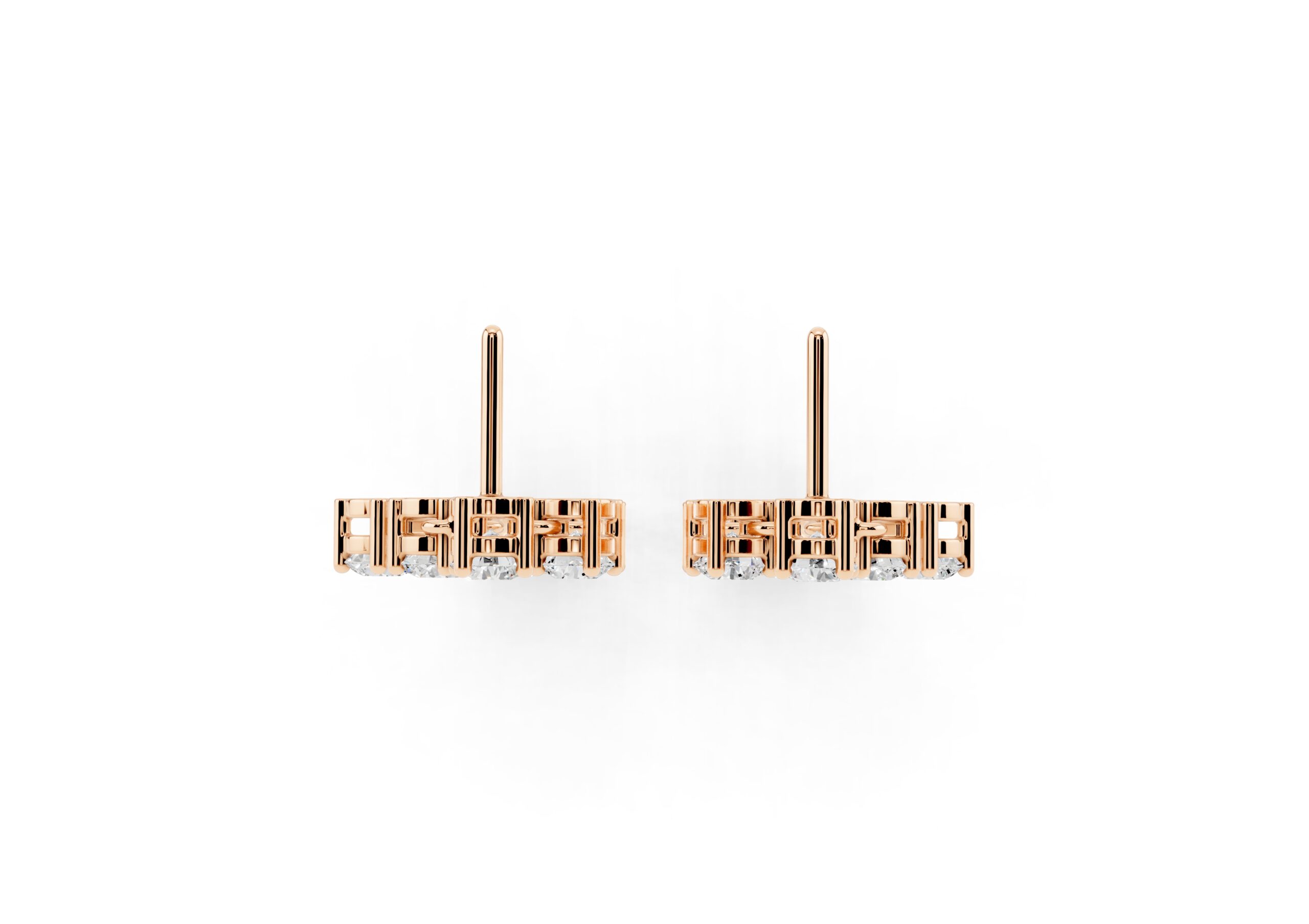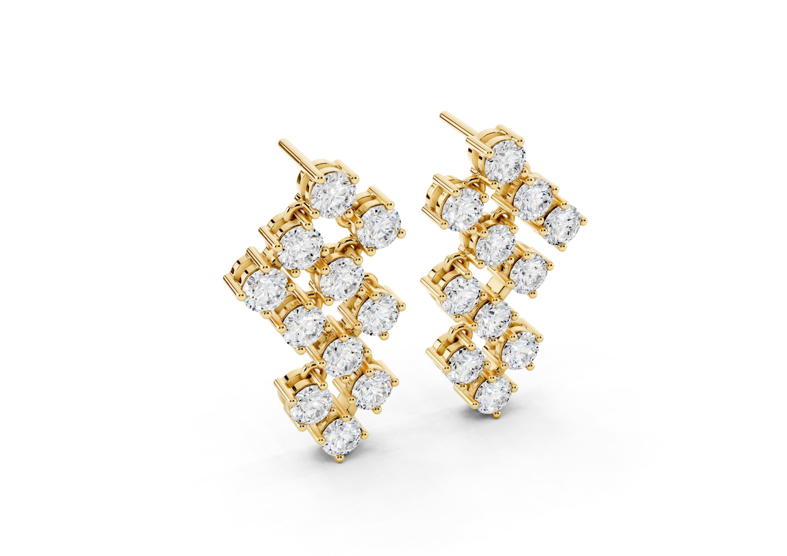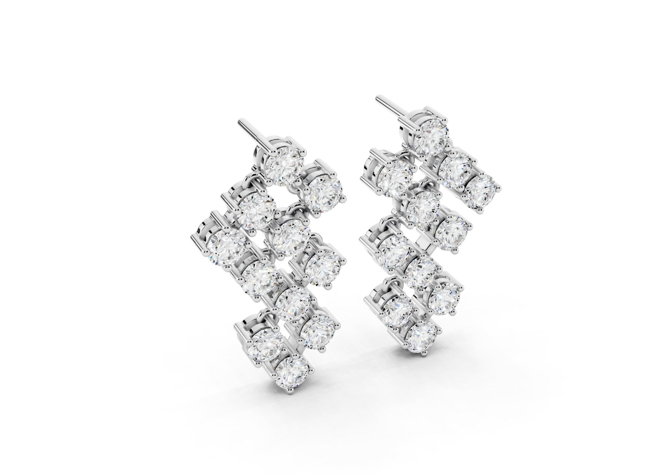 A sculptural take on timeless sparkle, these earrings feature round diamonds arranged in an artful cascade, creating a fluid sense of movement and light. The staggered design plays with geometry while maintaining softness, catching every glimmer with grace. Bold enough to stand alone yet refined in detail — these are evening essentials with an edge.