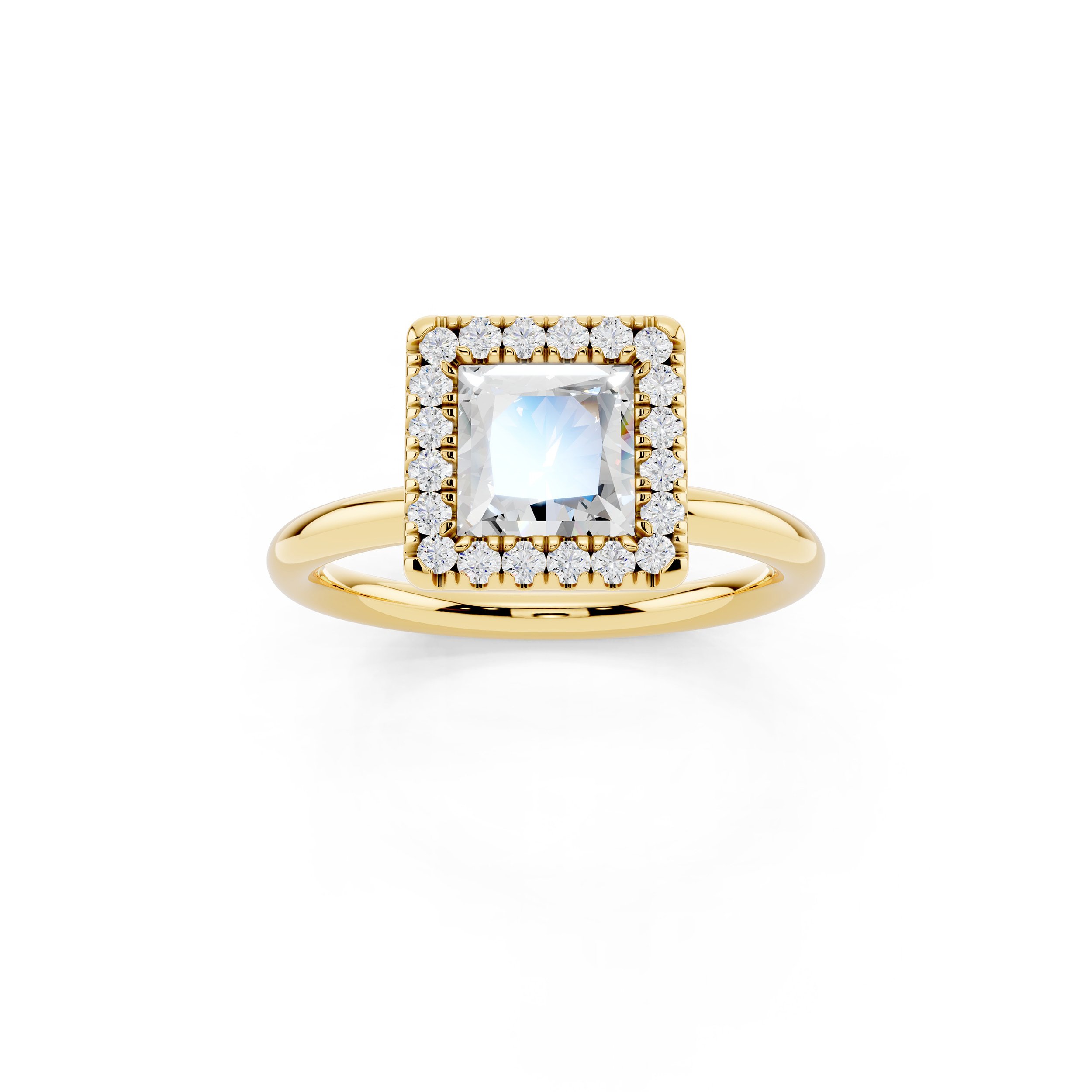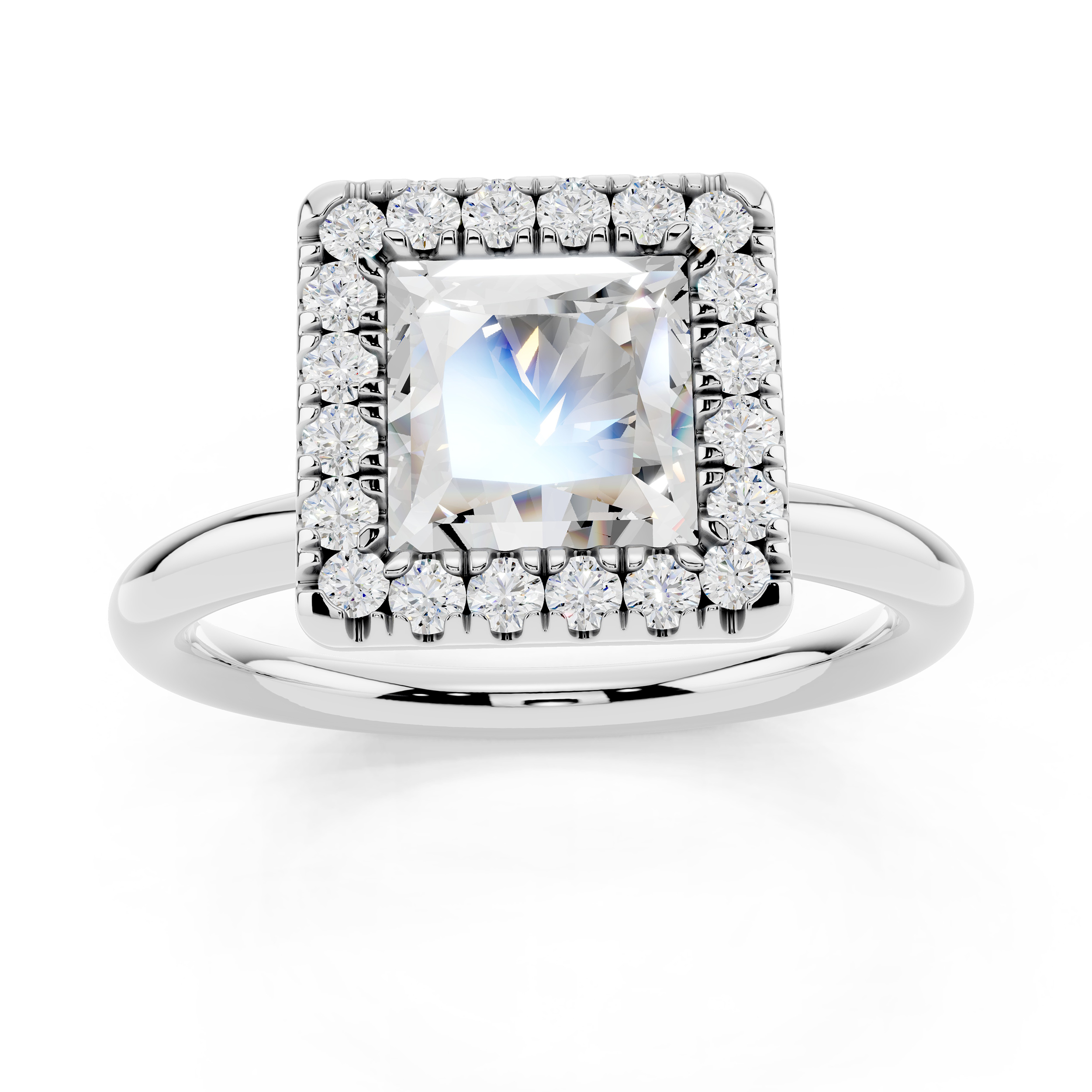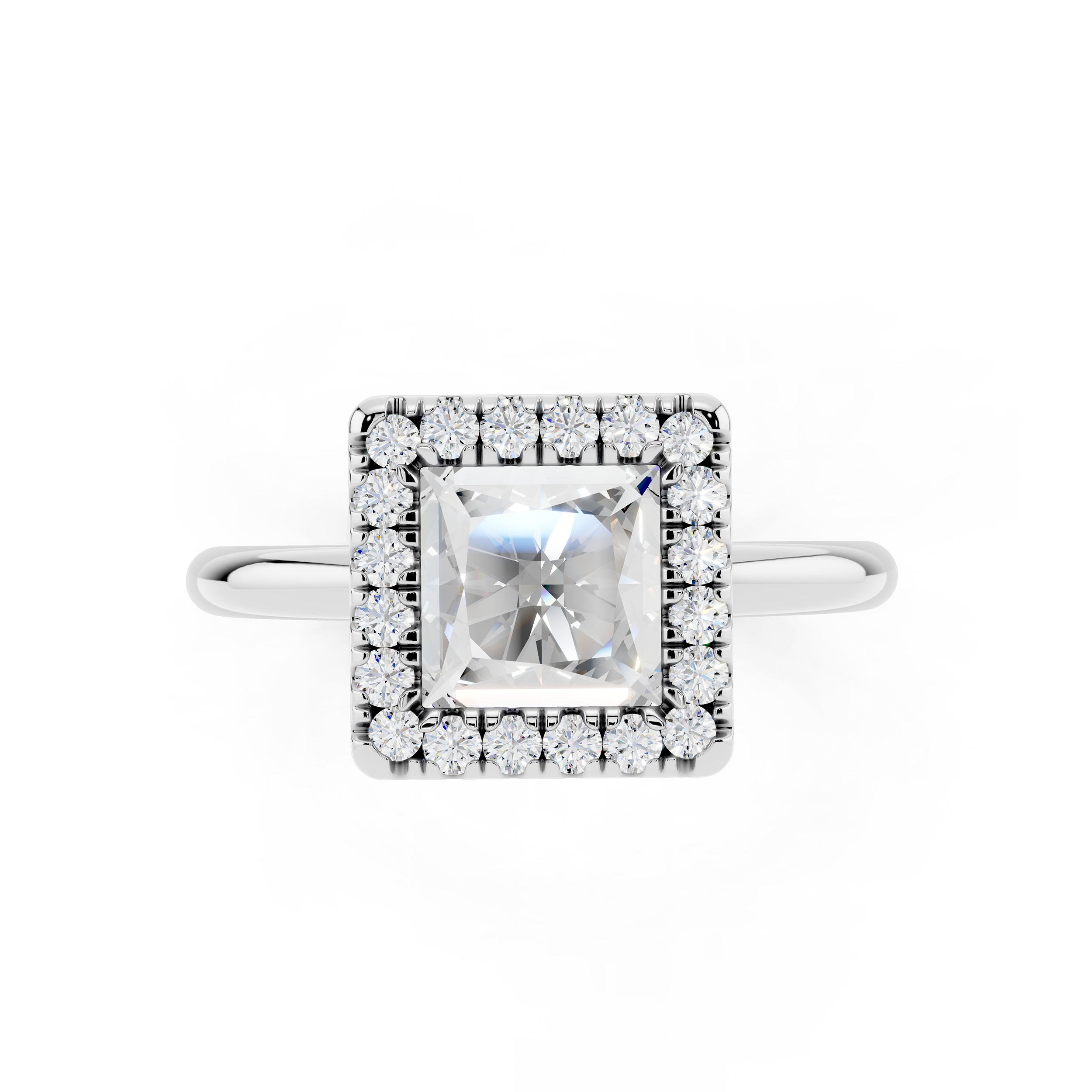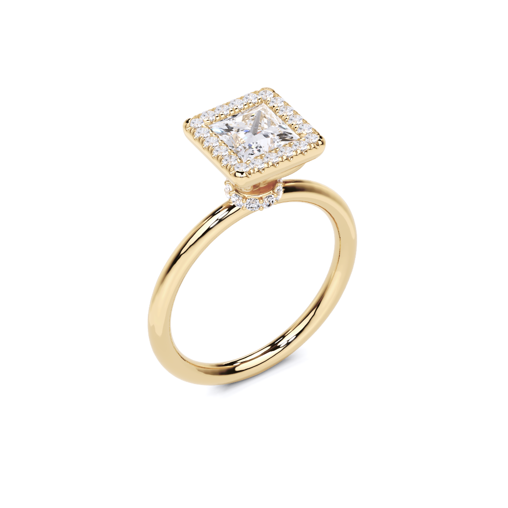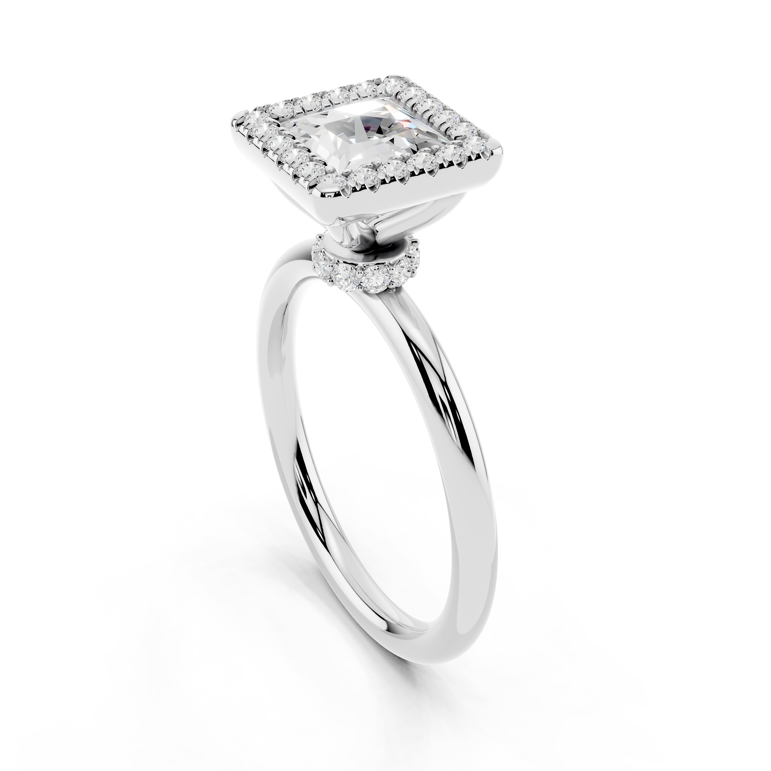A bold square-cut center stone is framed by a halo of shimmering accents, all elevated on a delicately adorned gallery. With its clean lines and elevated profile, this ring blends geometric elegance with a touch of vintage charm.
