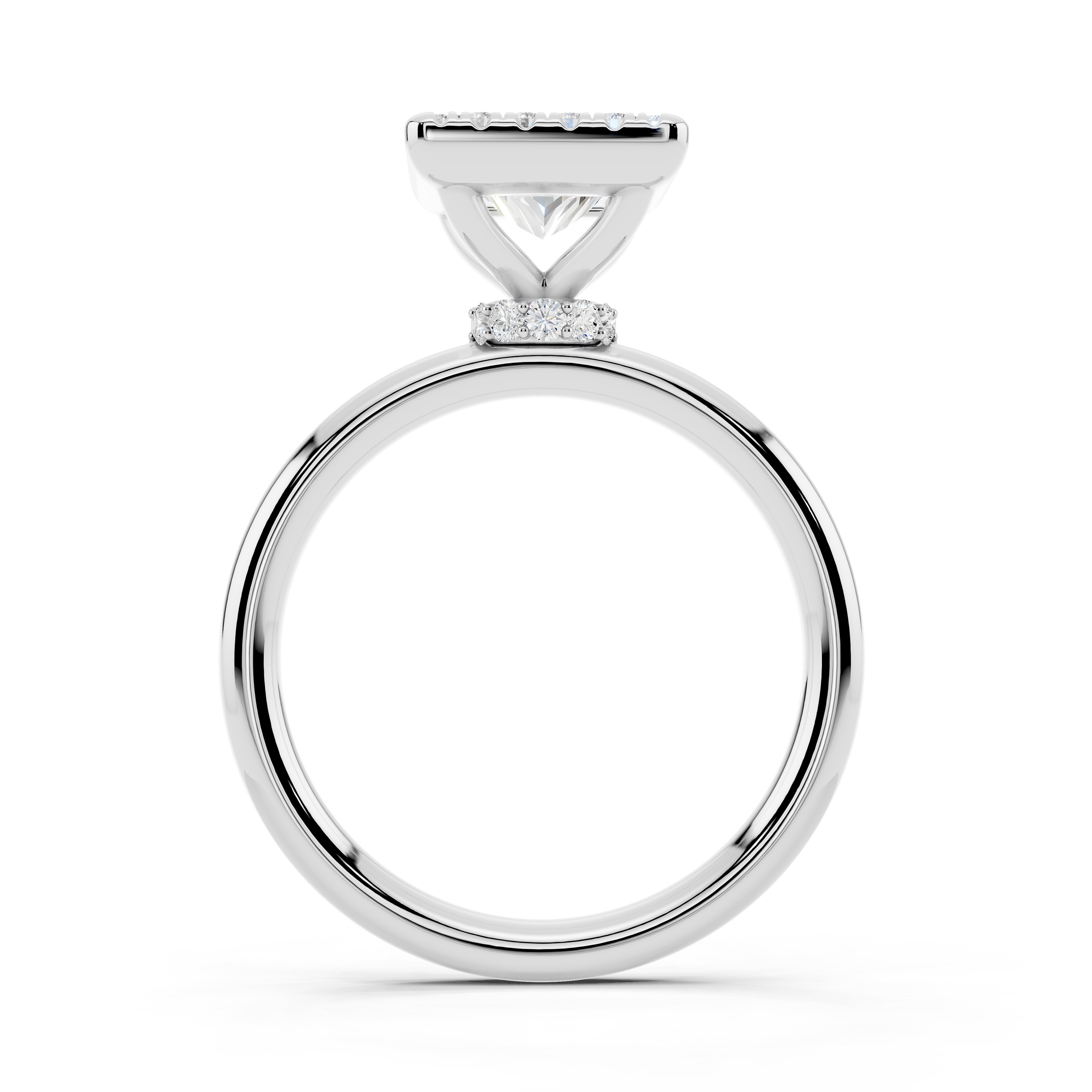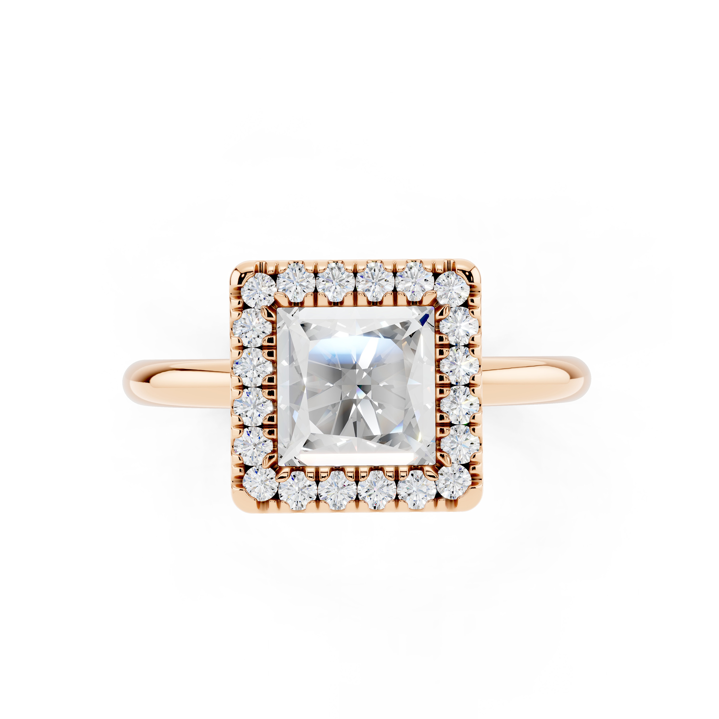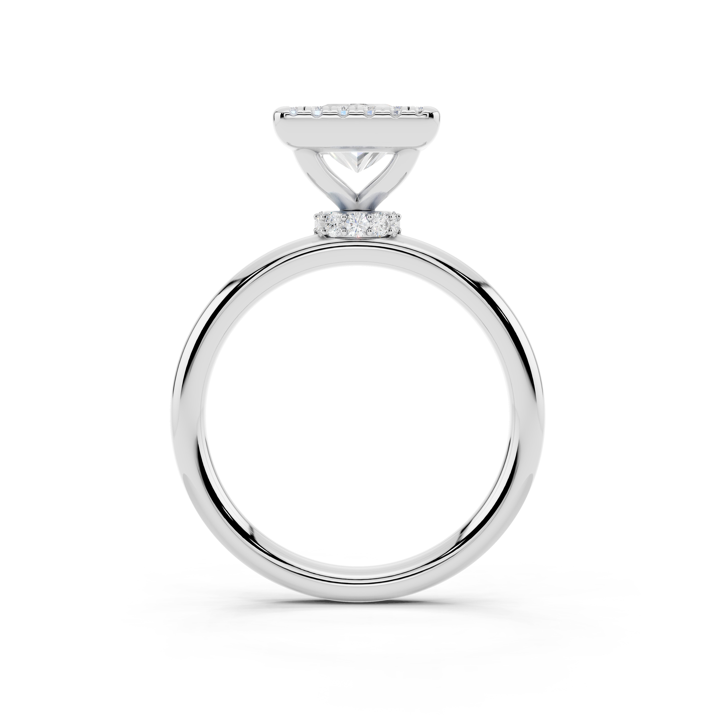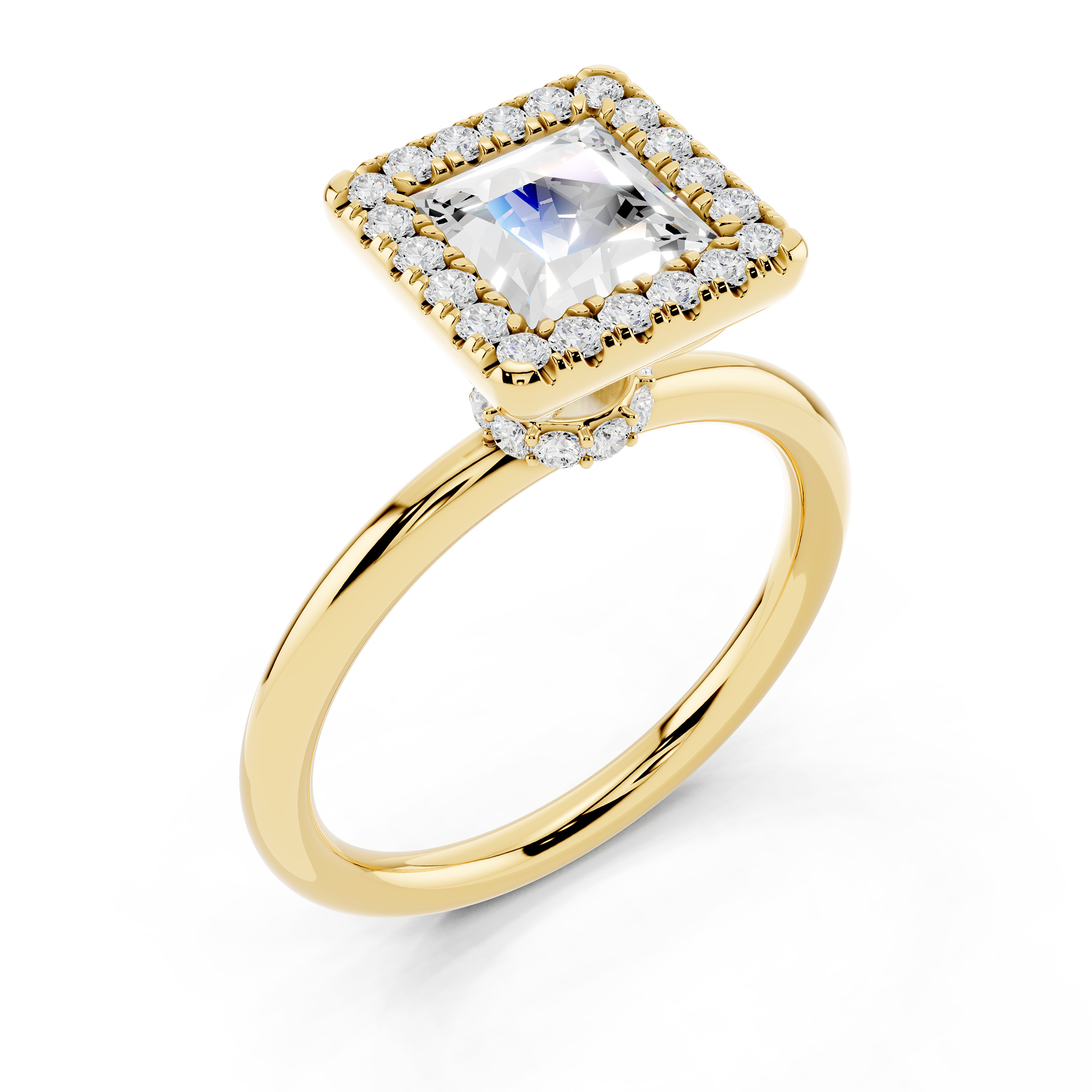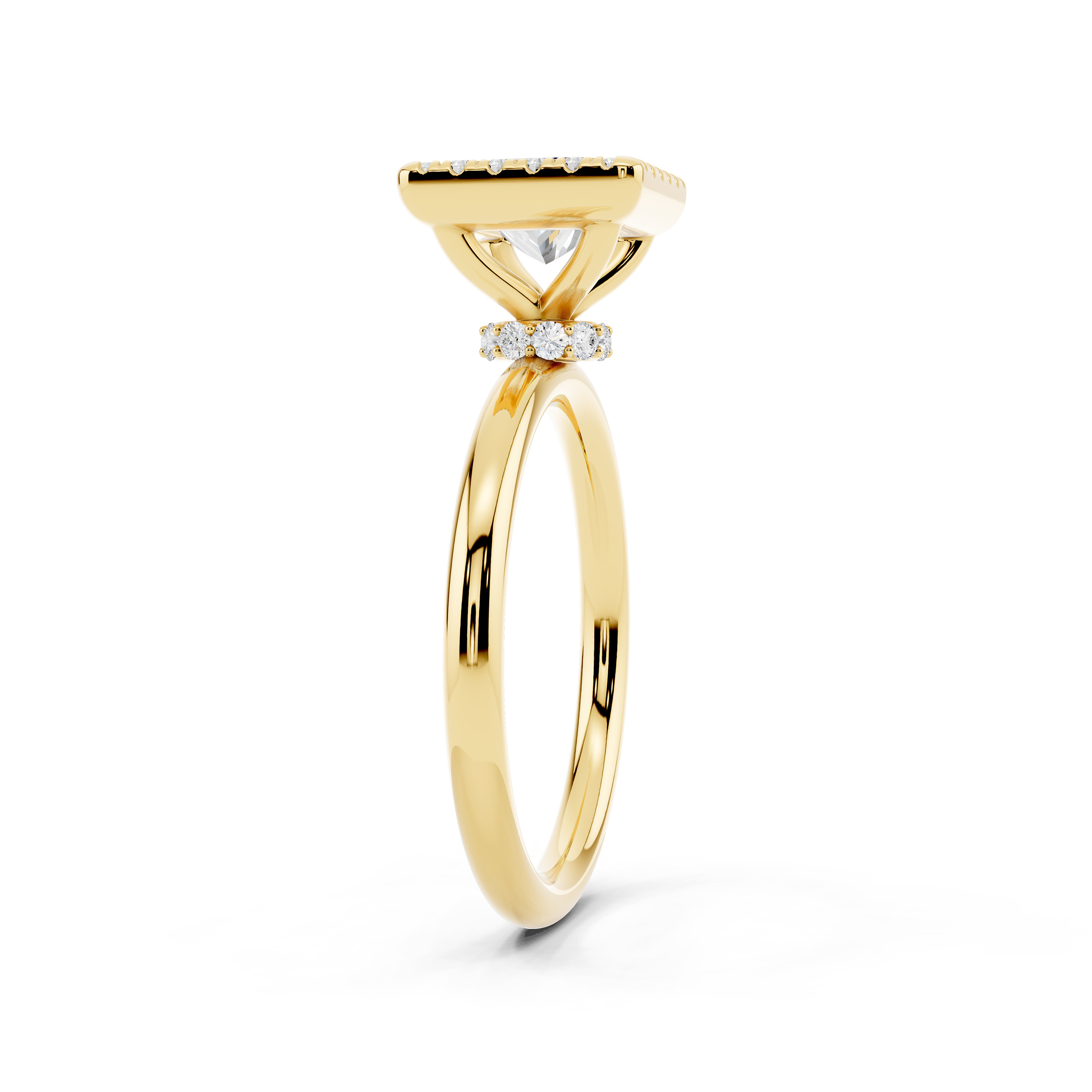 A bold square-cut center stone is framed by a halo of shimmering accents, all elevated on a delicately adorned gallery. With its clean lines and elevated profile, this ring blends geometric elegance with a touch of vintage charm.