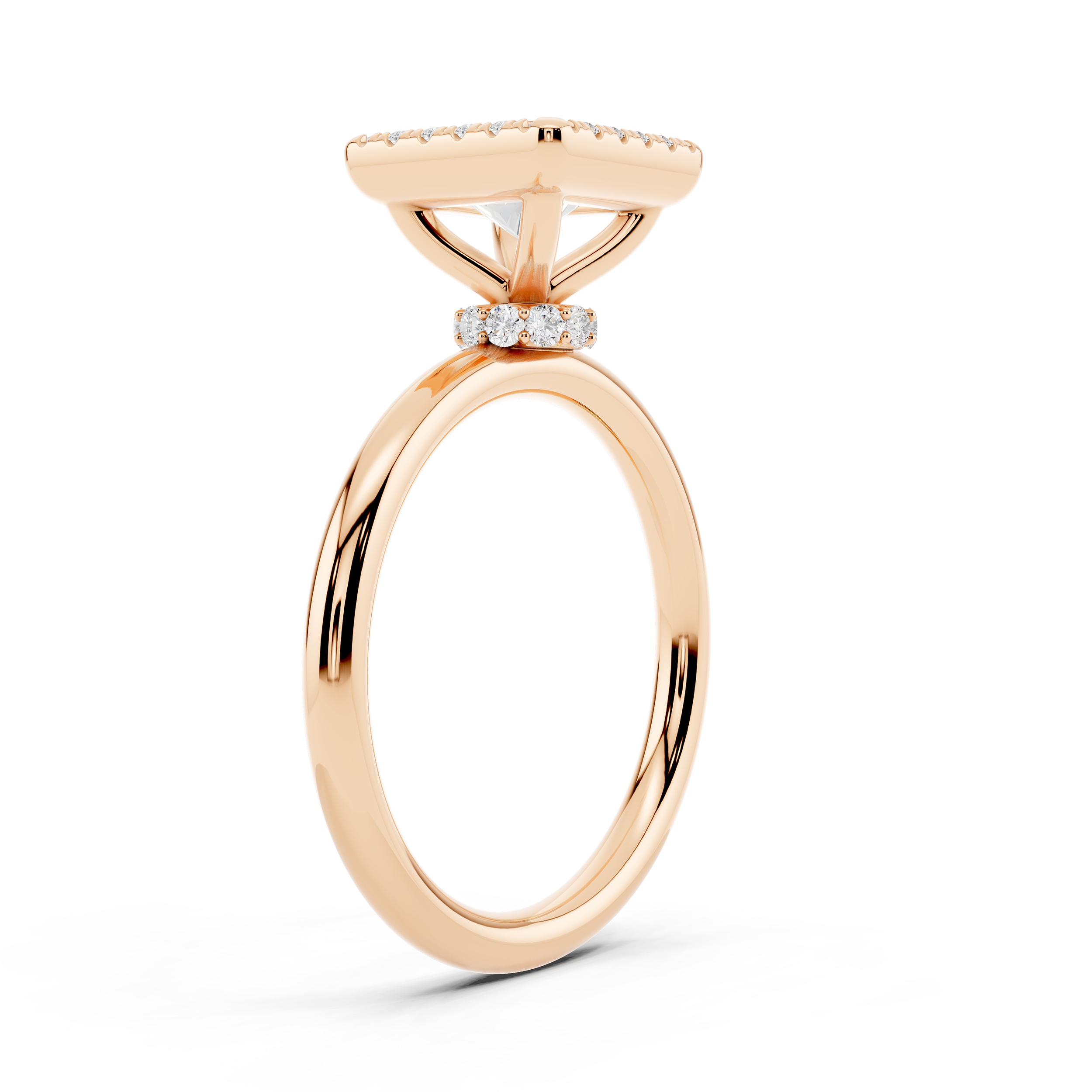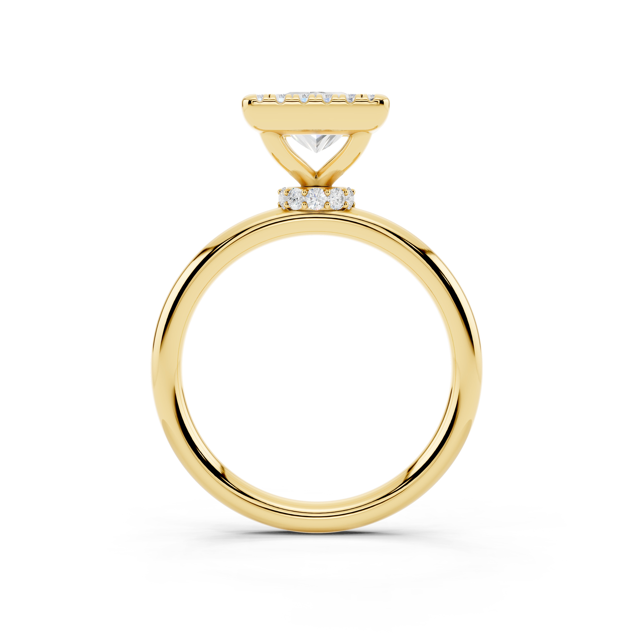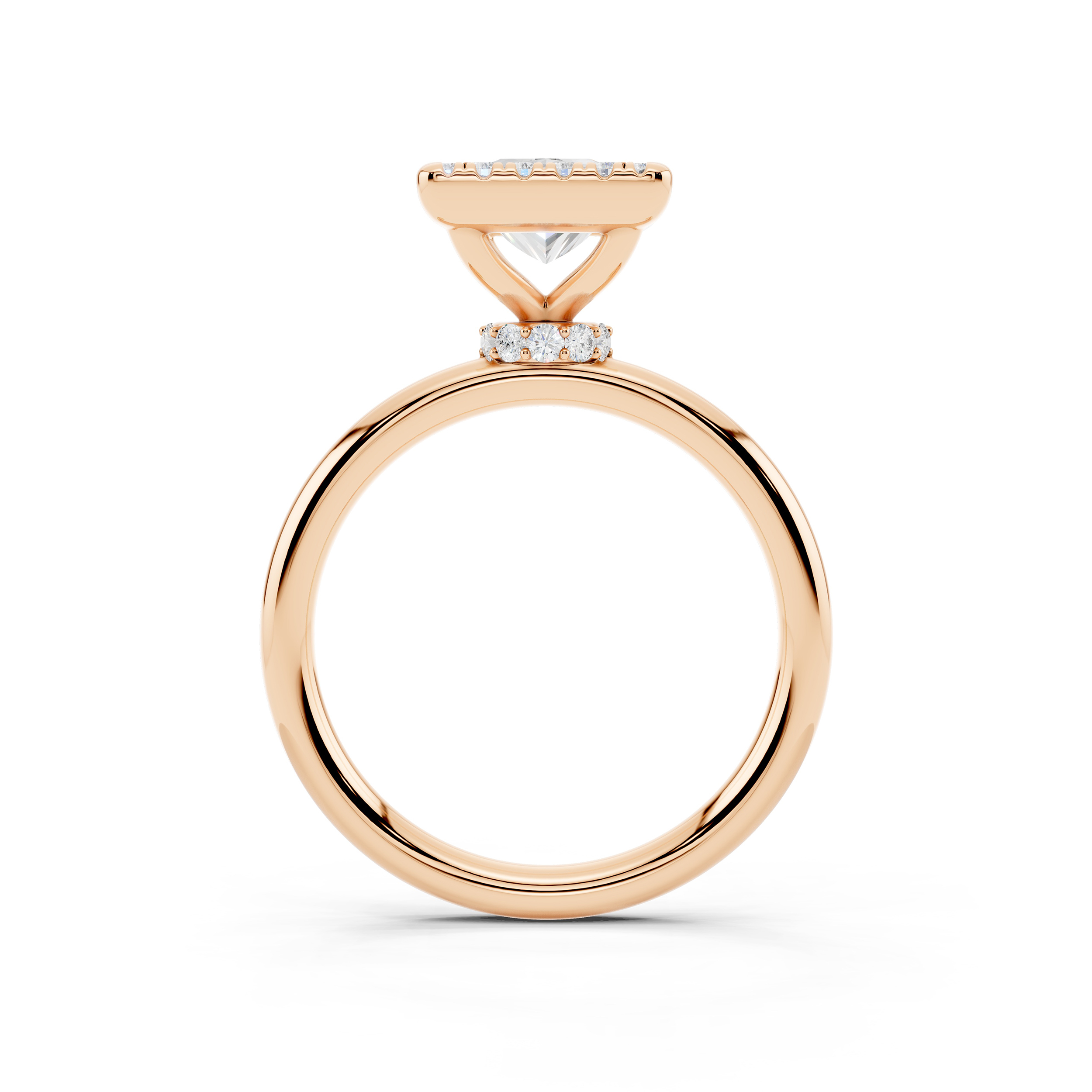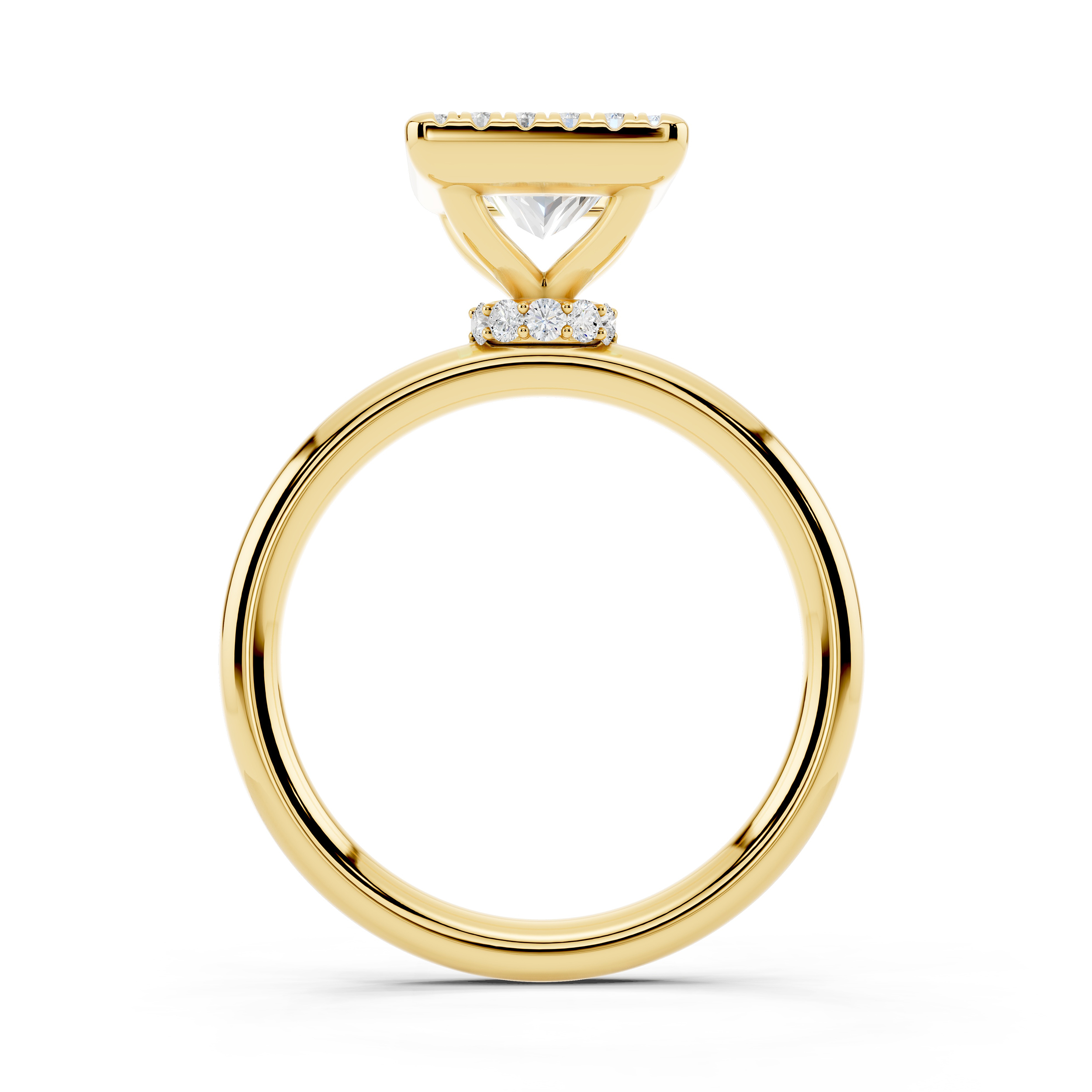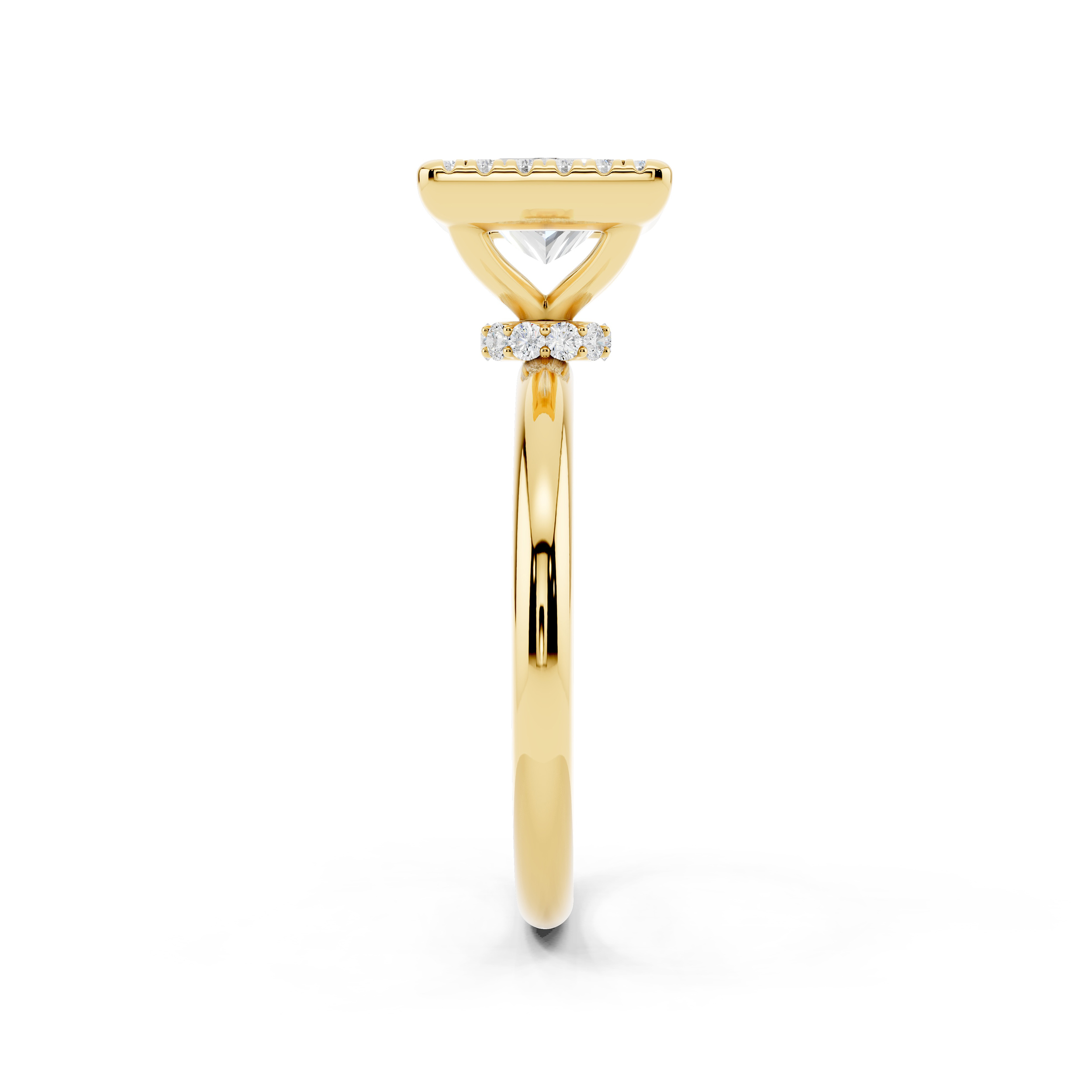 A bold square-cut center stone is framed by a halo of shimmering accents, all elevated on a delicately adorned gallery. With its clean lines and elevated profile, this ring blends geometric elegance with a touch of vintage charm.
