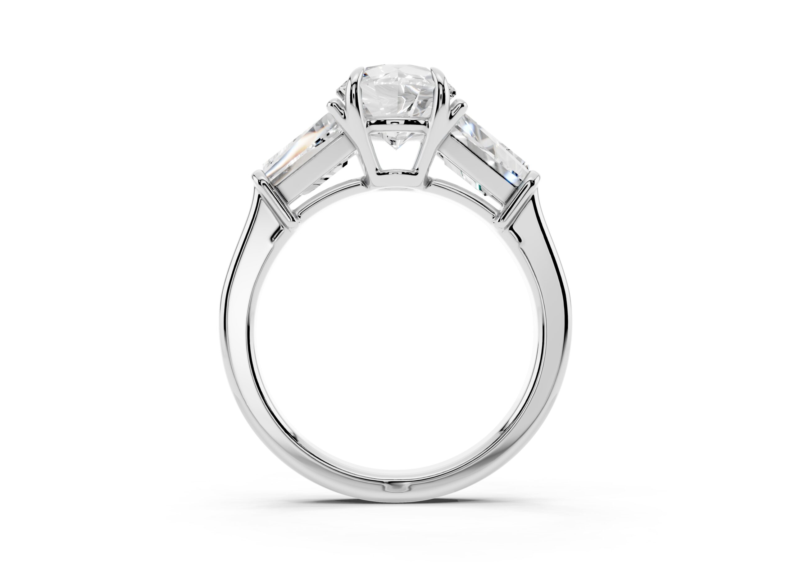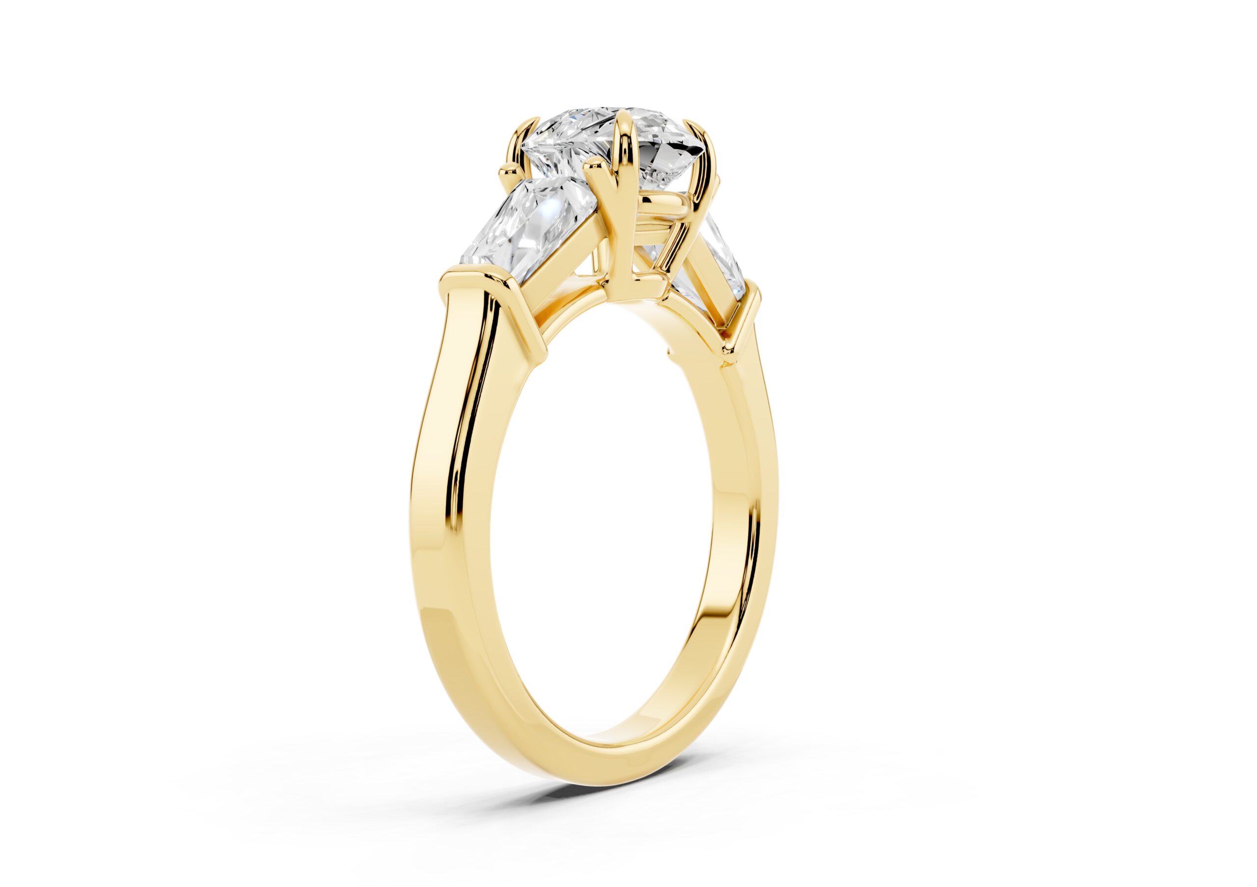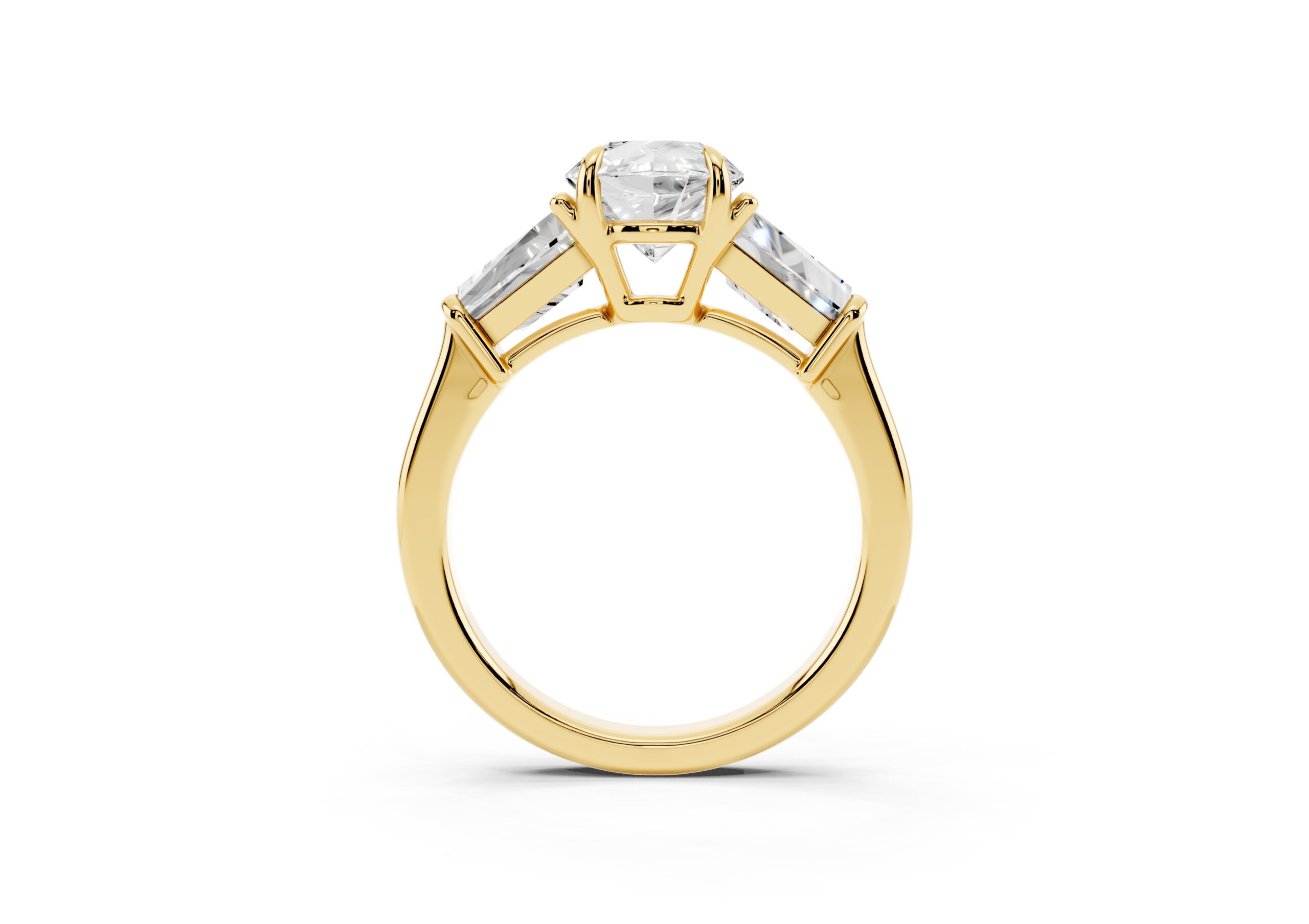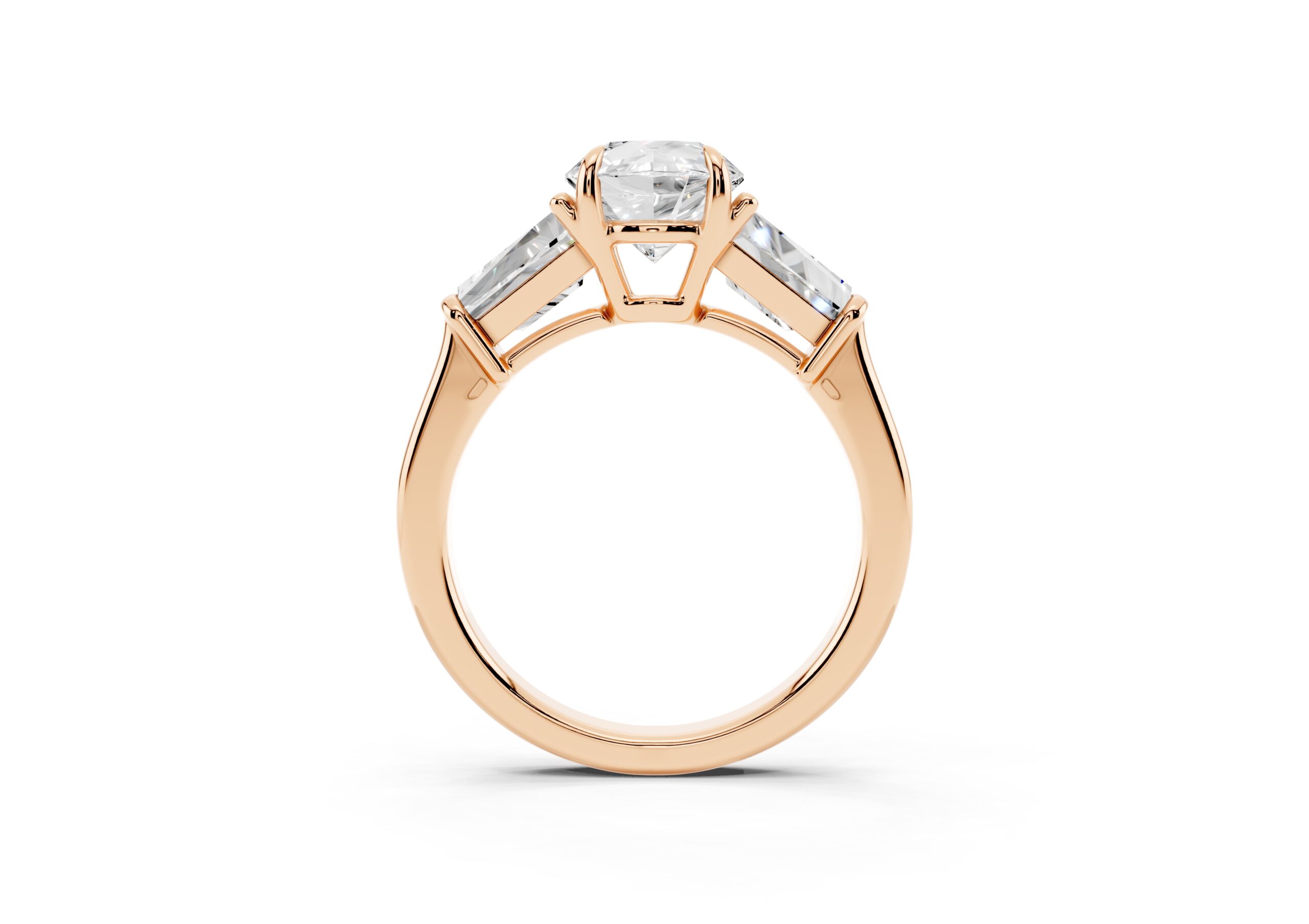 Bold in presence yet timeless in proportion, this three-stone ring features a striking round center stone flanked by tapered baguettes, creating a silhouette that’s both refined and commanding. The design balances brilliance and structure, offering a harmonious blend of softness and edge. Perfect for those who value clean lines, classic form, and unmistakable radiance.