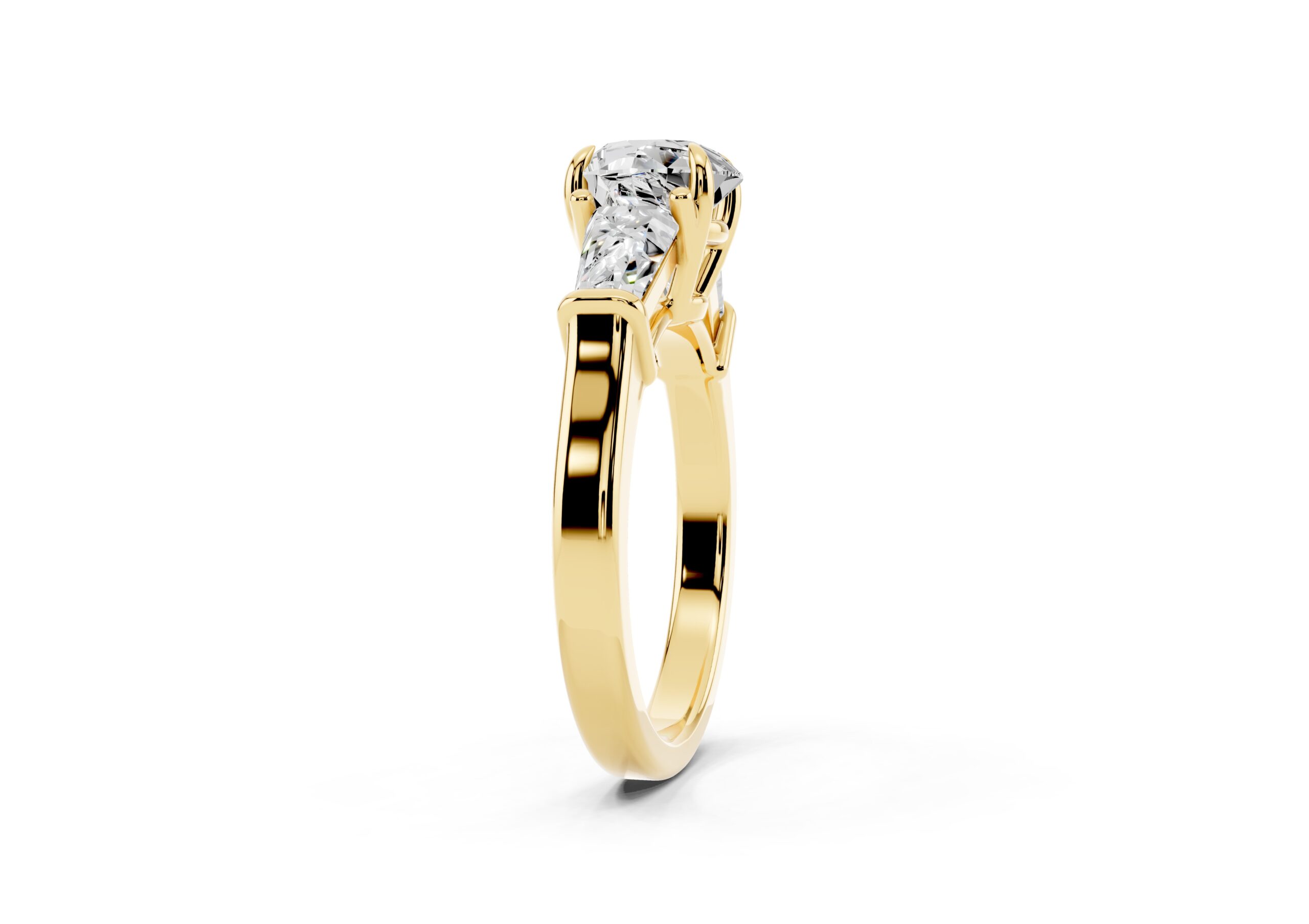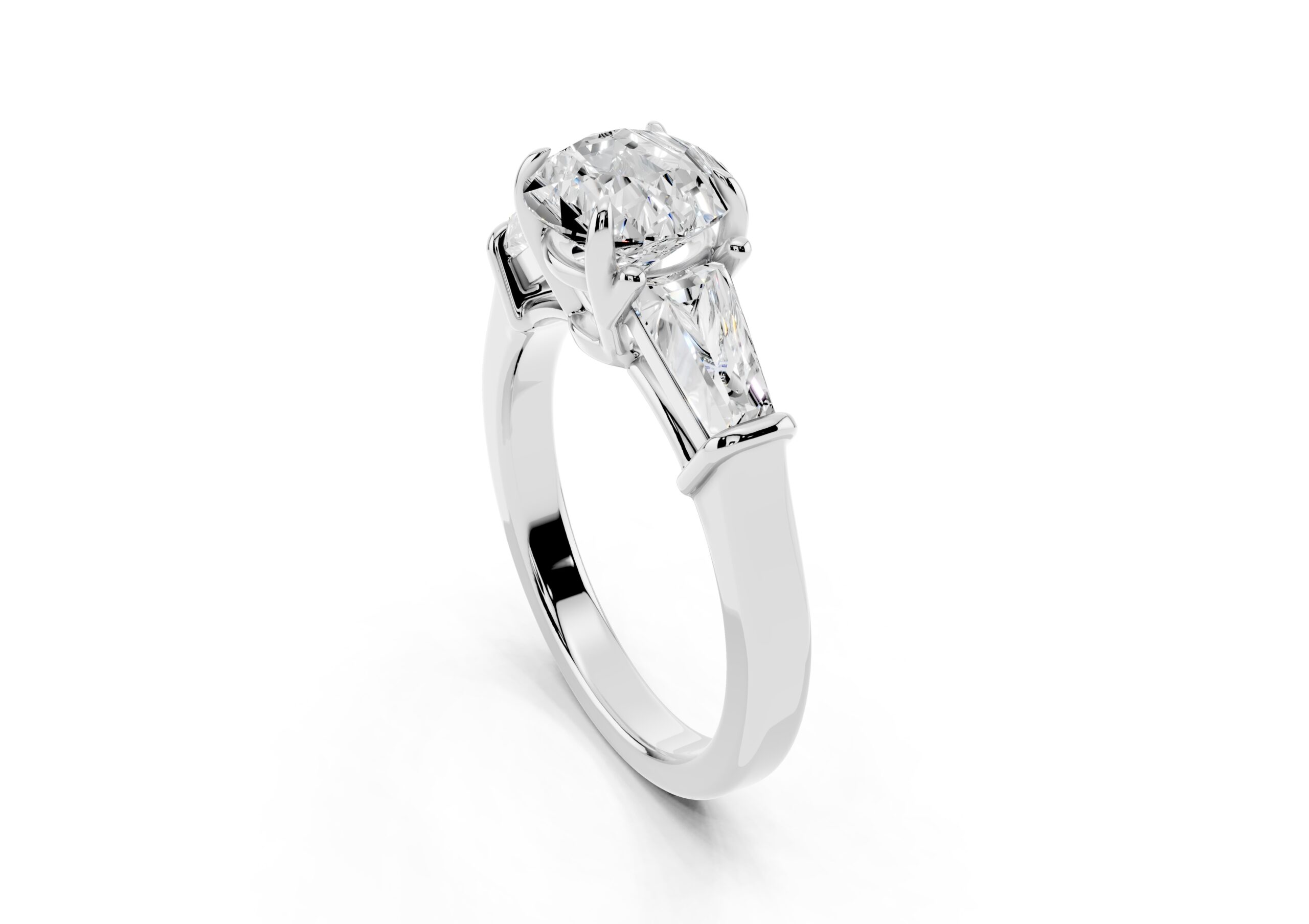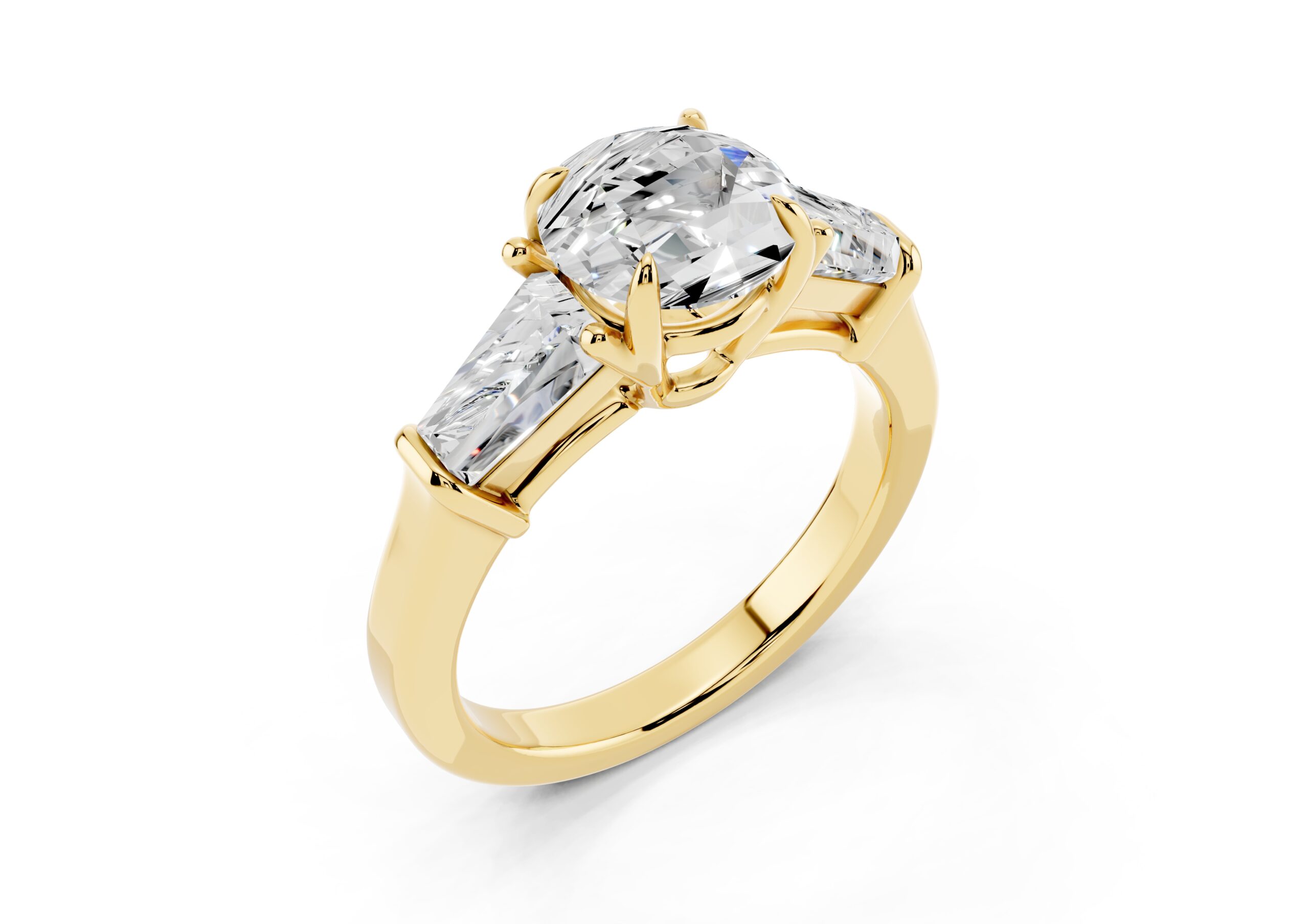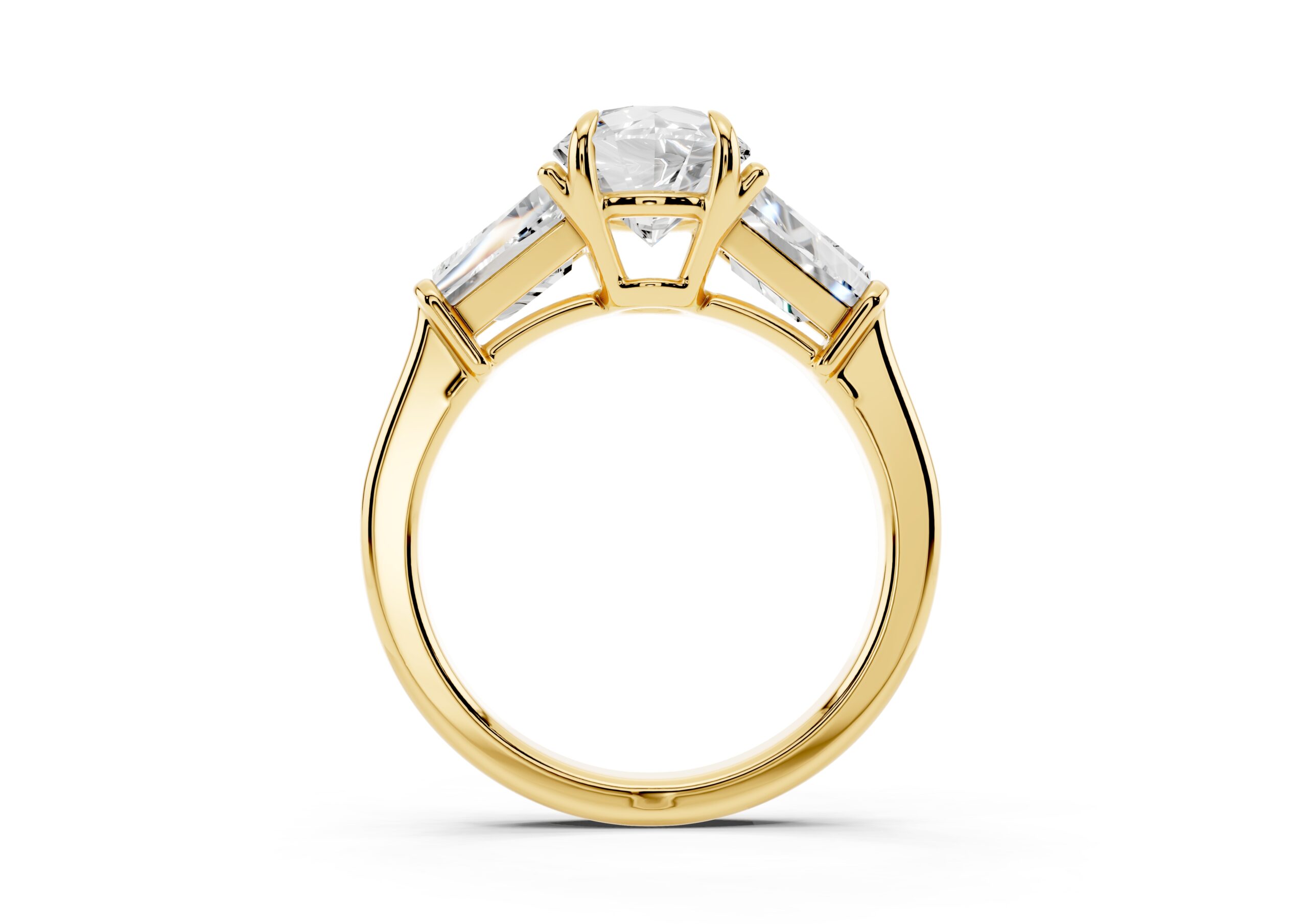 Bold in presence yet timeless in proportion, this three-stone ring features a striking round center stone flanked by tapered baguettes, creating a silhouette that’s both refined and commanding. The design balances brilliance and structure, offering a harmonious blend of softness and edge. Perfect for those who value clean lines, classic form, and unmistakable radiance.