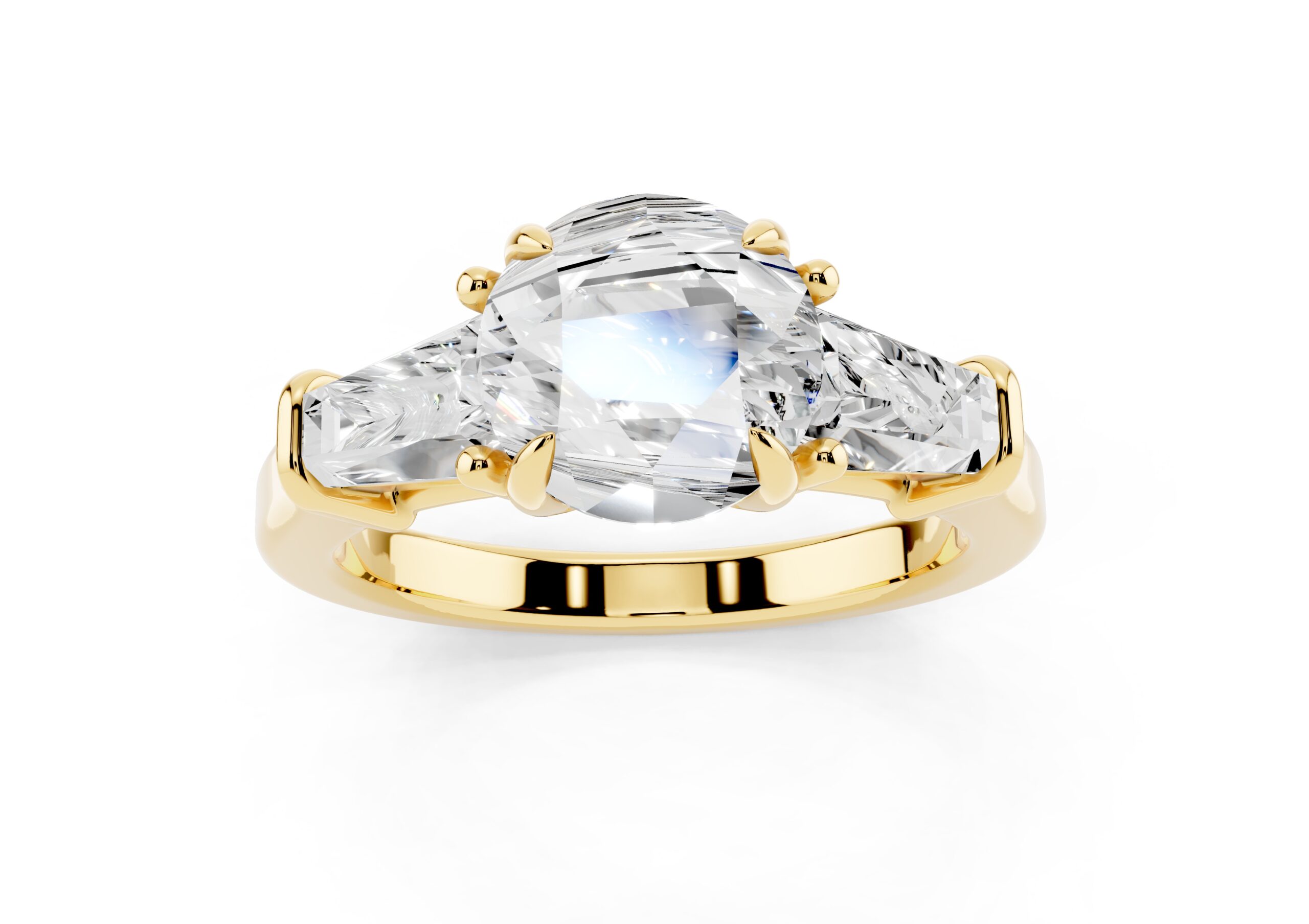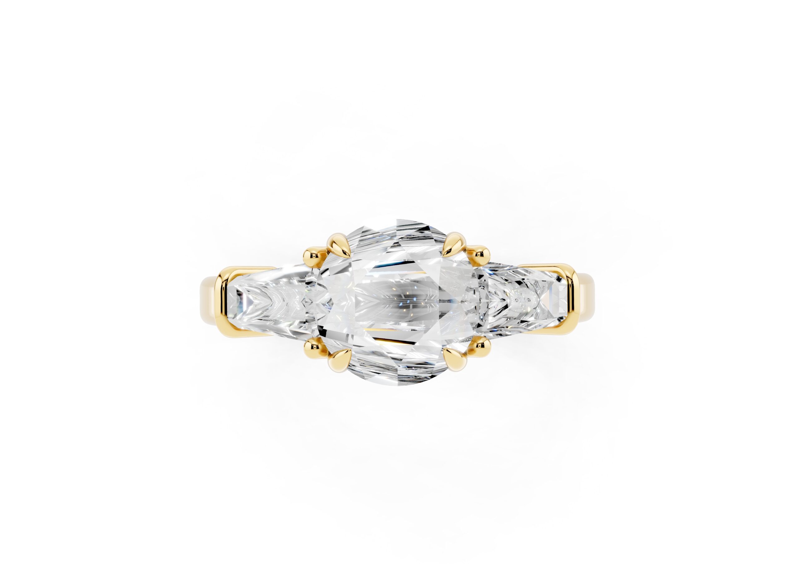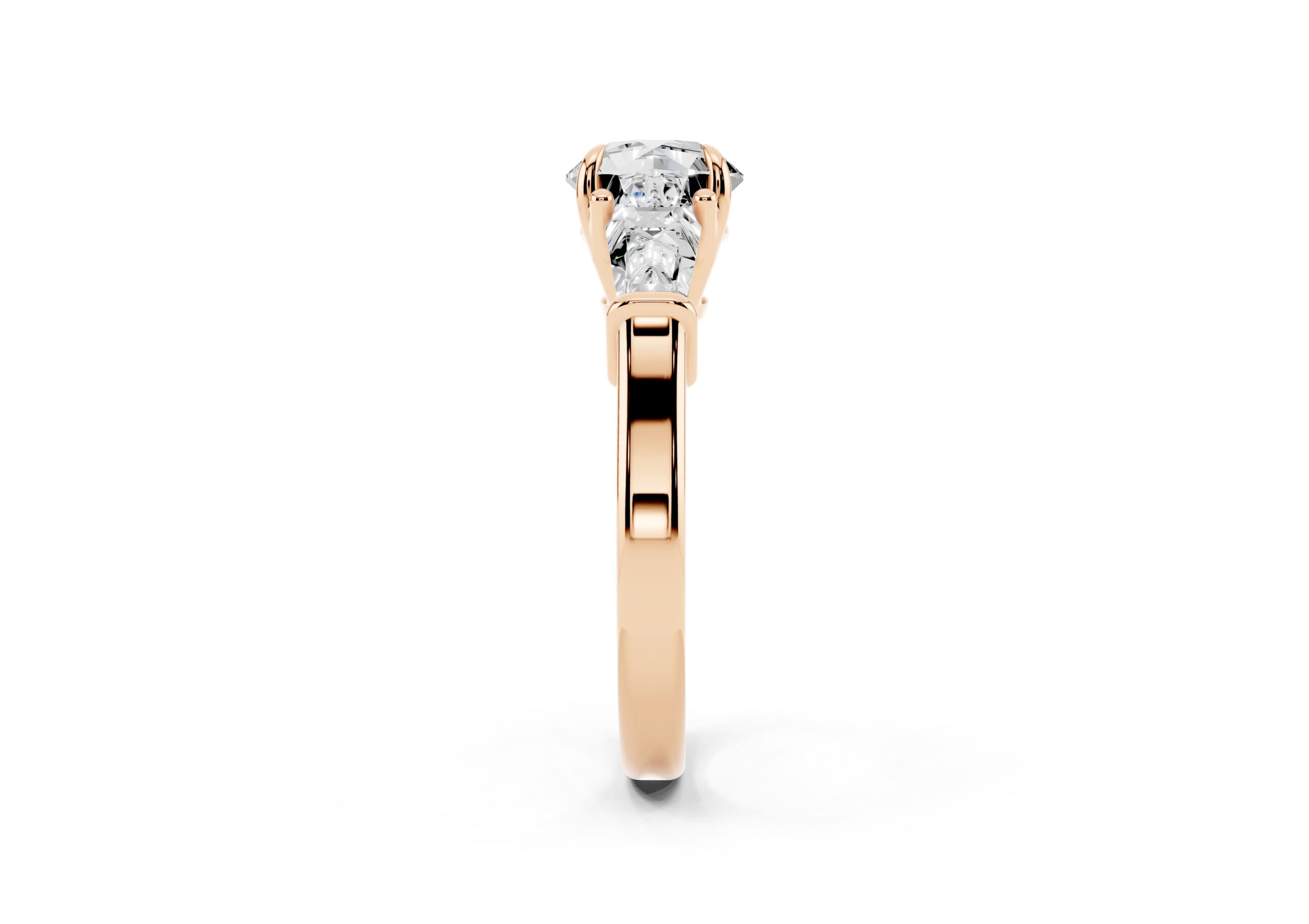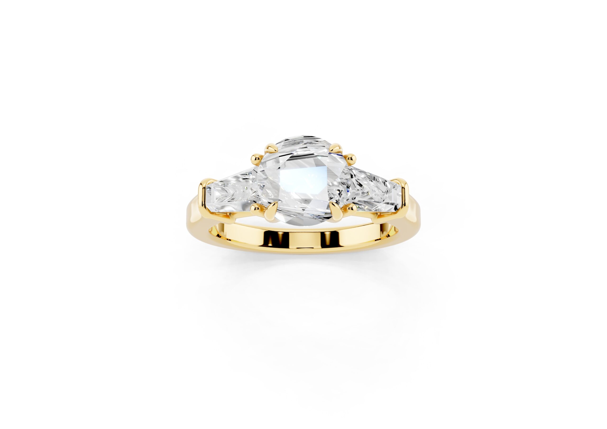Bold in presence yet timeless in proportion, this three-stone ring features a striking round center stone flanked by tapered baguettes, creating a silhouette that’s both refined and commanding. The design balances brilliance and structure, offering a harmonious blend of softness and edge. Perfect for those who value clean lines, classic form, and unmistakable radiance.