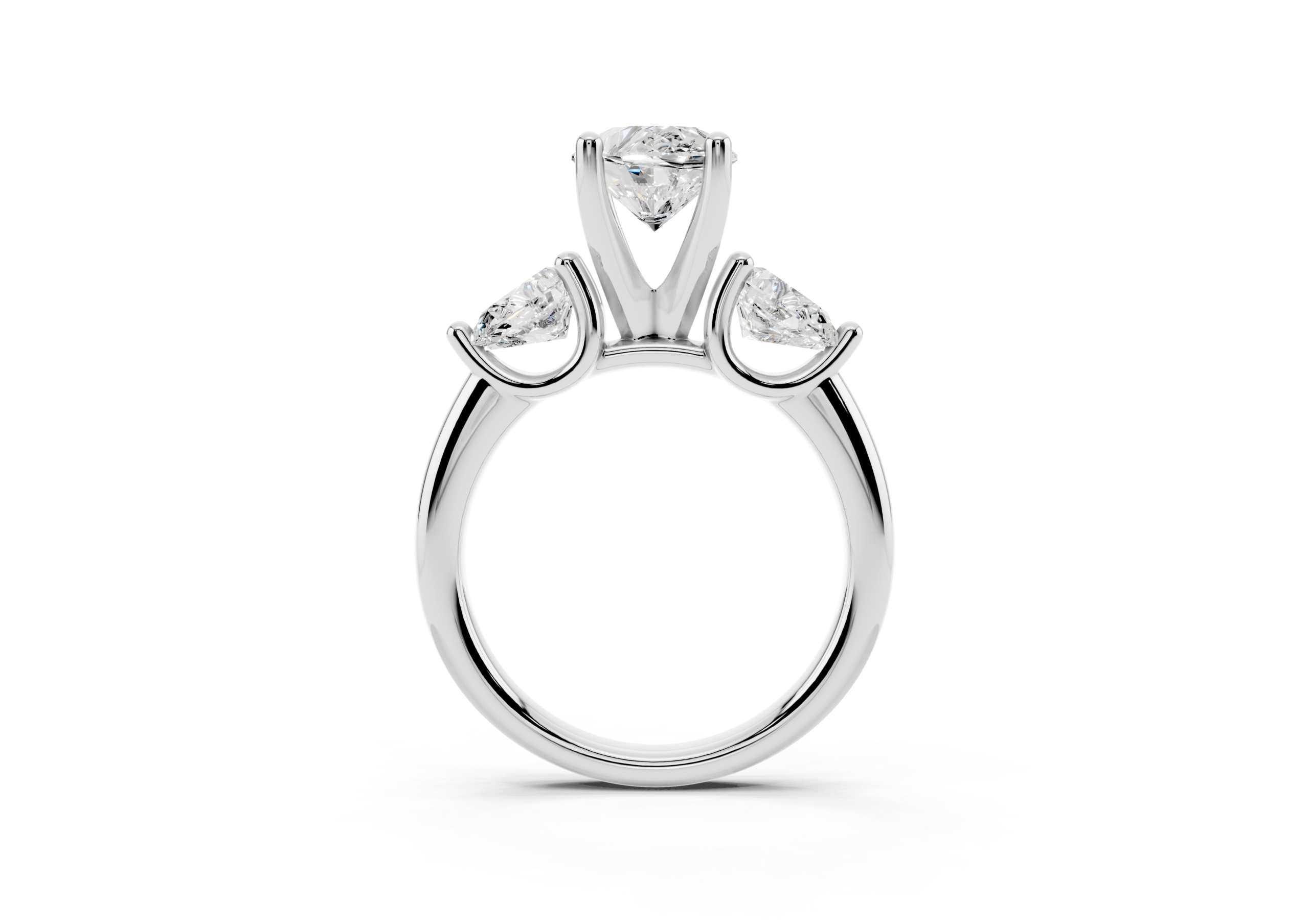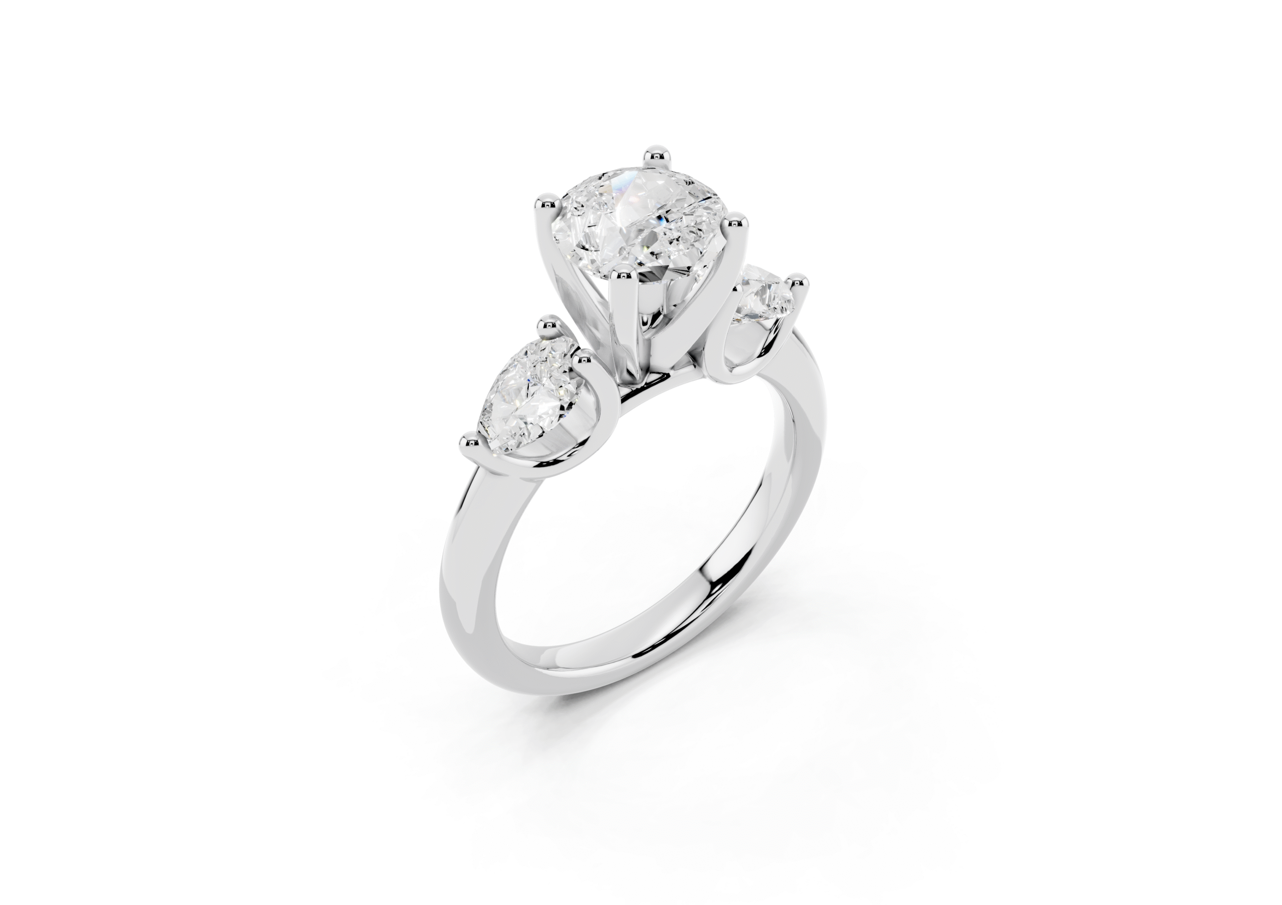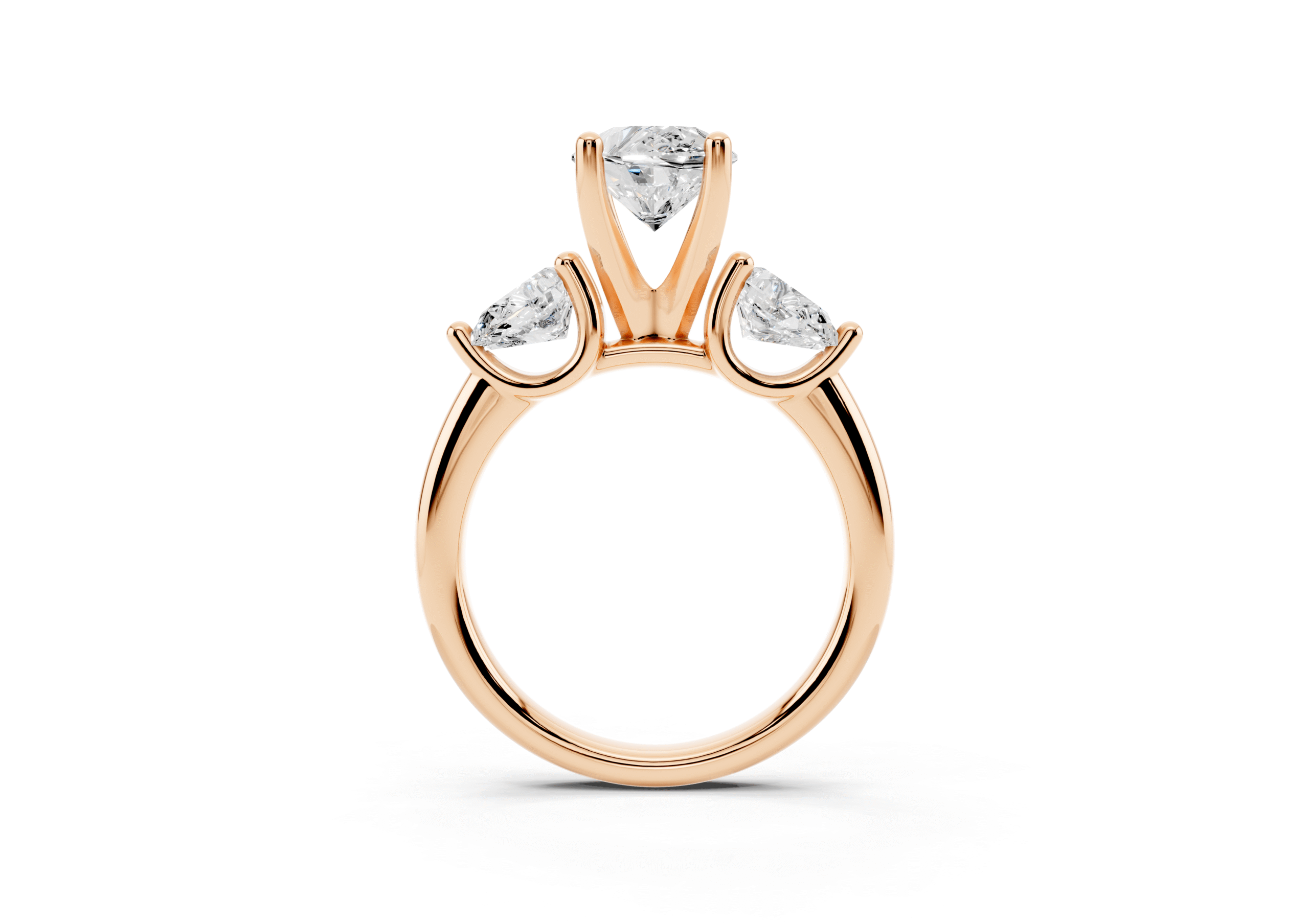 A graceful three-stone ring showcasing a brilliant round center stone complemented by two pear-shaped side stones. The soft tapering of the pears draws the eye inward, creating a balanced, elegant profile that captures timeless romance and contemporary sophistication.