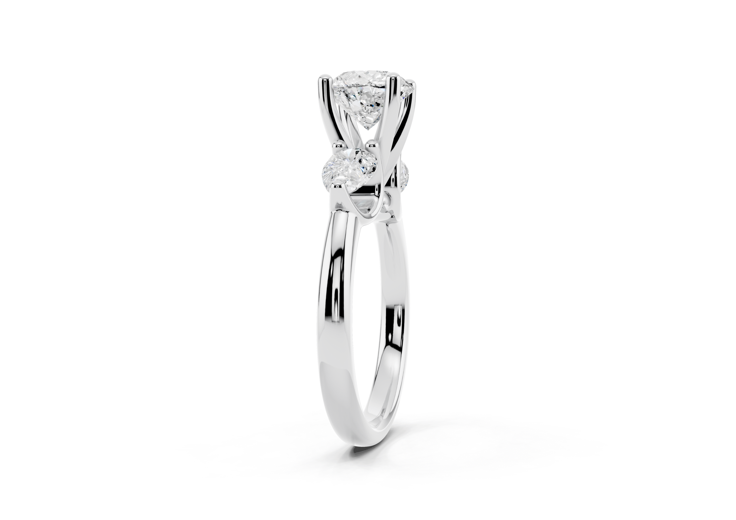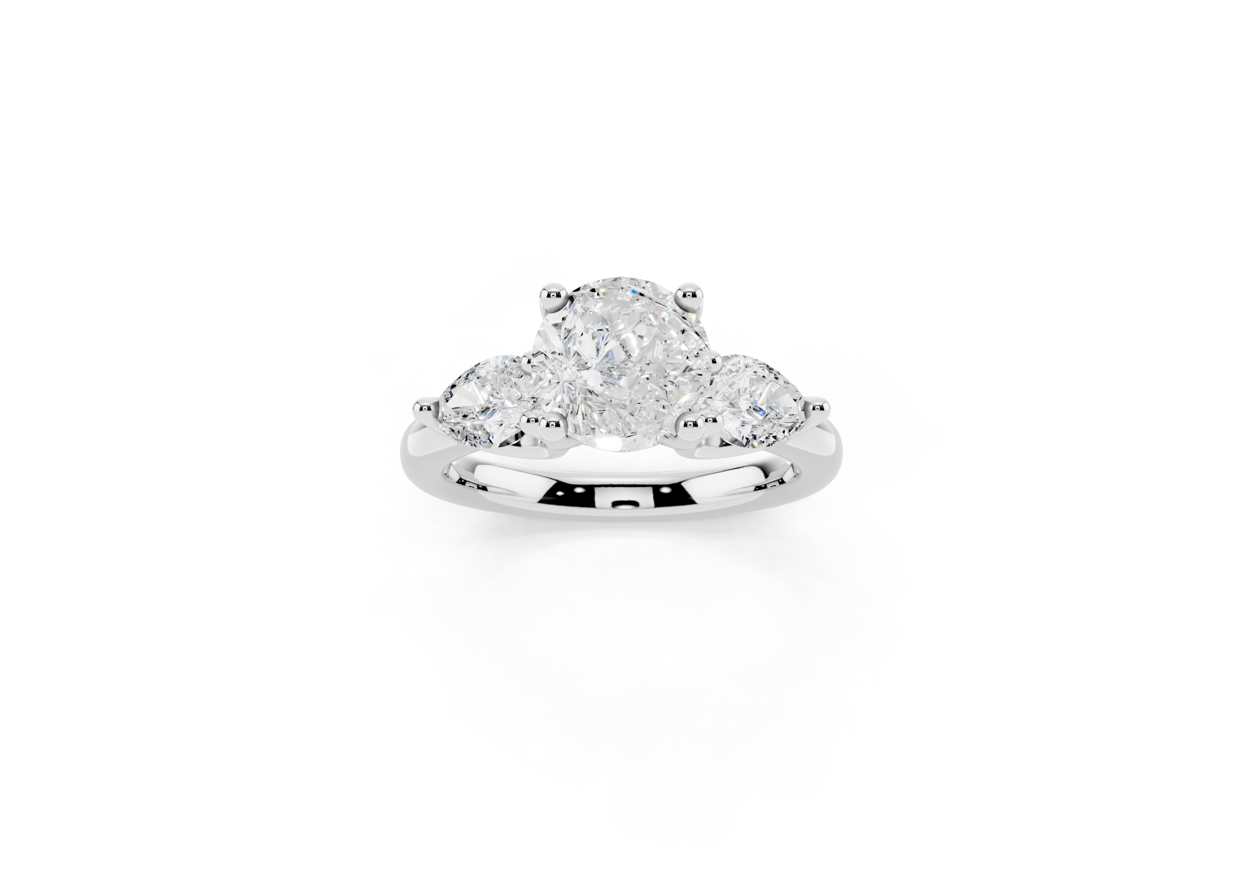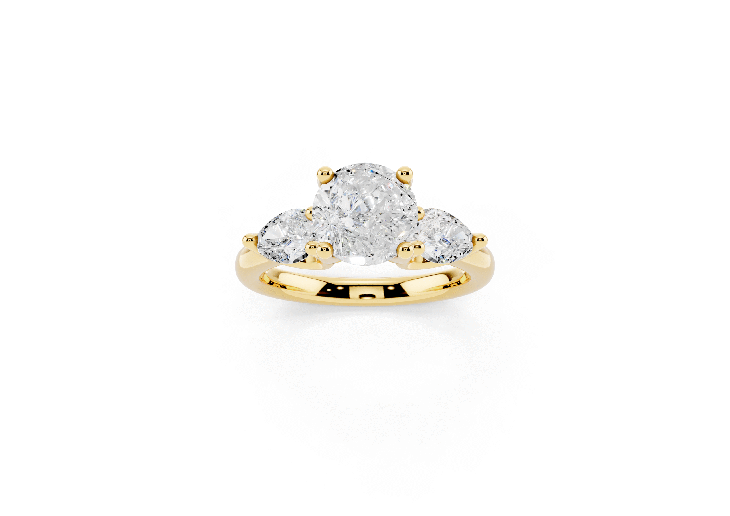 A graceful three-stone ring showcasing a brilliant round center stone complemented by two pear-shaped side stones. The soft tapering of the pears draws the eye inward, creating a balanced, elegant profile that captures timeless romance and contemporary sophistication.