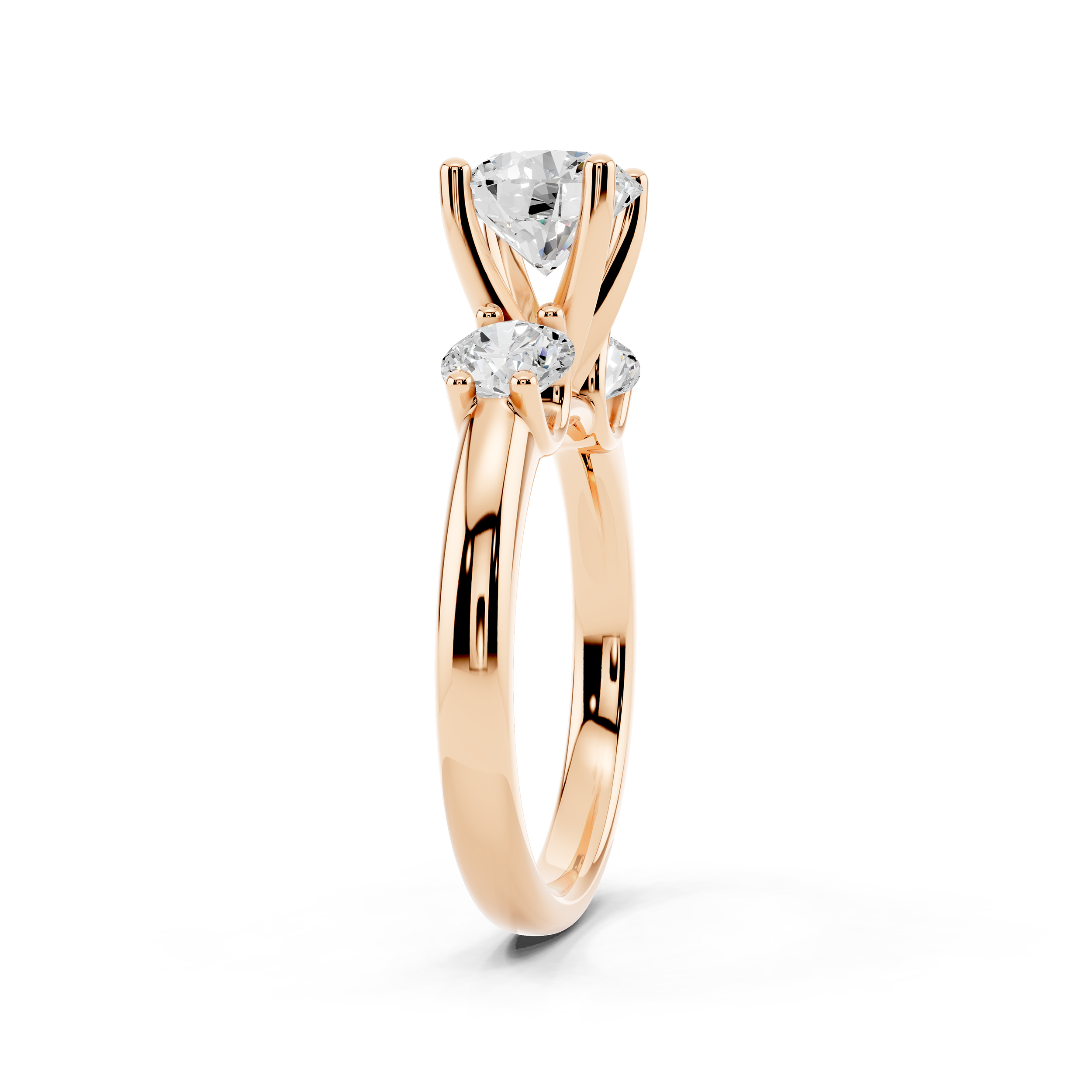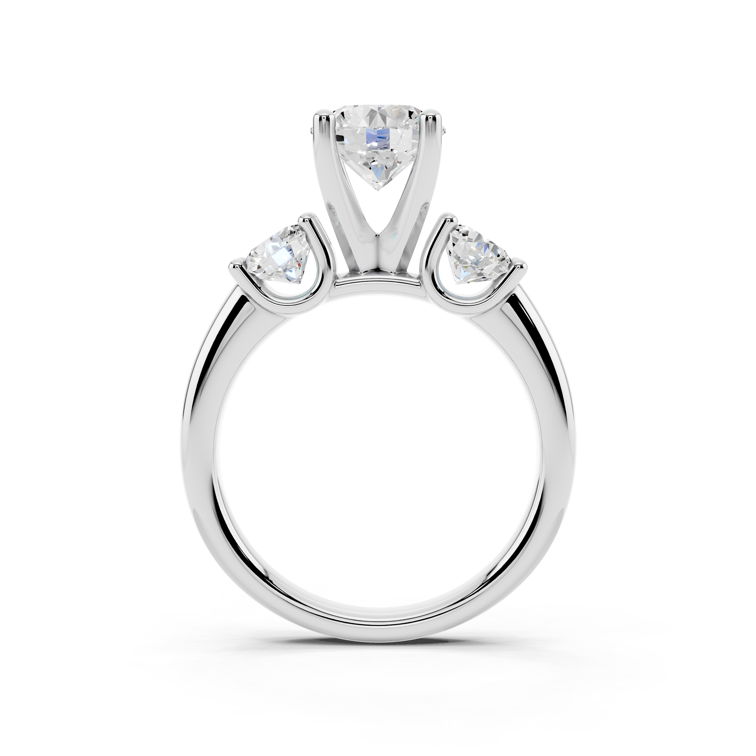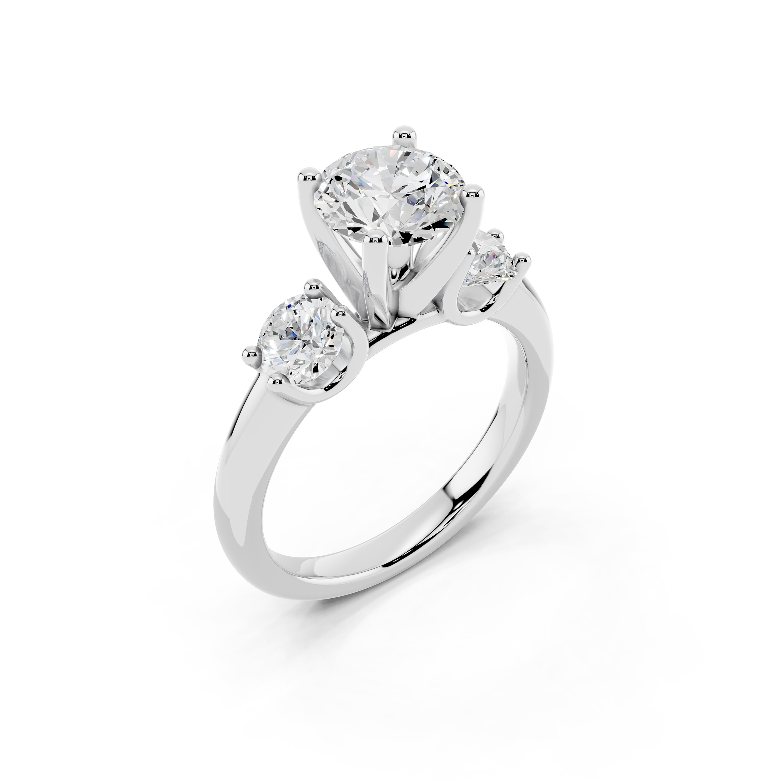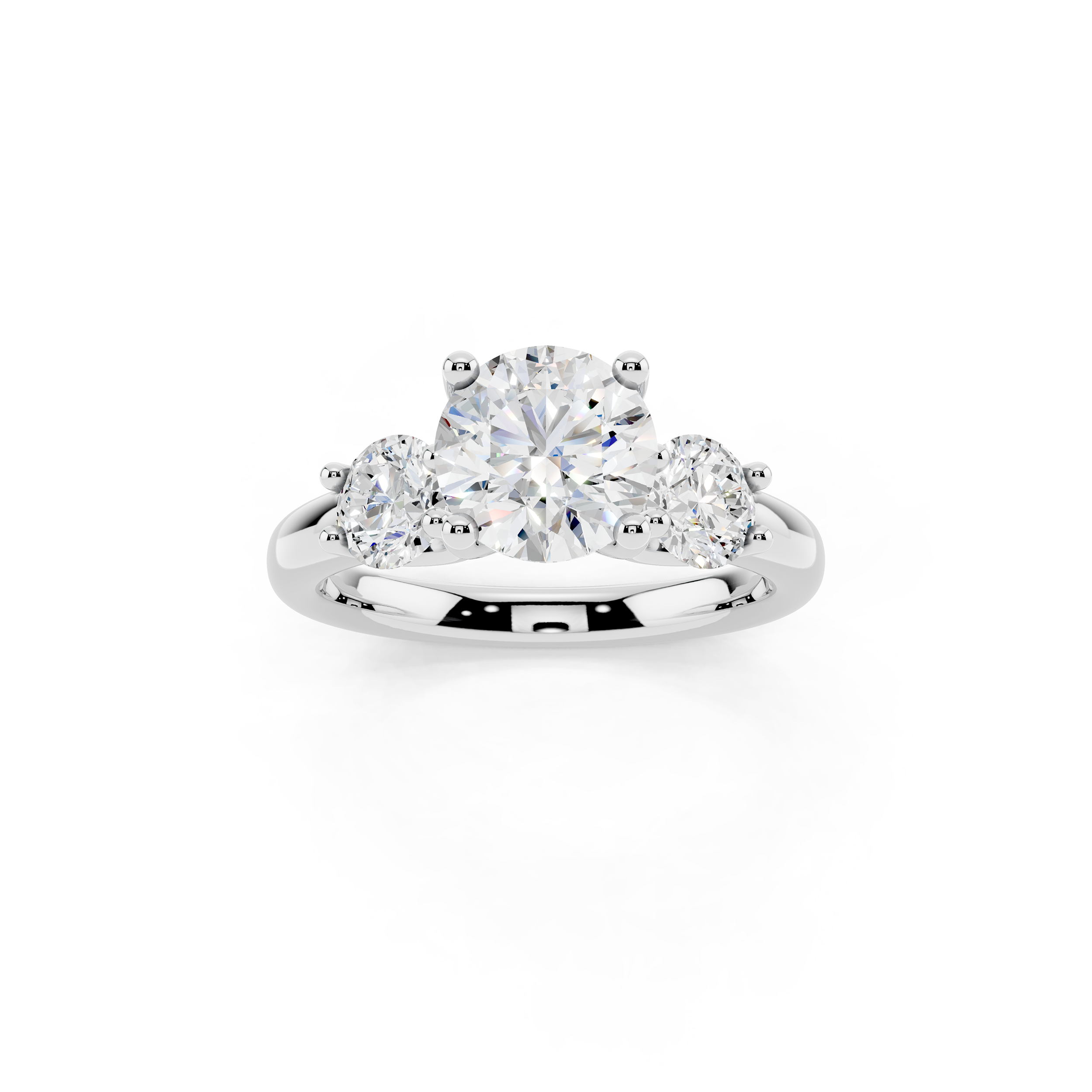 A timeless design featuring a brilliant trio of round stones—one central and two slightly smaller side stones—set in a sleek, open-prong arrangement. This ring symbolizes the past, present, and future, making it a meaningful and elegant choice for any milestone.