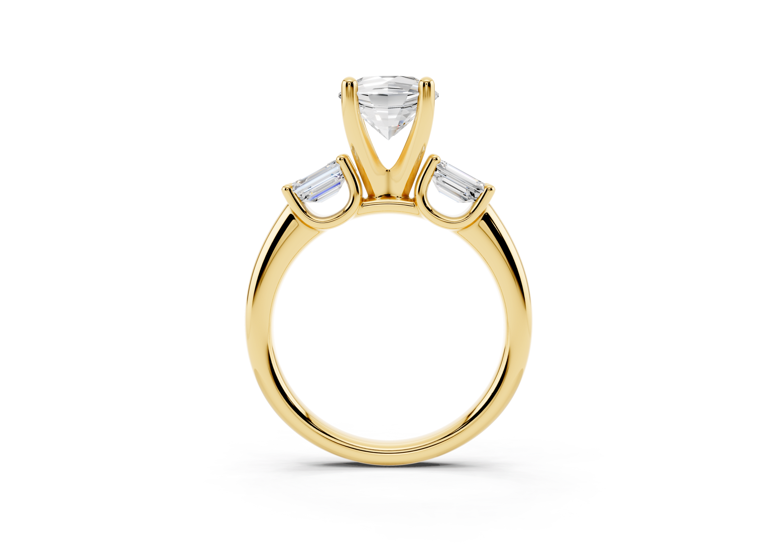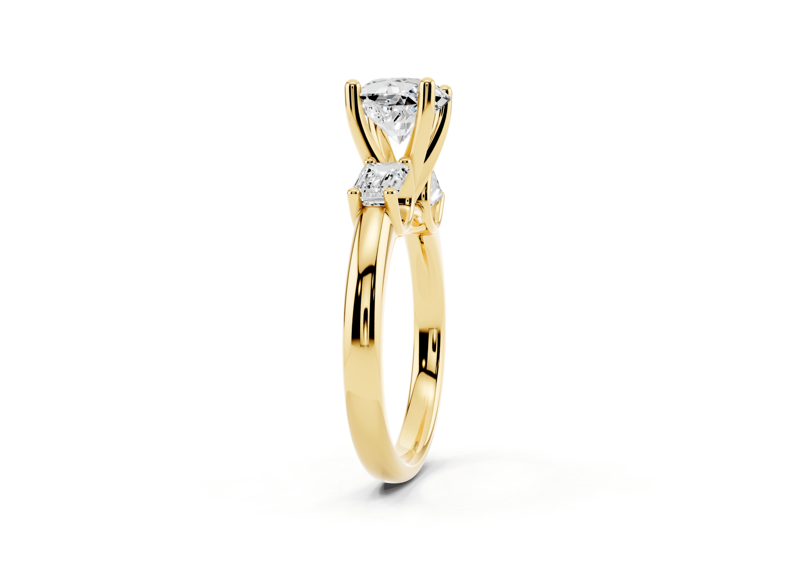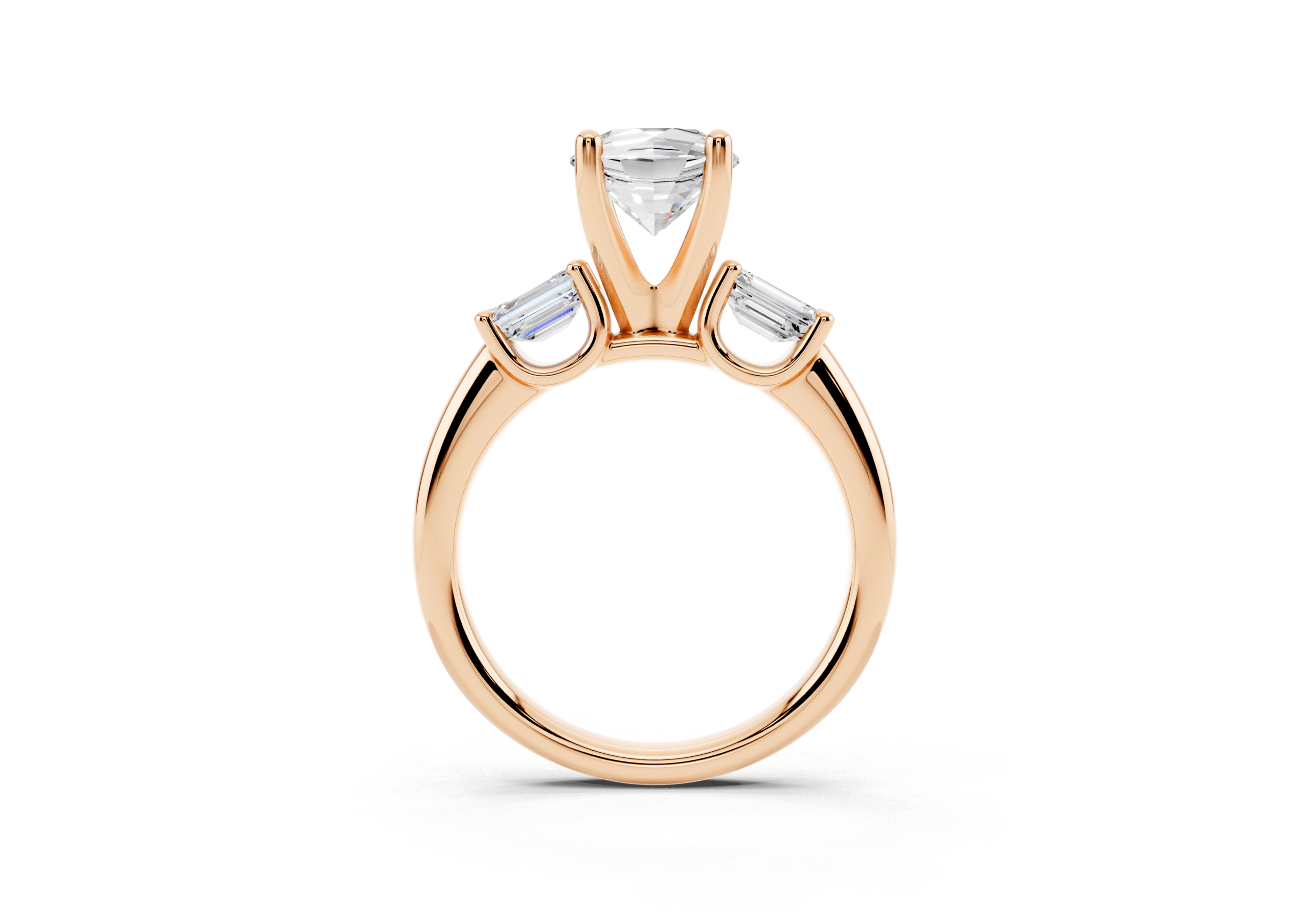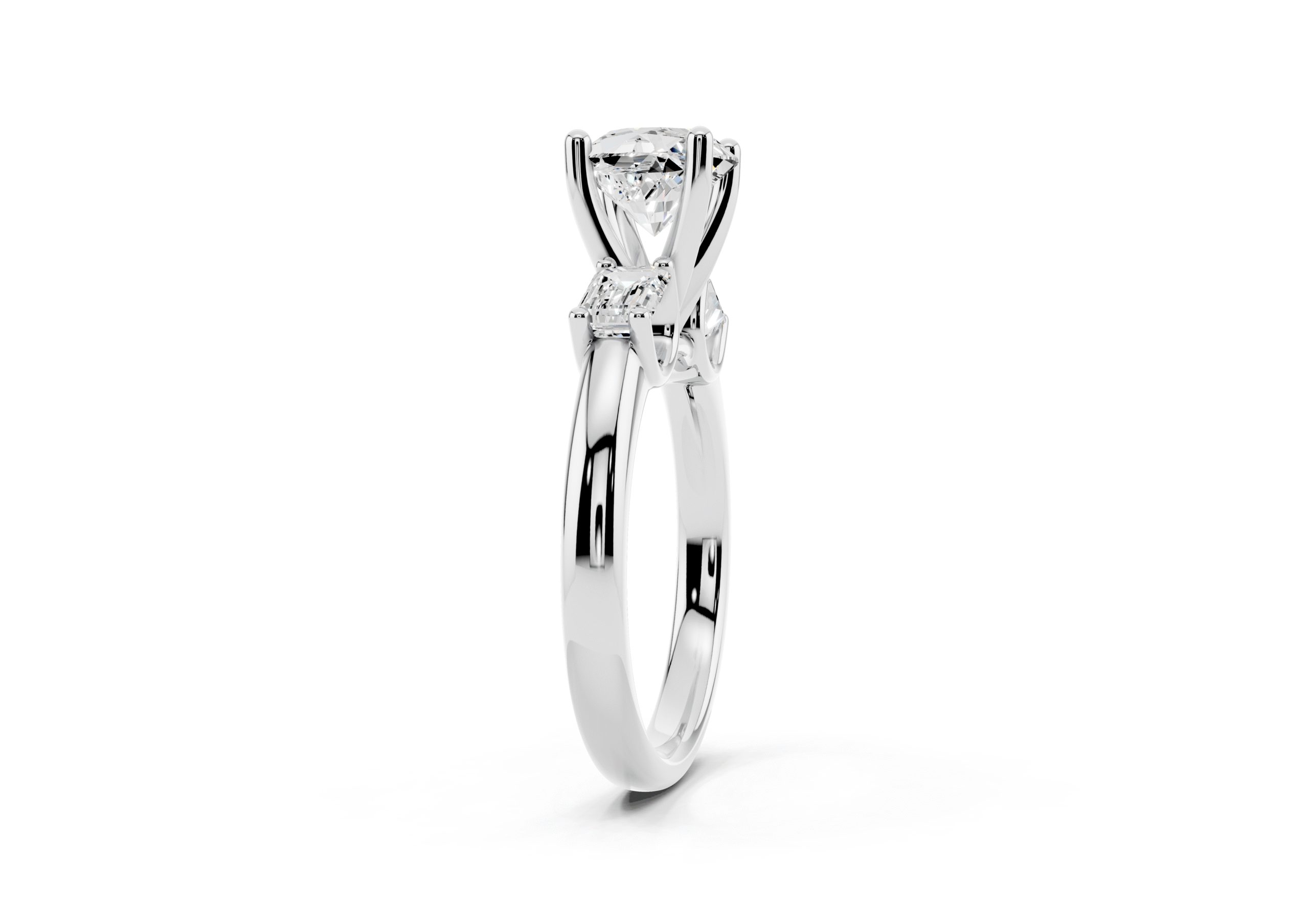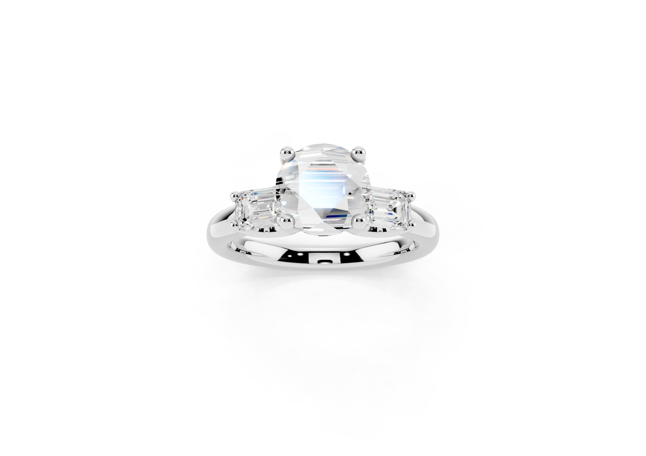 A sophisticated three-stone ring featuring a brilliant round center stone paired with step-cut emerald side stones. The clean geometry of the emerald cuts contrasts beautifully with the round center, offering a perfect balance of classic sparkle and structured elegance.