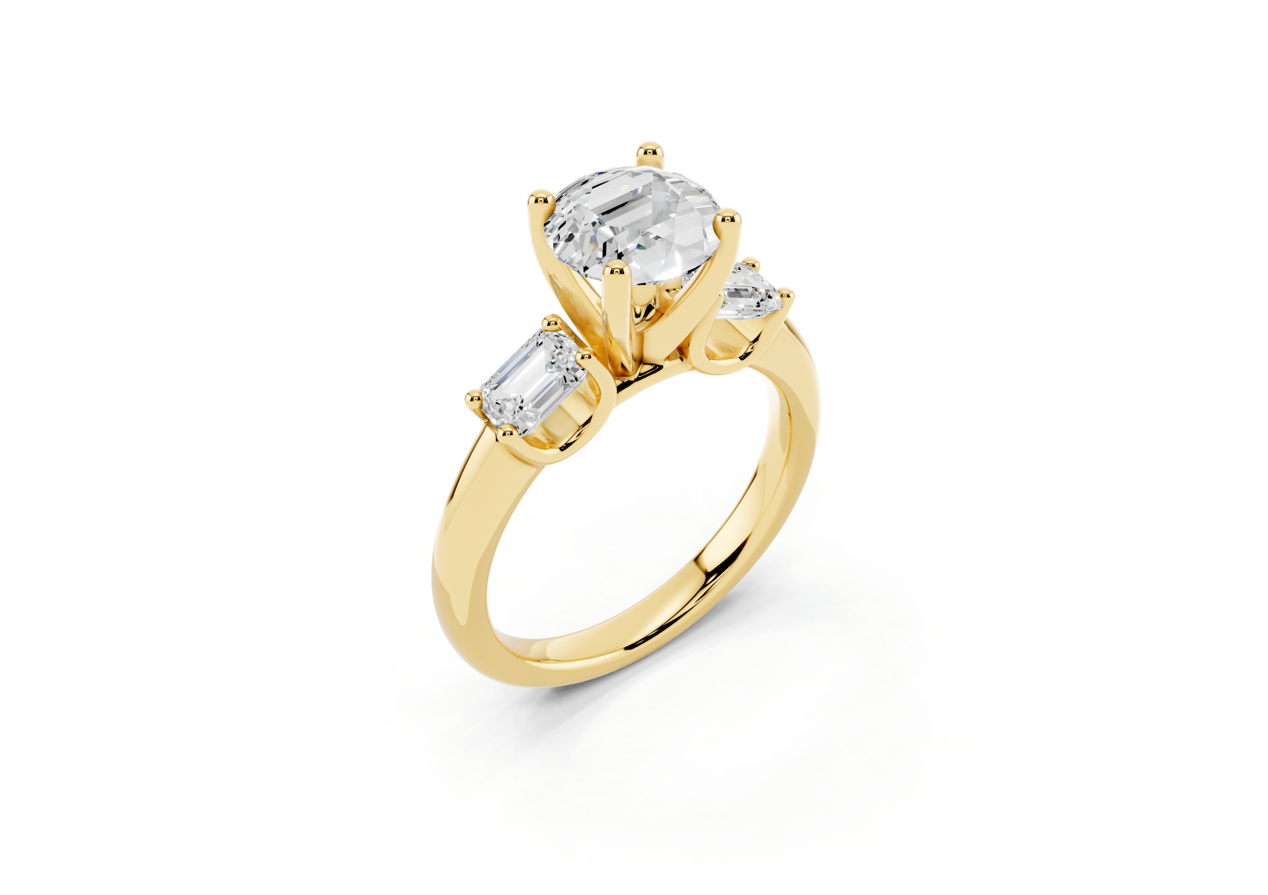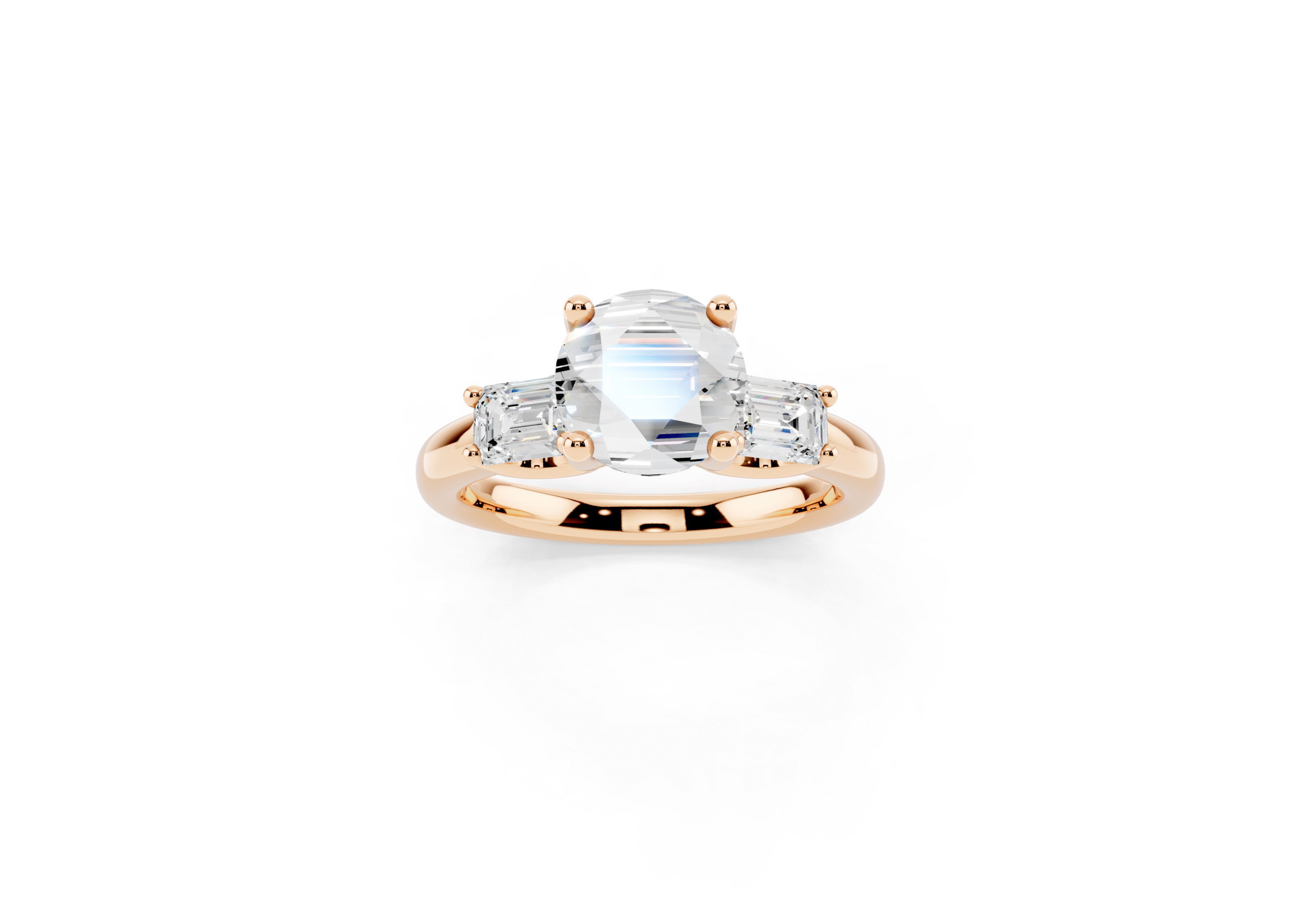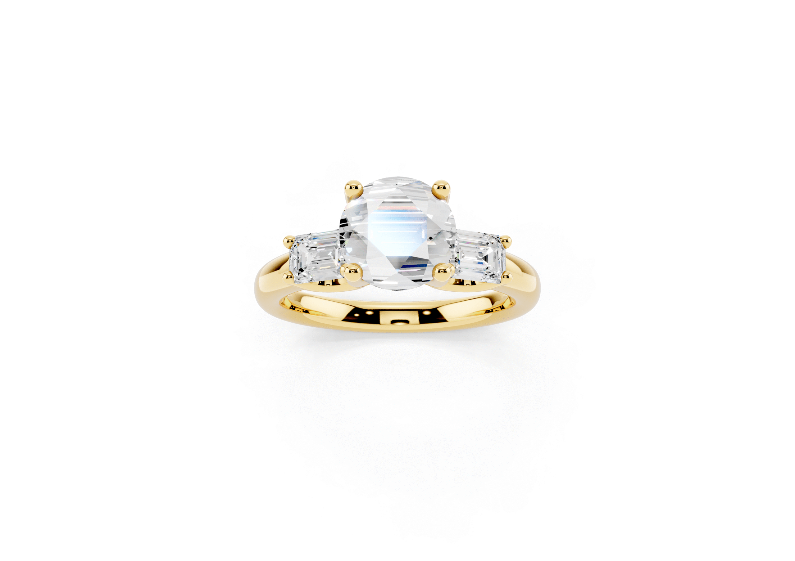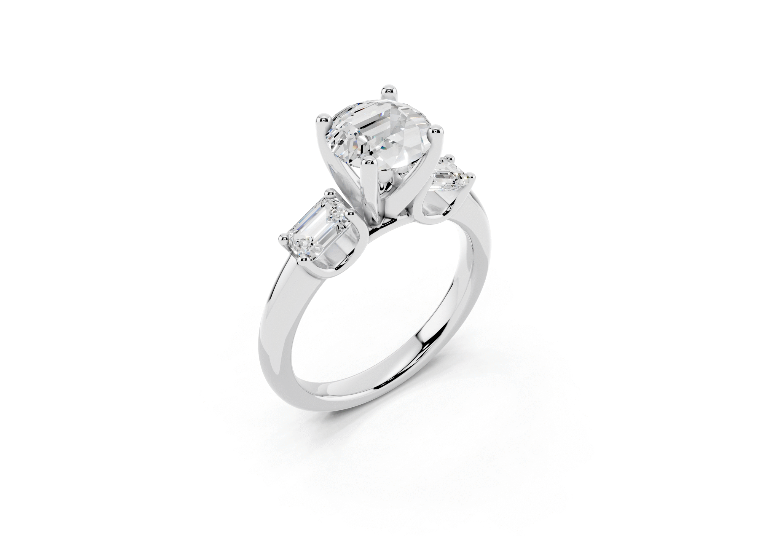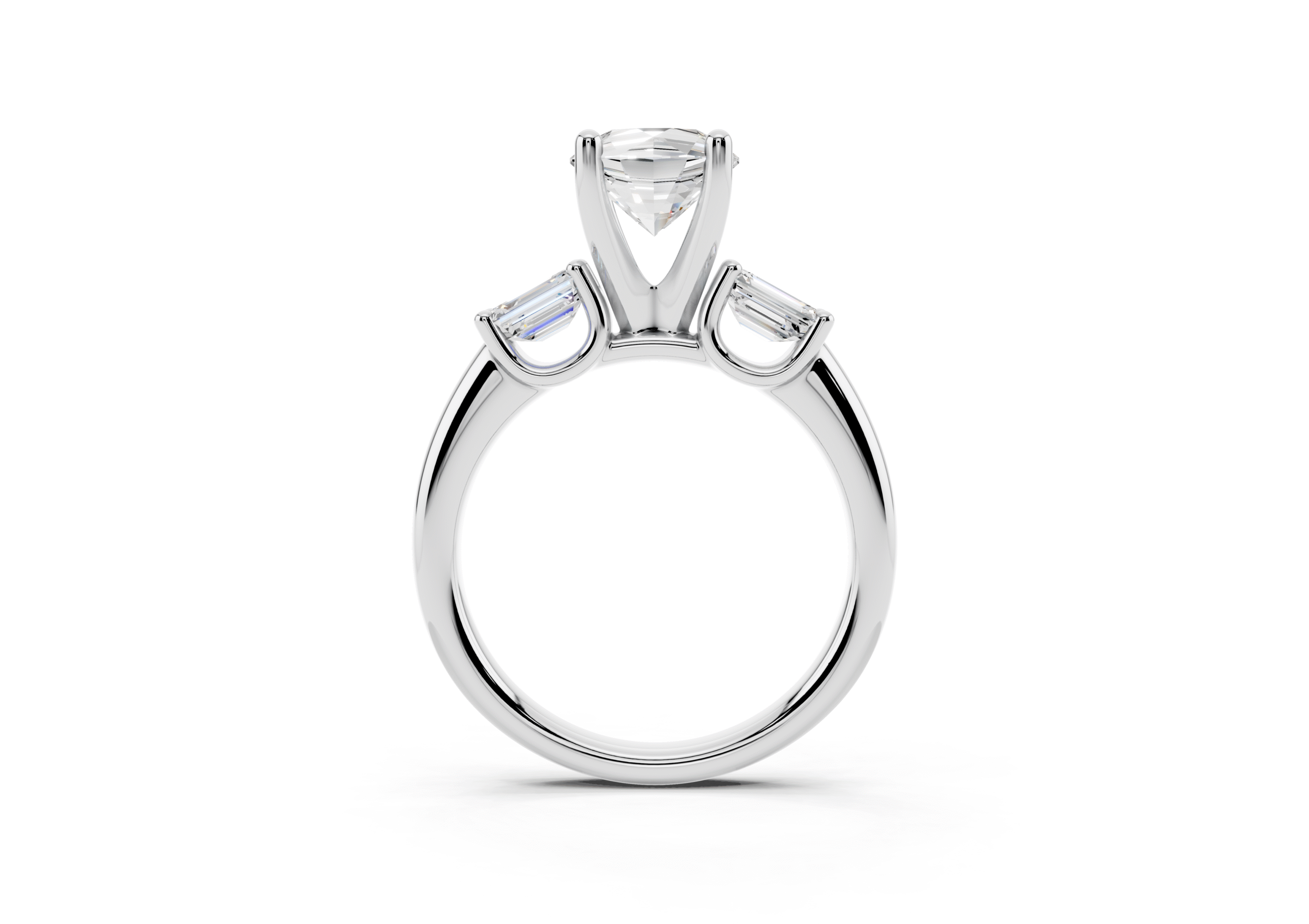 A sophisticated three-stone ring featuring a brilliant round center stone paired with step-cut emerald side stones. The clean geometry of the emerald cuts contrasts beautifully with the round center, offering a perfect balance of classic sparkle and structured elegance.