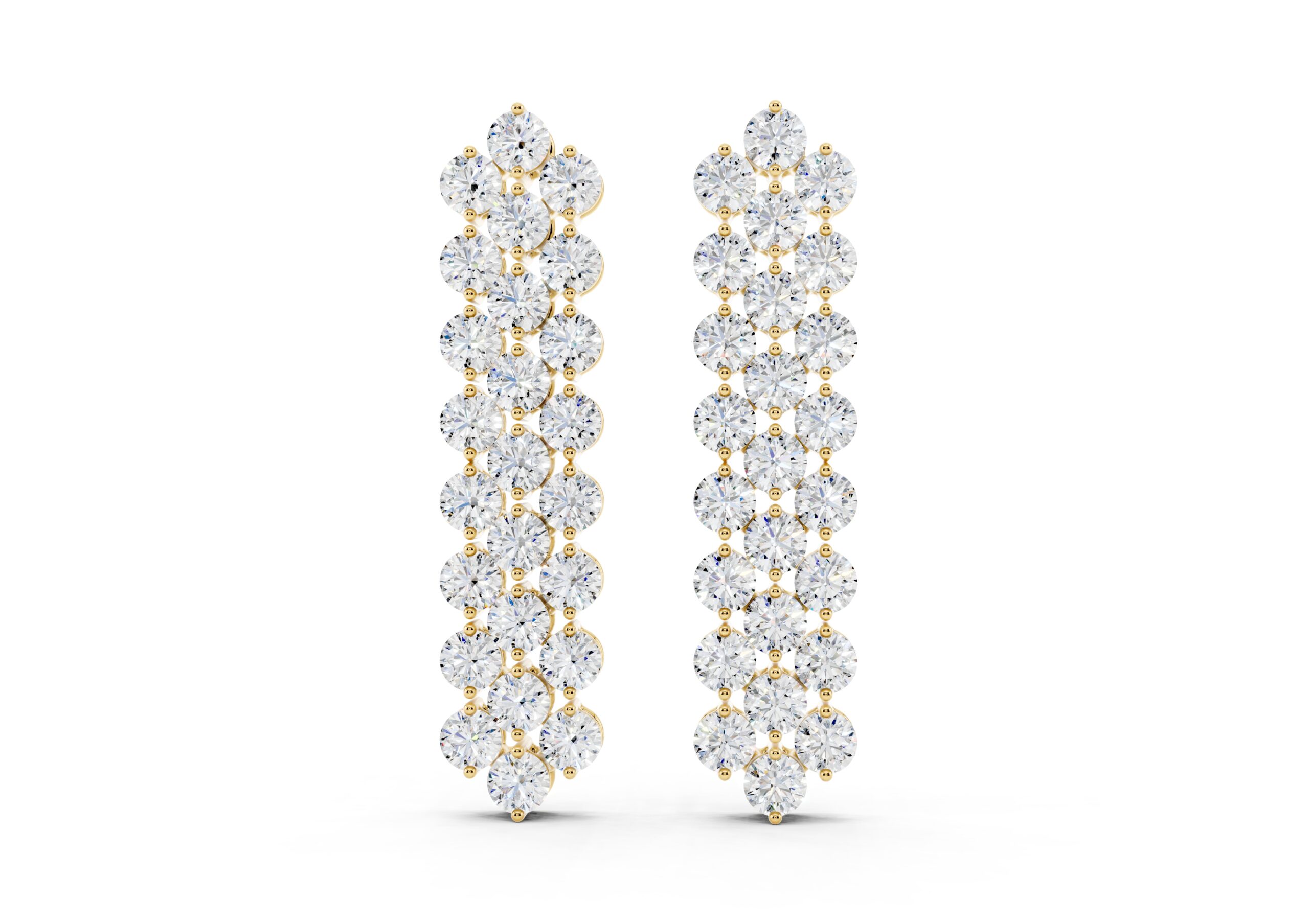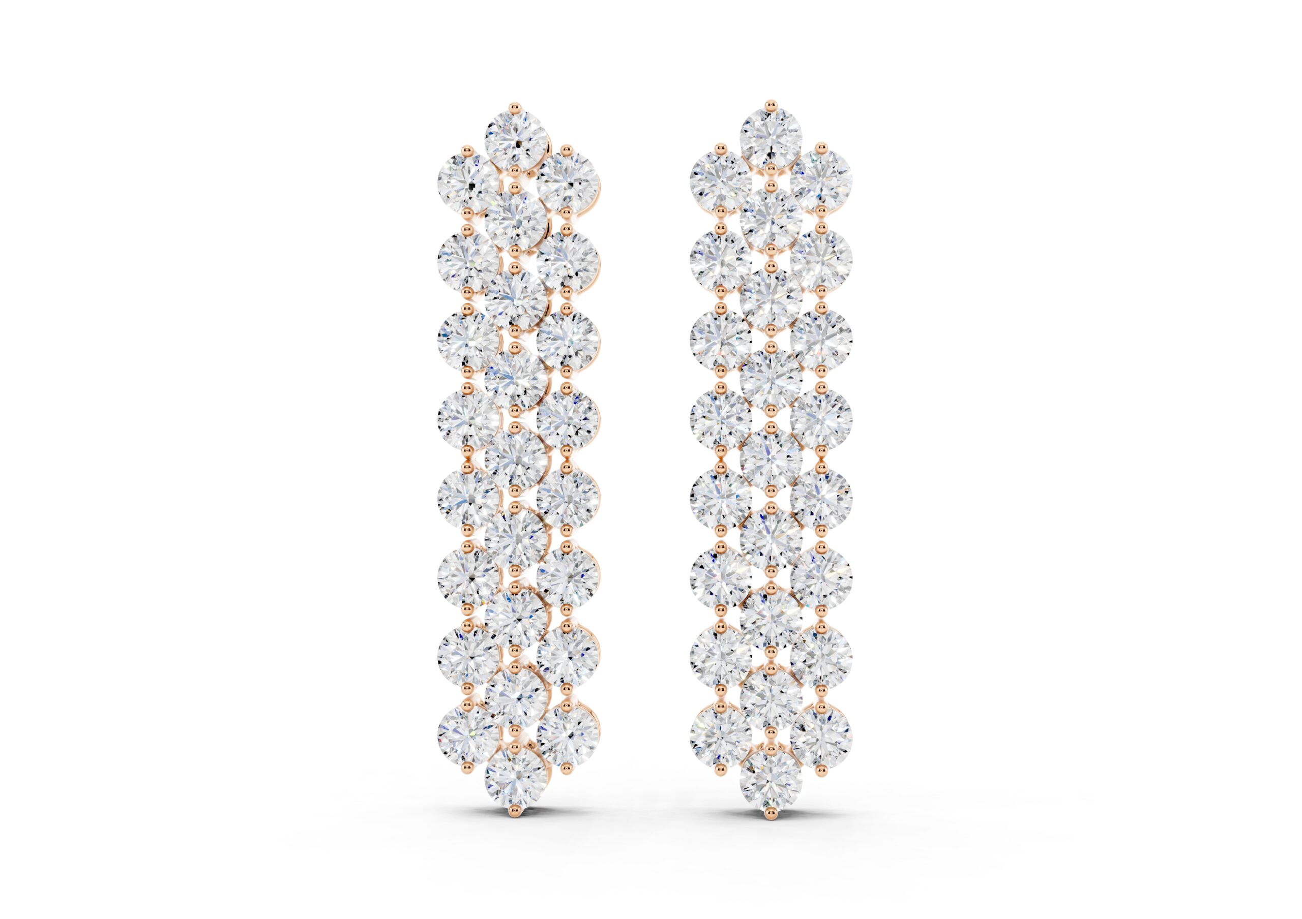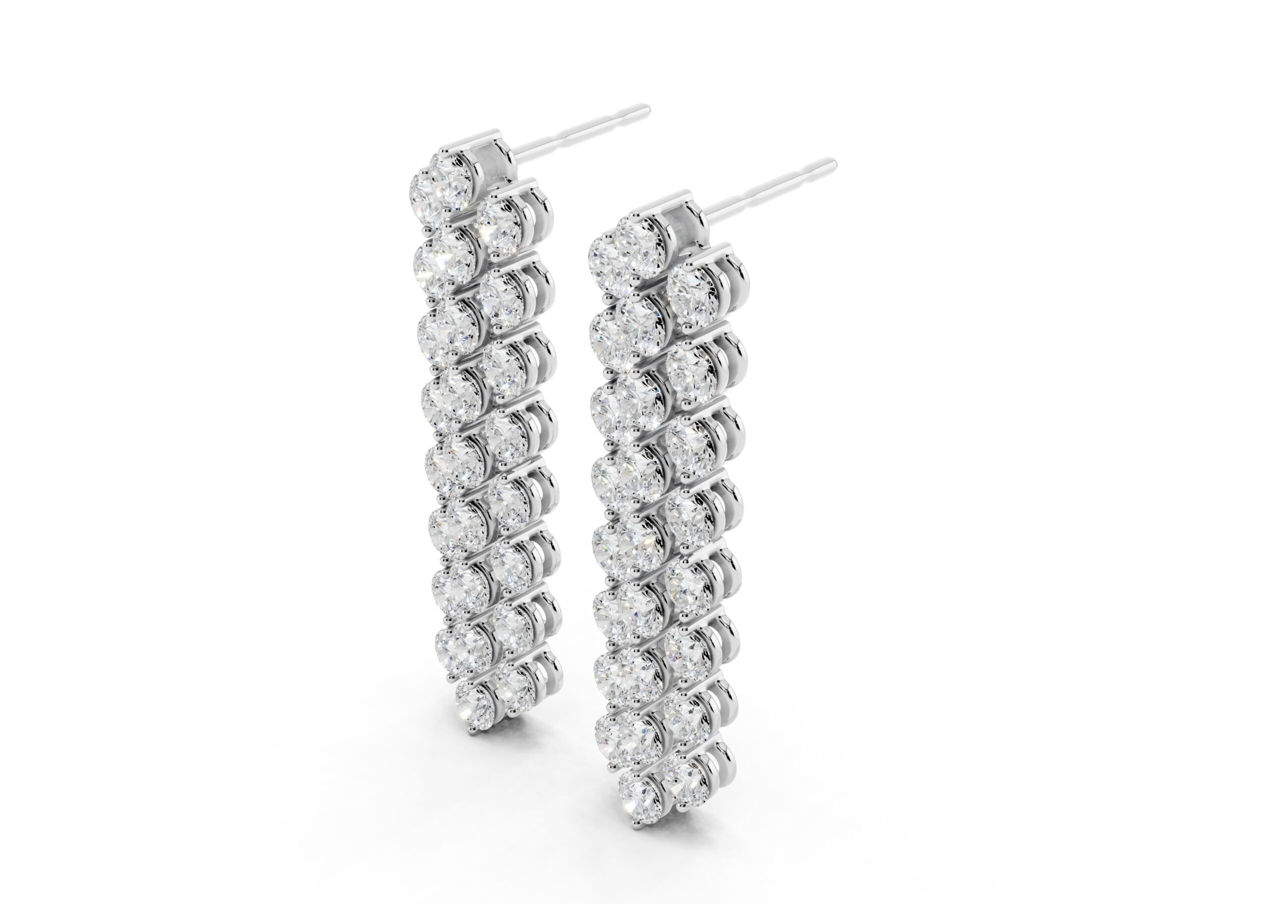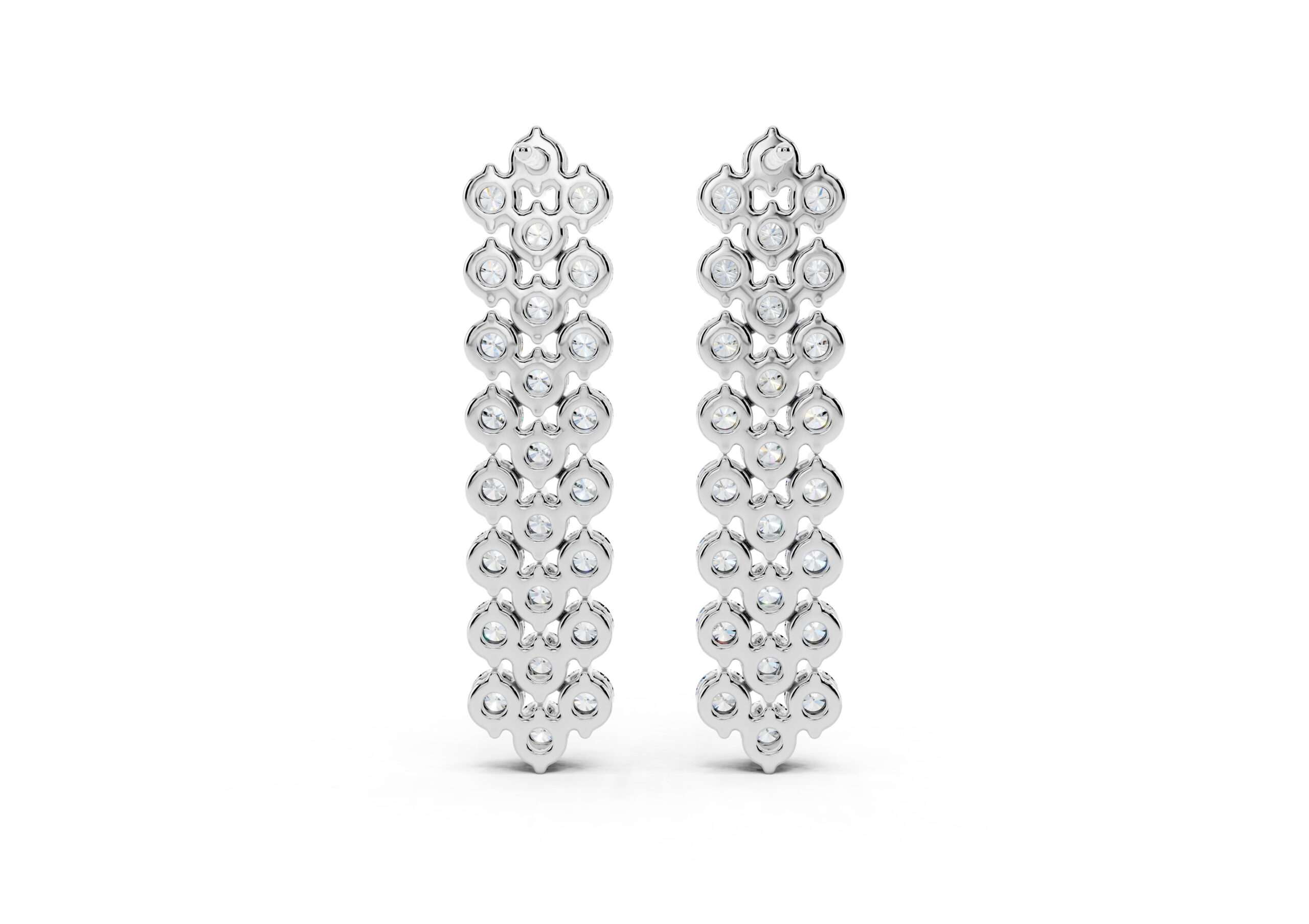 A symphony of perfectly matched round diamonds is arranged in seamless vertical tiers, forming an elegant column that drapes the ear in uninterrupted light. Each stone is set with minimal metal for an almost woven effect, allowing brilliance to flow from one row to the next. The result is a statement silhouette—bold in length, refined in detail, and designed to captivate from every angle.