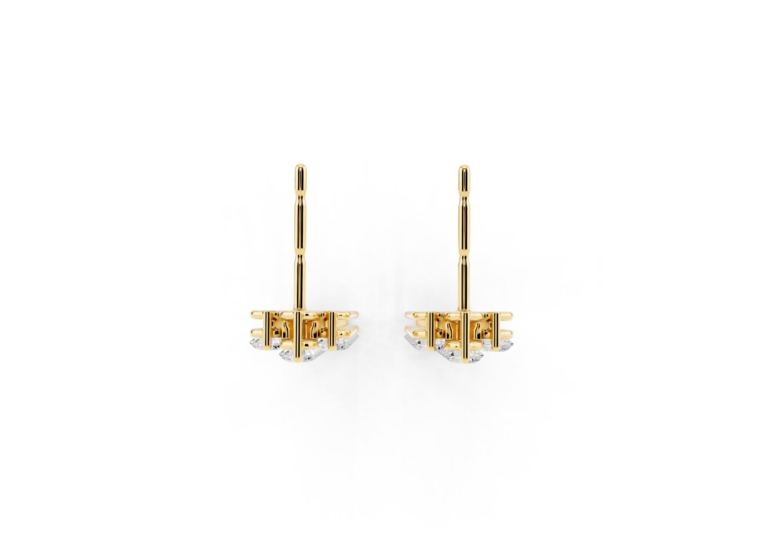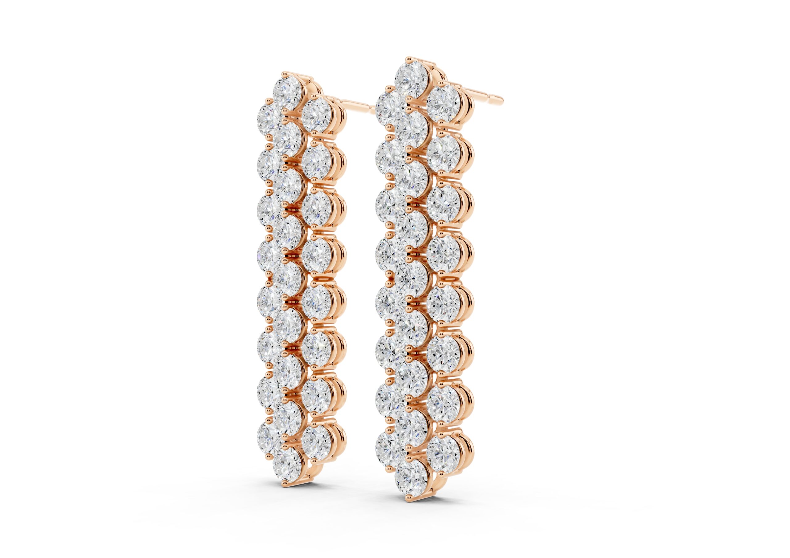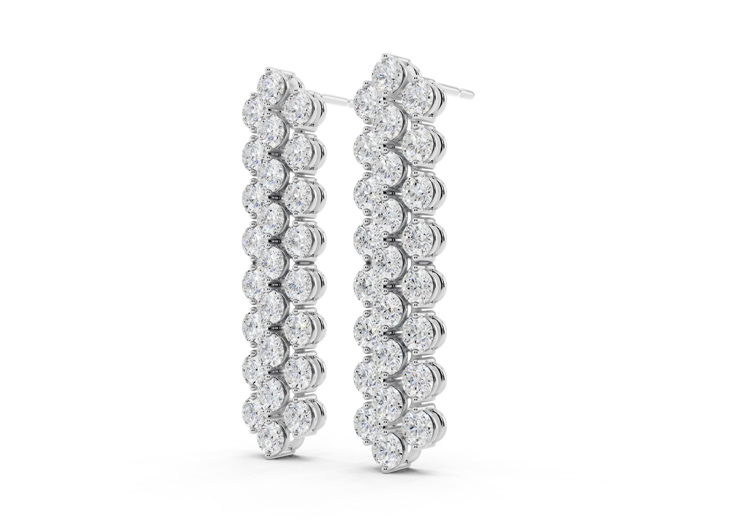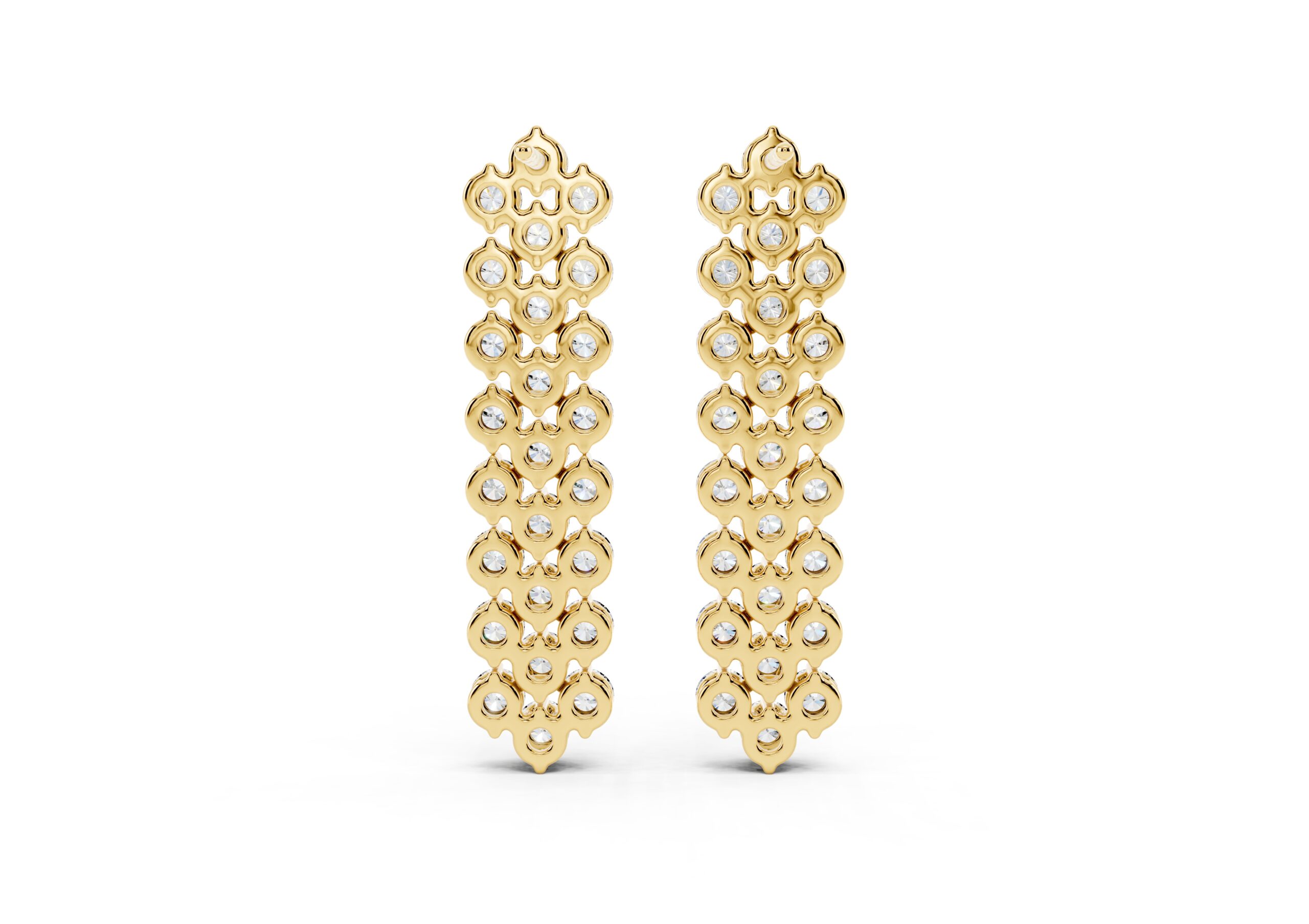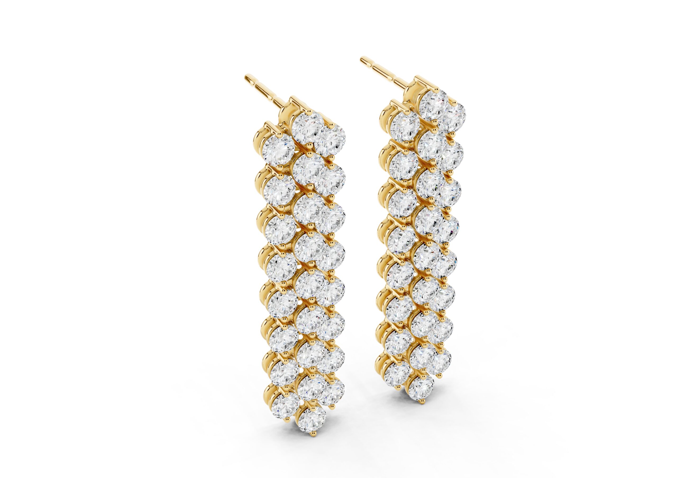 A symphony of perfectly matched round diamonds is arranged in seamless vertical tiers, forming an elegant column that drapes the ear in uninterrupted light. Each stone is set with minimal metal for an almost woven effect, allowing brilliance to flow from one row to the next. The result is a statement silhouette—bold in length, refined in detail, and designed to captivate from every angle.